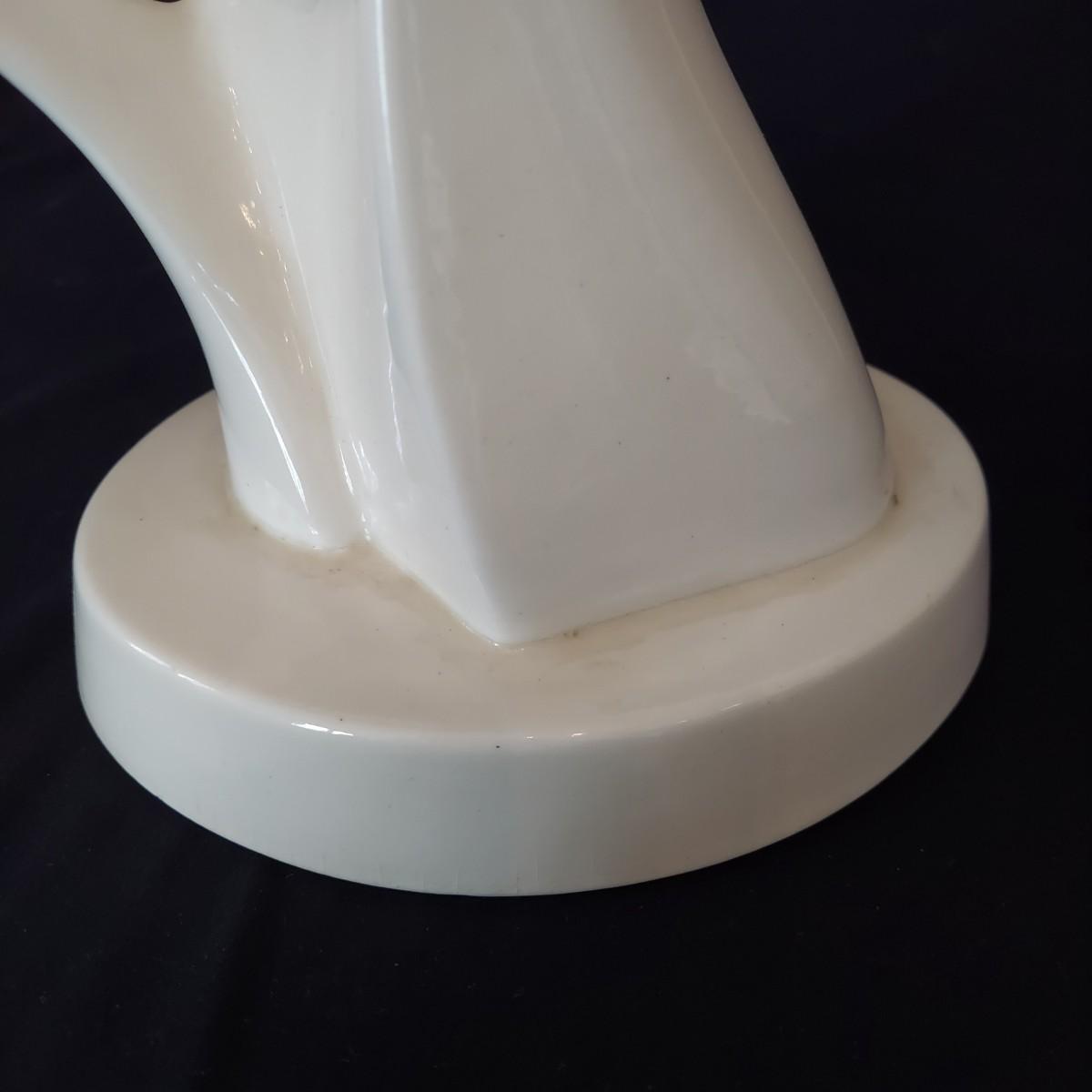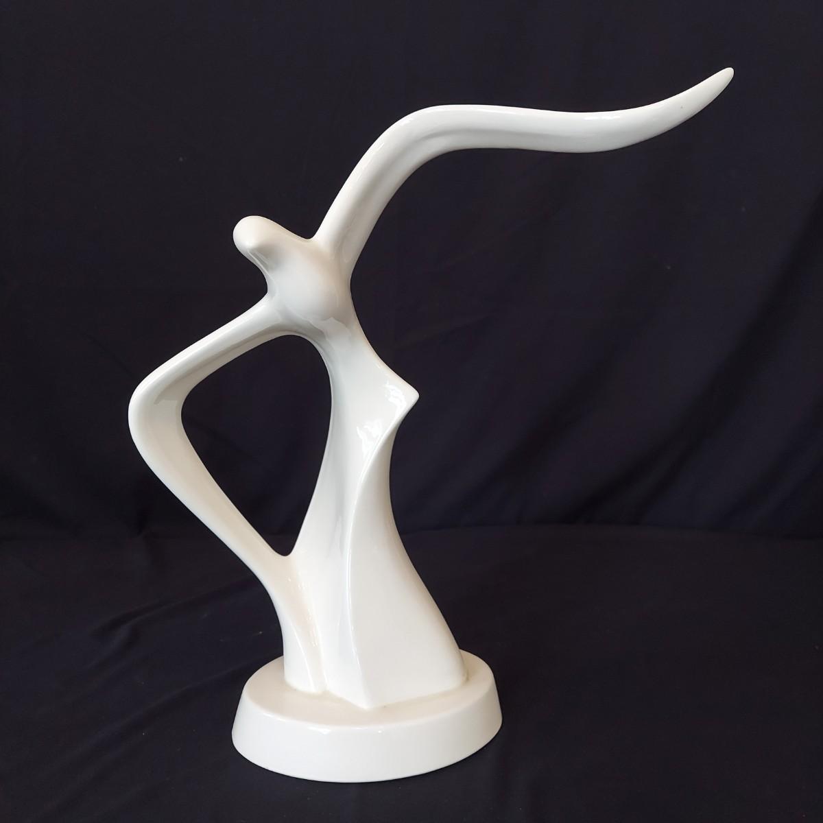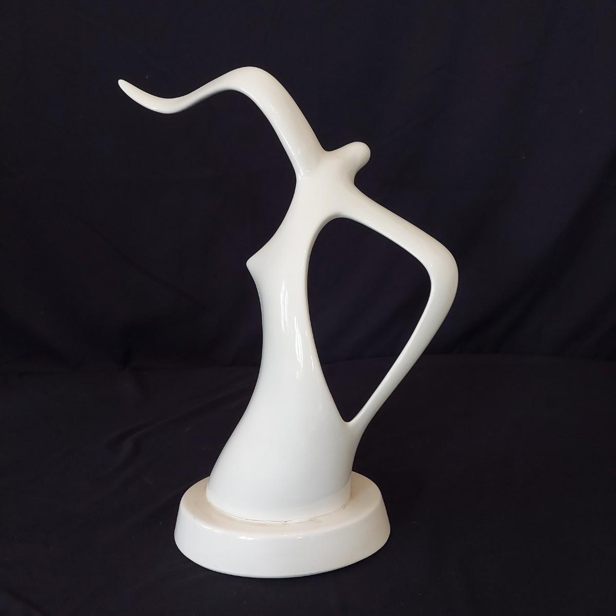 Three white glazed ceramic birds. They have some crazing. Please see photos. Small bird measures approximately 3.5" x 2.5" x 14"H. Medium bird measures approximately 3" x 4.5" x 16". Large bird measures approximately 15" x 5.5" x 16"H. Shipping available. Shipping can be costly. We suggest contacting our preferred local shipping provider, Postage Express, with dimensions and getting an estimate before bidding: (828) 670-5501or postageexpress@yahoo.com.