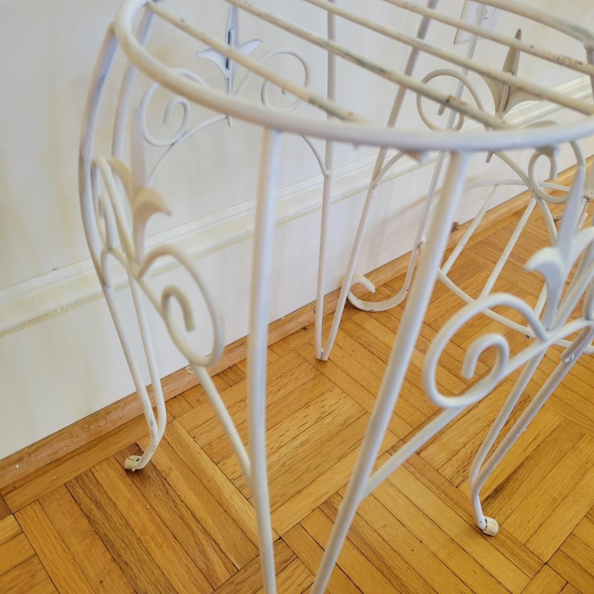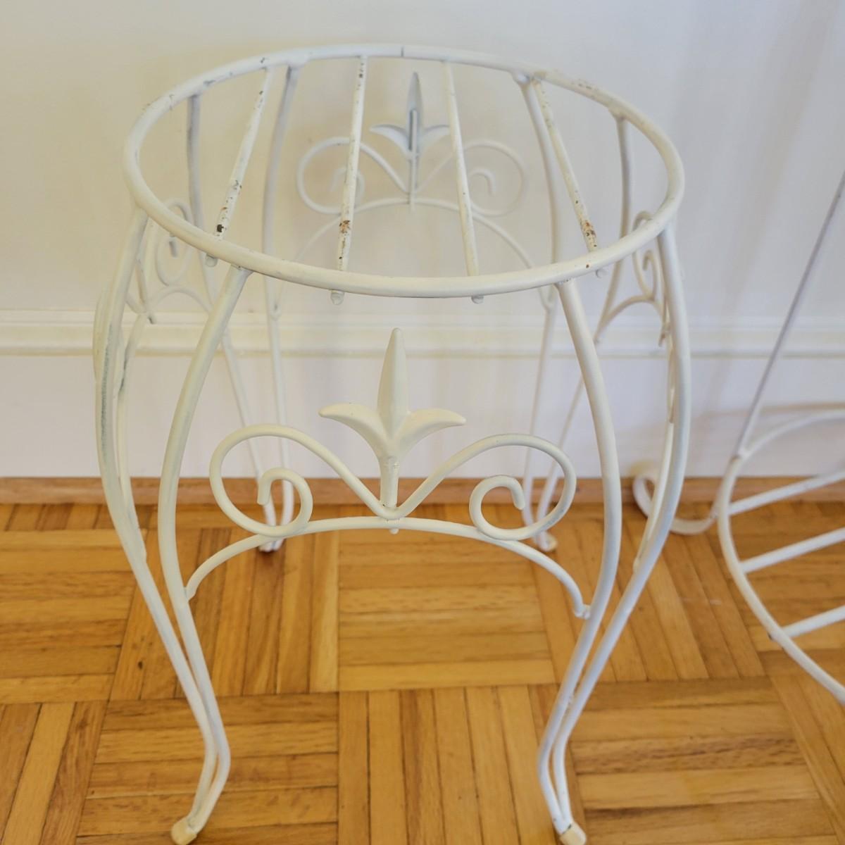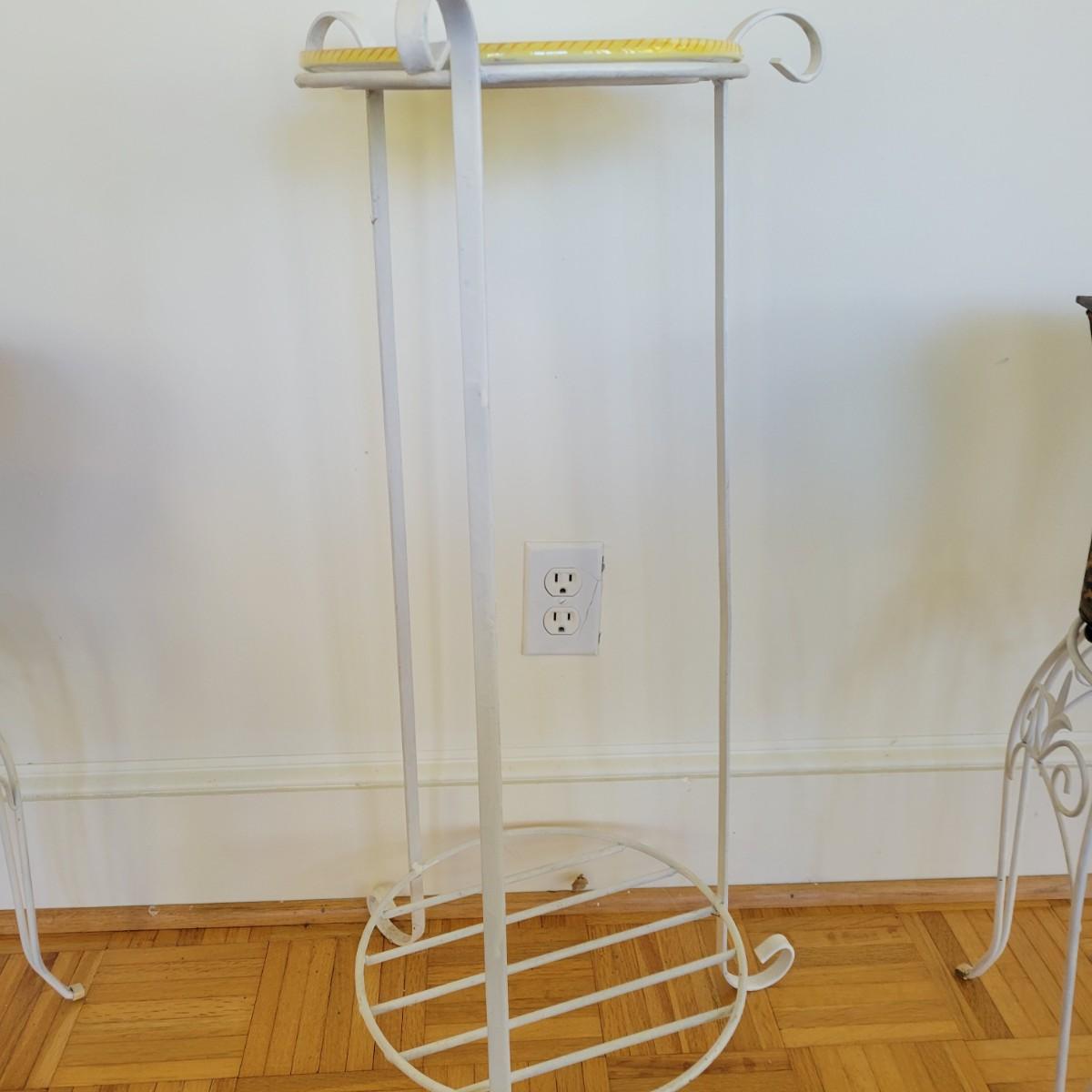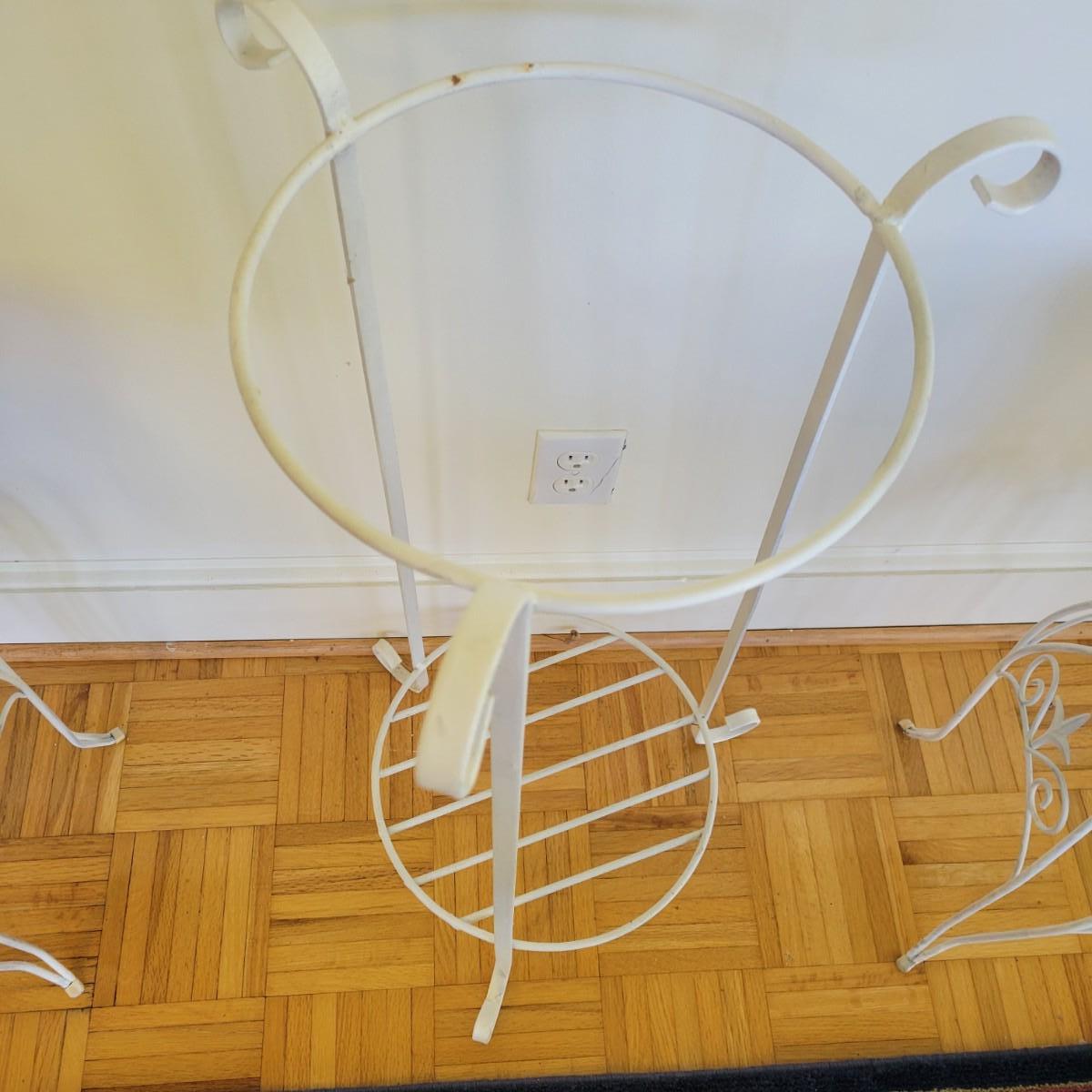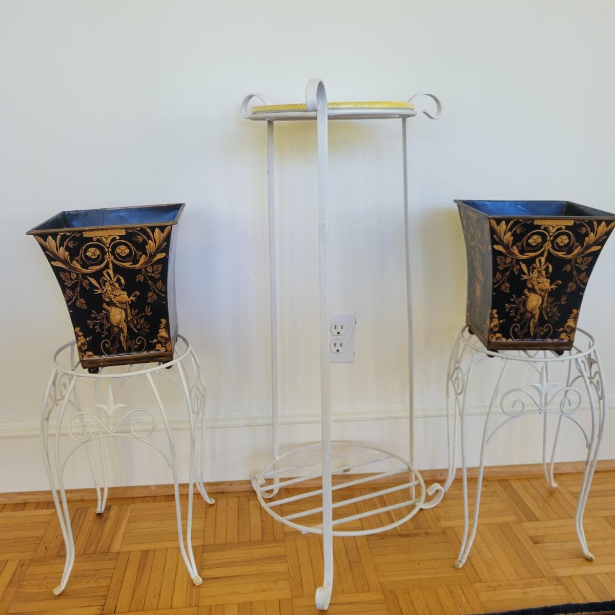 A set of three white, wrought-iron plant stands and two metal planters in good condition. The plant stands do have some minor chipped paint. Two of the plant stands and the planters are matching and the third is taller and narrow. The tall stand also has a hand painted ceramic top made in Italy that does have a notable crack. Largest stand measures approximately 14" x 32". Local pickup only