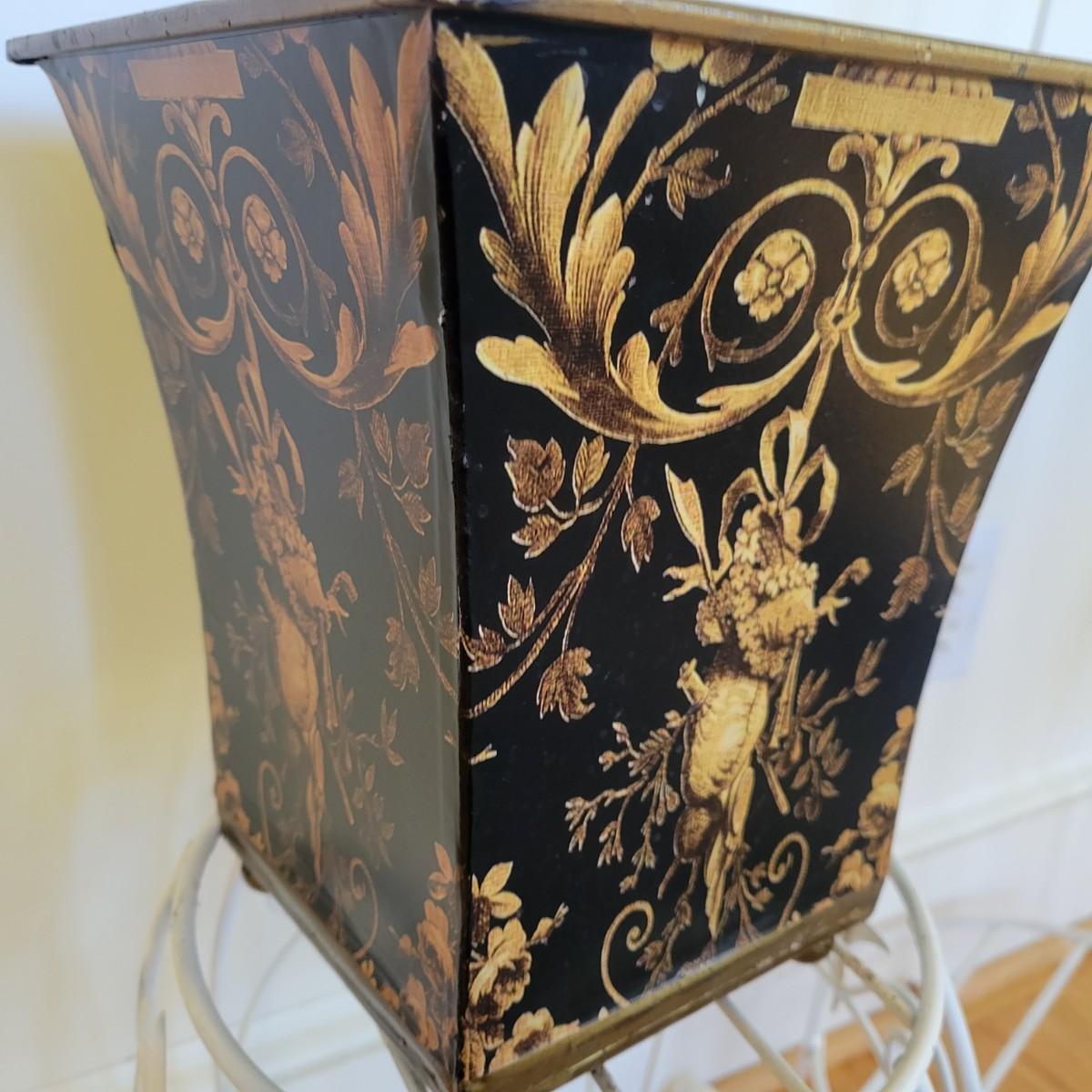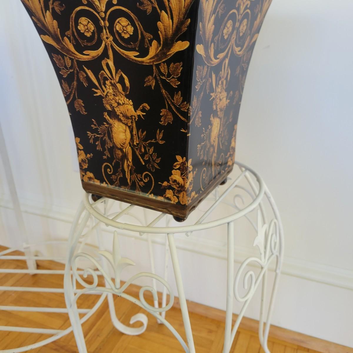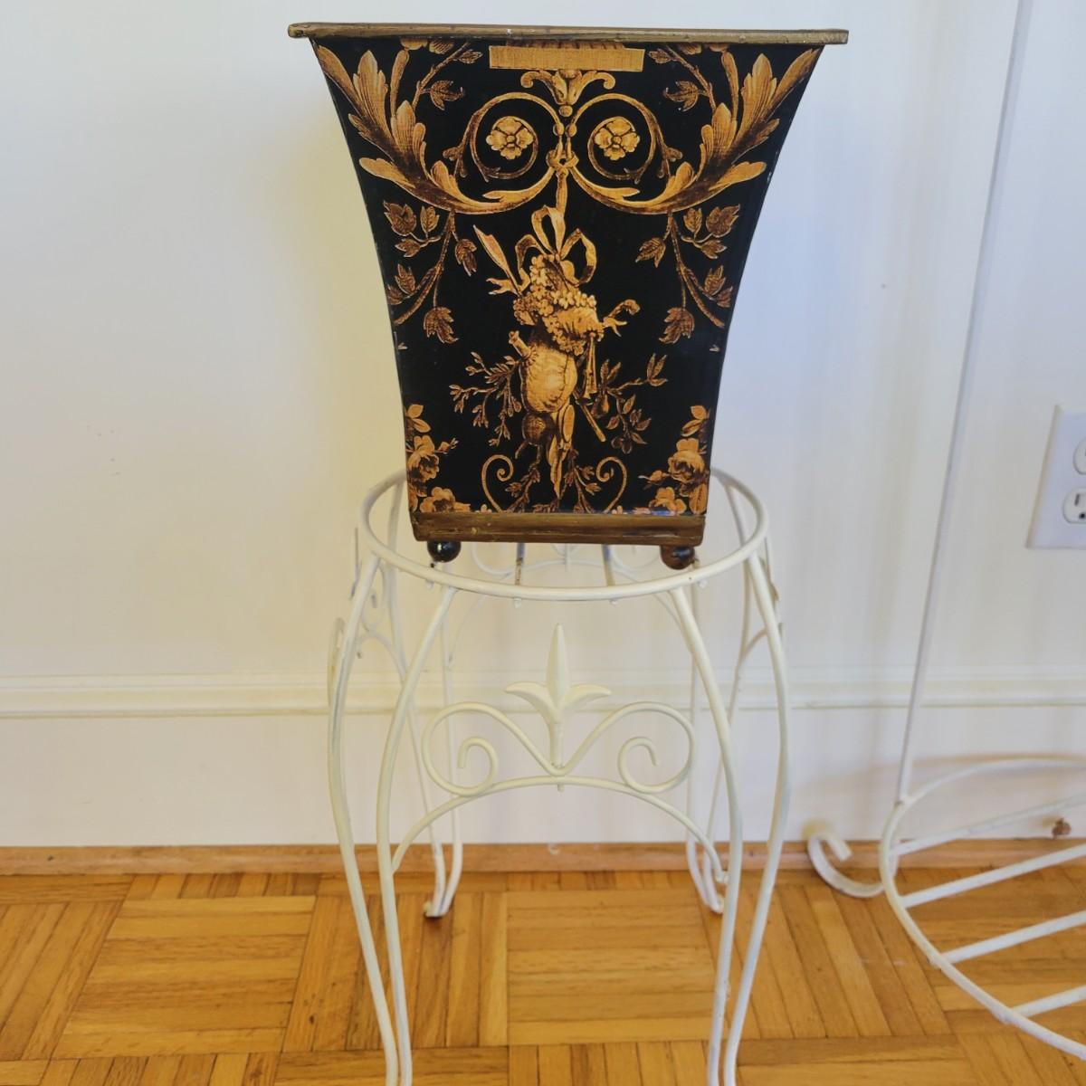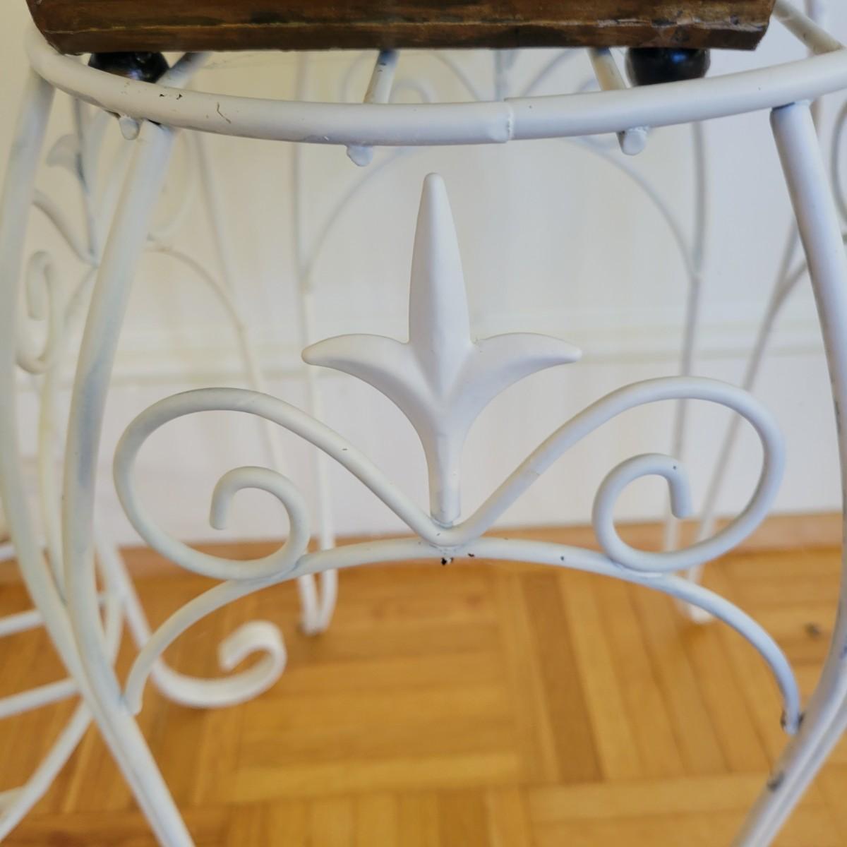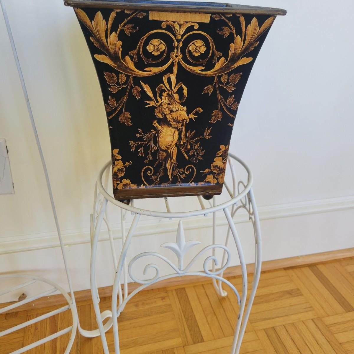 A set of three white, wrought-iron plant stands and two metal planters in good condition. The plant stands do have some minor chipped paint. Two of the plant stands and the planters are matching and the third is taller and narrow. The tall stand also has a hand painted ceramic top made in Italy that does have a notable crack. Largest stand measures approximately 14" x 32". Local pickup only