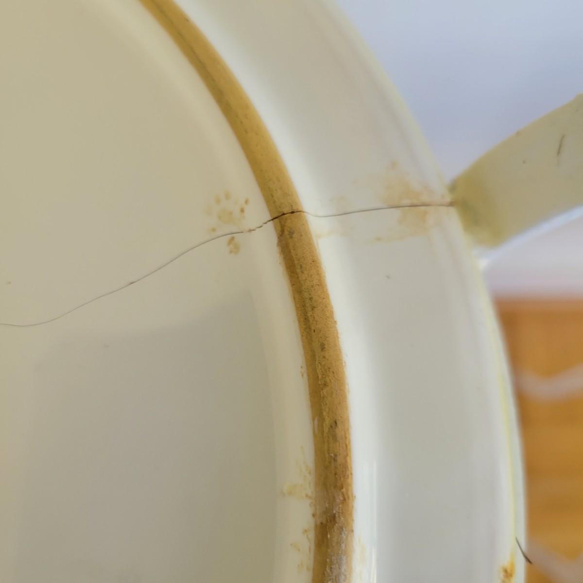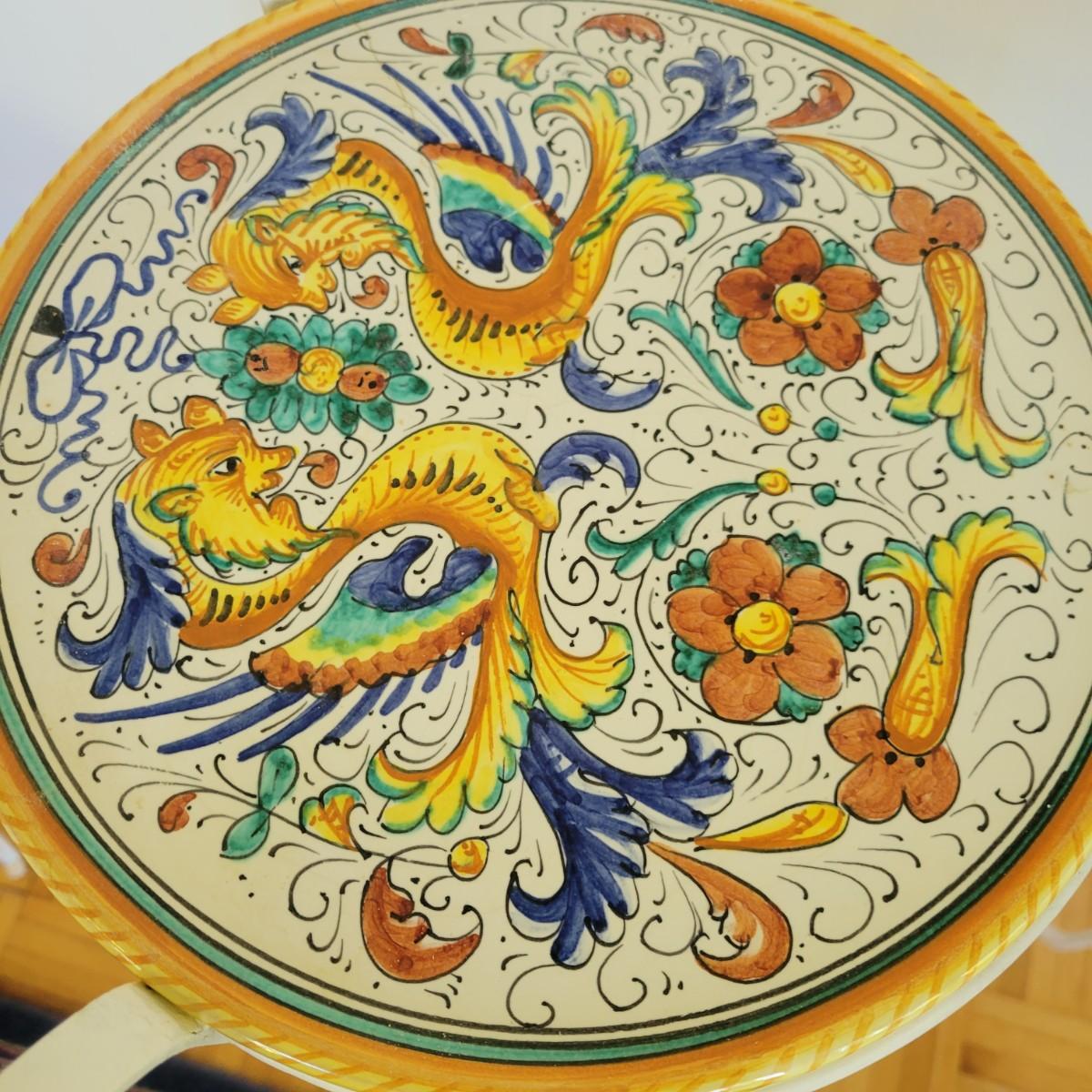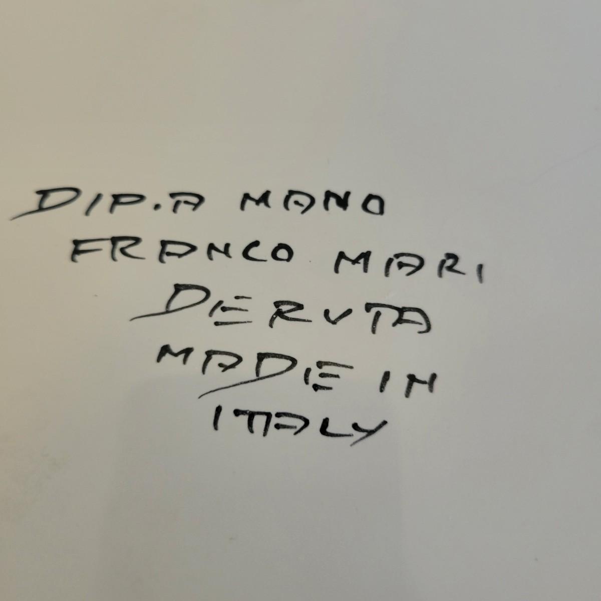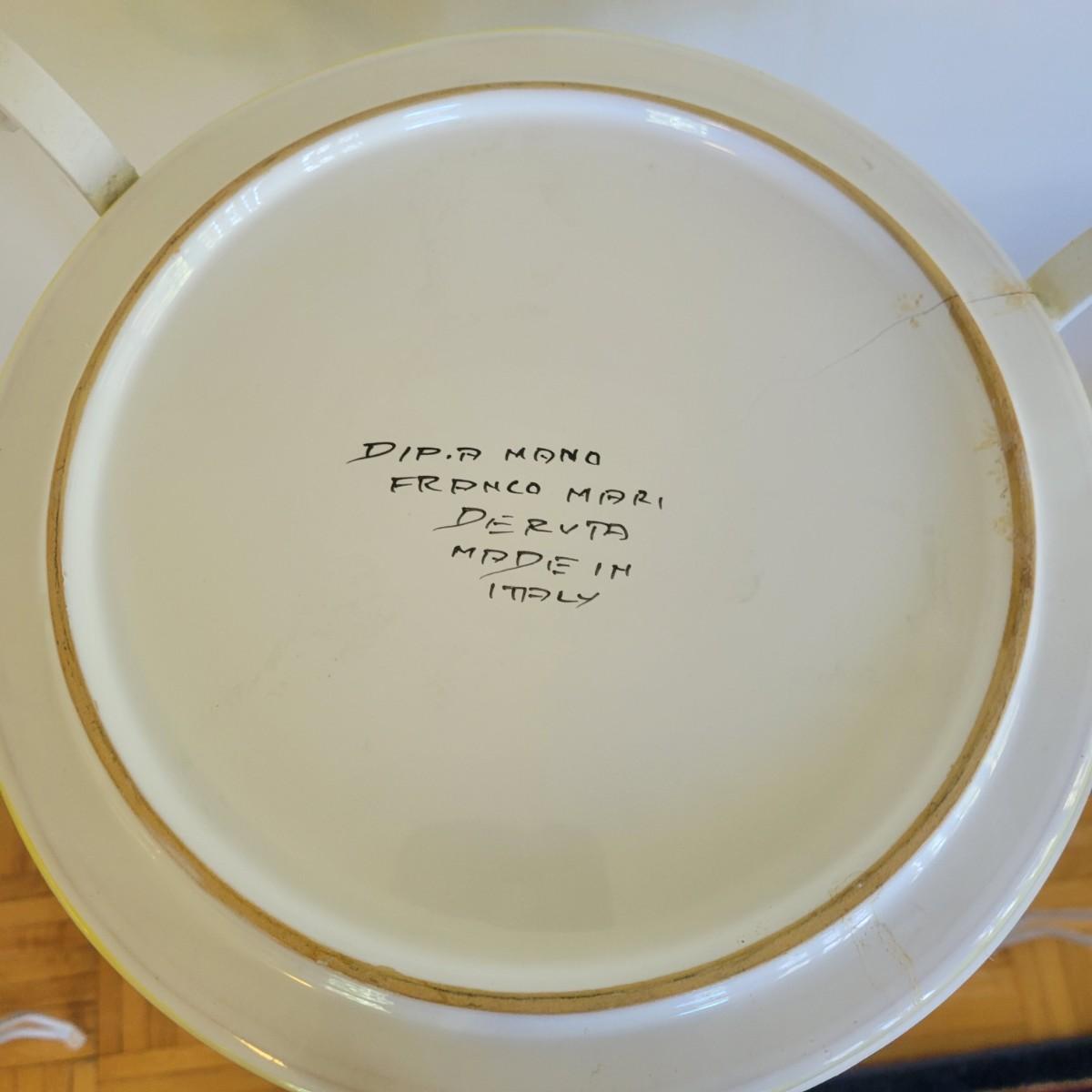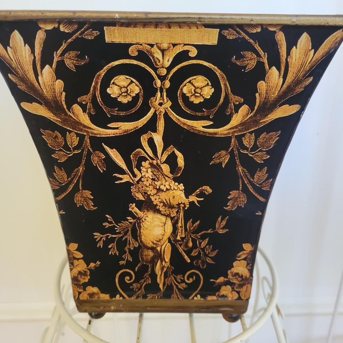 A set of three white, wrought-iron plant stands and two metal planters in good condition. The plant stands do have some minor chipped paint. Two of the plant stands and the planters are matching and the third is taller and narrow. The tall stand also has a hand painted ceramic top made in Italy that does have a notable crack. Largest stand measures approximately 14" x 32". Local pickup only