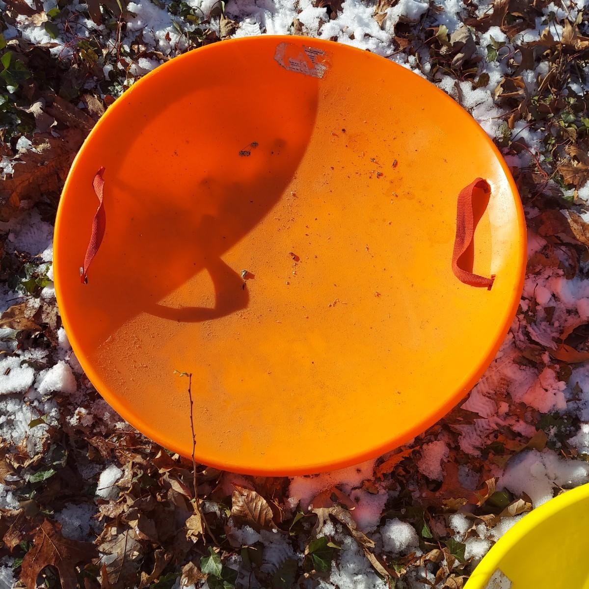 Lot includes an inflatable raft style two person sled with two plastic saucer style disc sleds. They each measure 26"D across. The inflatable sled appears to be unopened in original packaging. Local Pickup Only