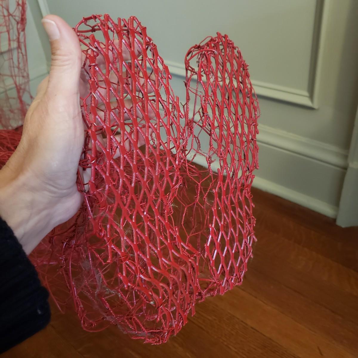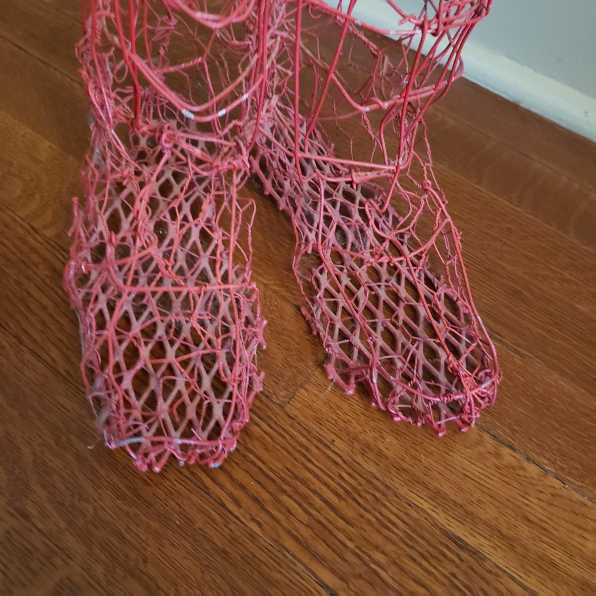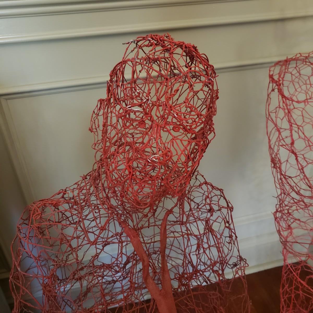 The tallest gentleman measures 9" x 12" x 45"H. The chicken wire has been painted red, with reinforced metal on the bottom of their feet.