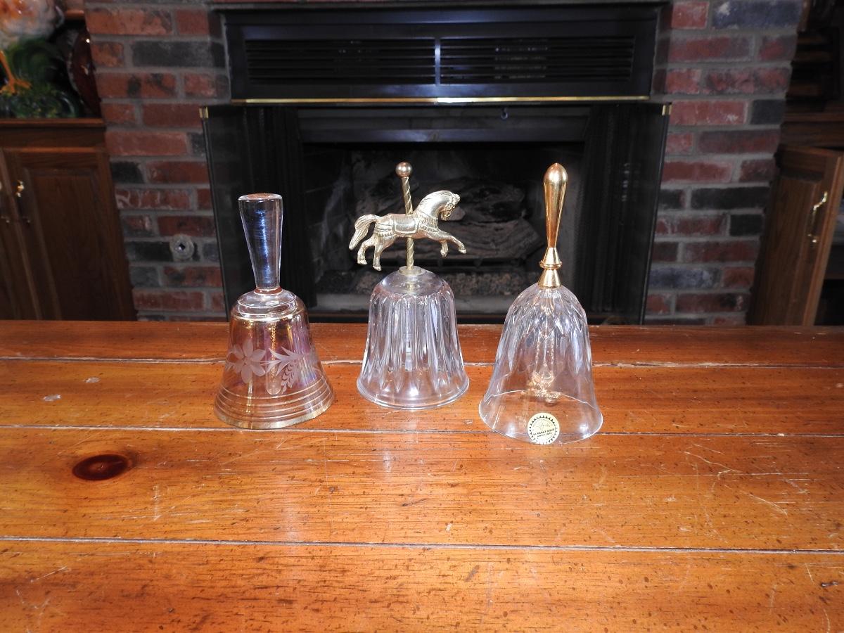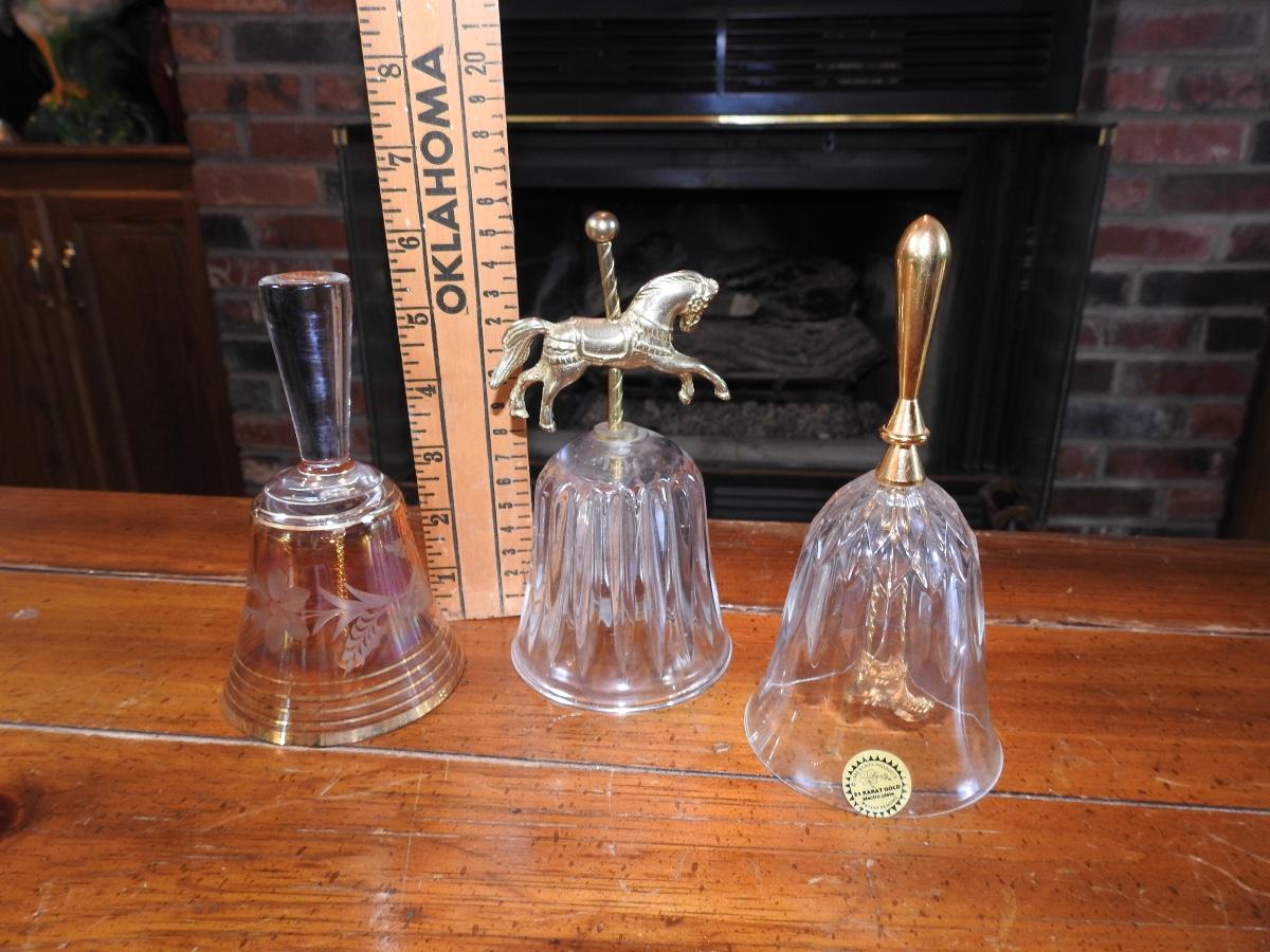 From left to right. Vintage ruby glass dinner bell. Made in Yugoslavia. Approximately 5 1/2 inches tall. Center- carousel topped bell. Right-Gerity crystal gold plated boot ringer bell. All in good used condition.