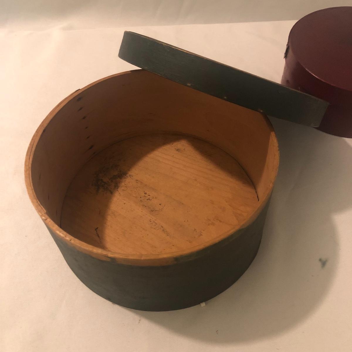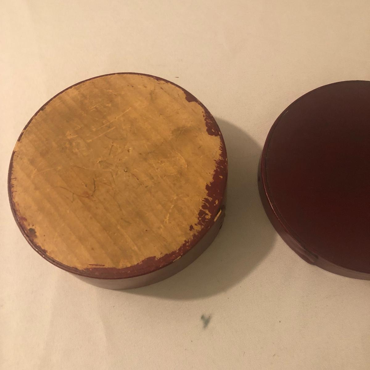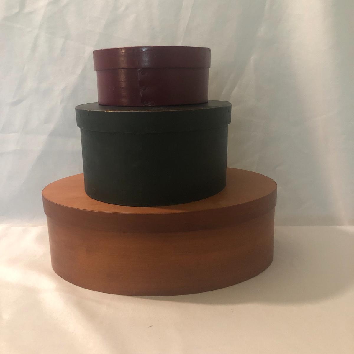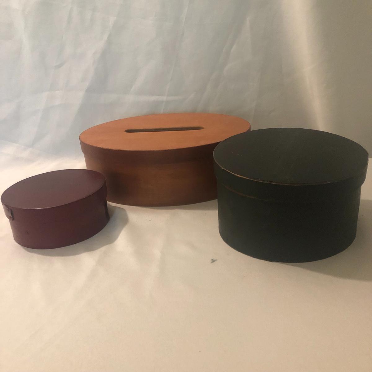 This lot contains three wooden boxes. Dimensions of the tissue box is 12” x 9”. The black box is 8” diameter and the red one 6”. Shipping Available. All have fitted lids. Shipping Available.