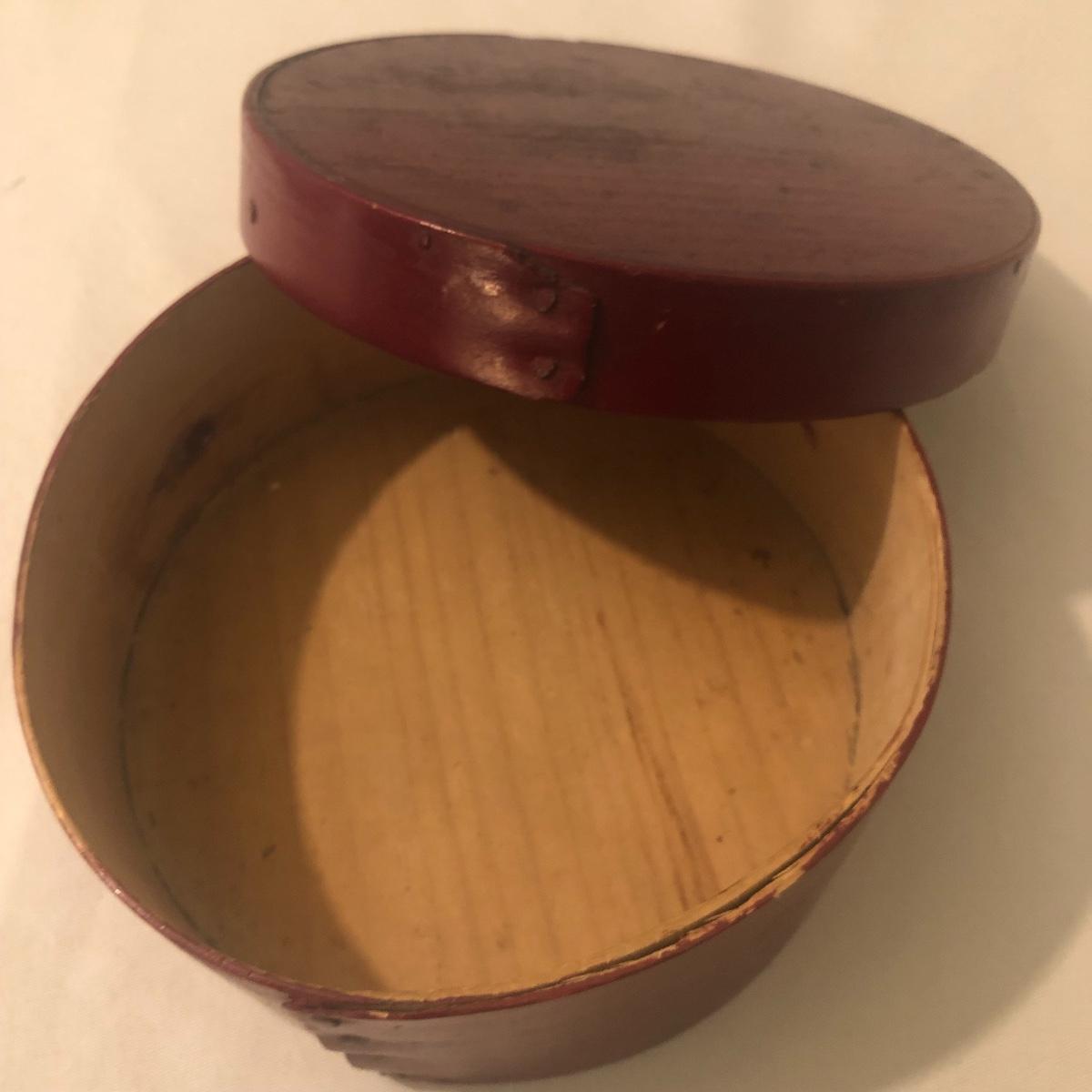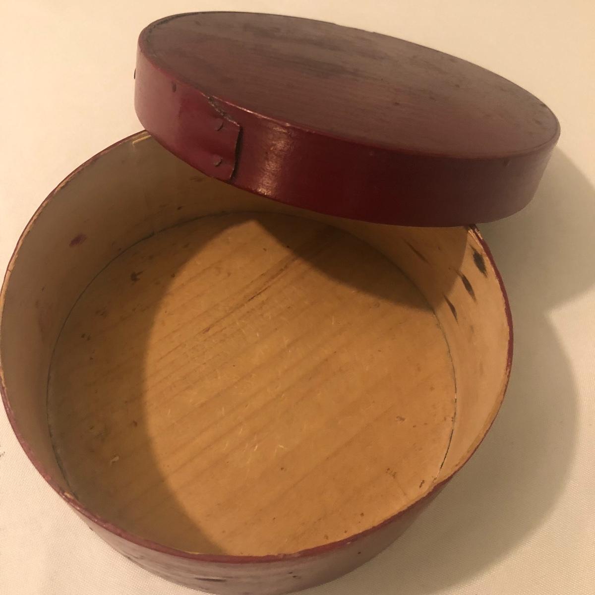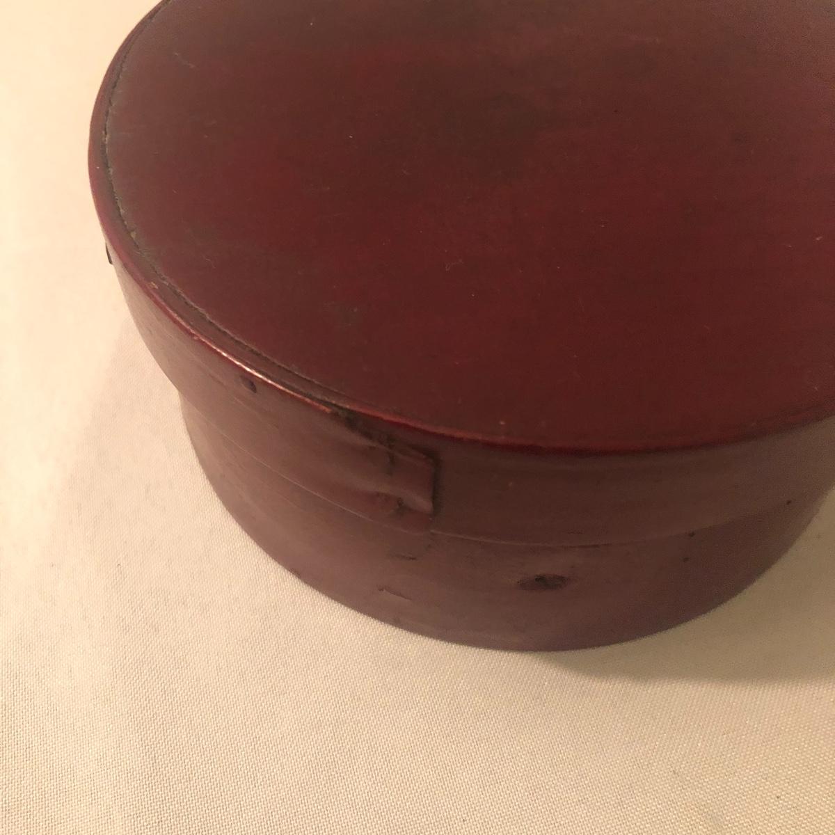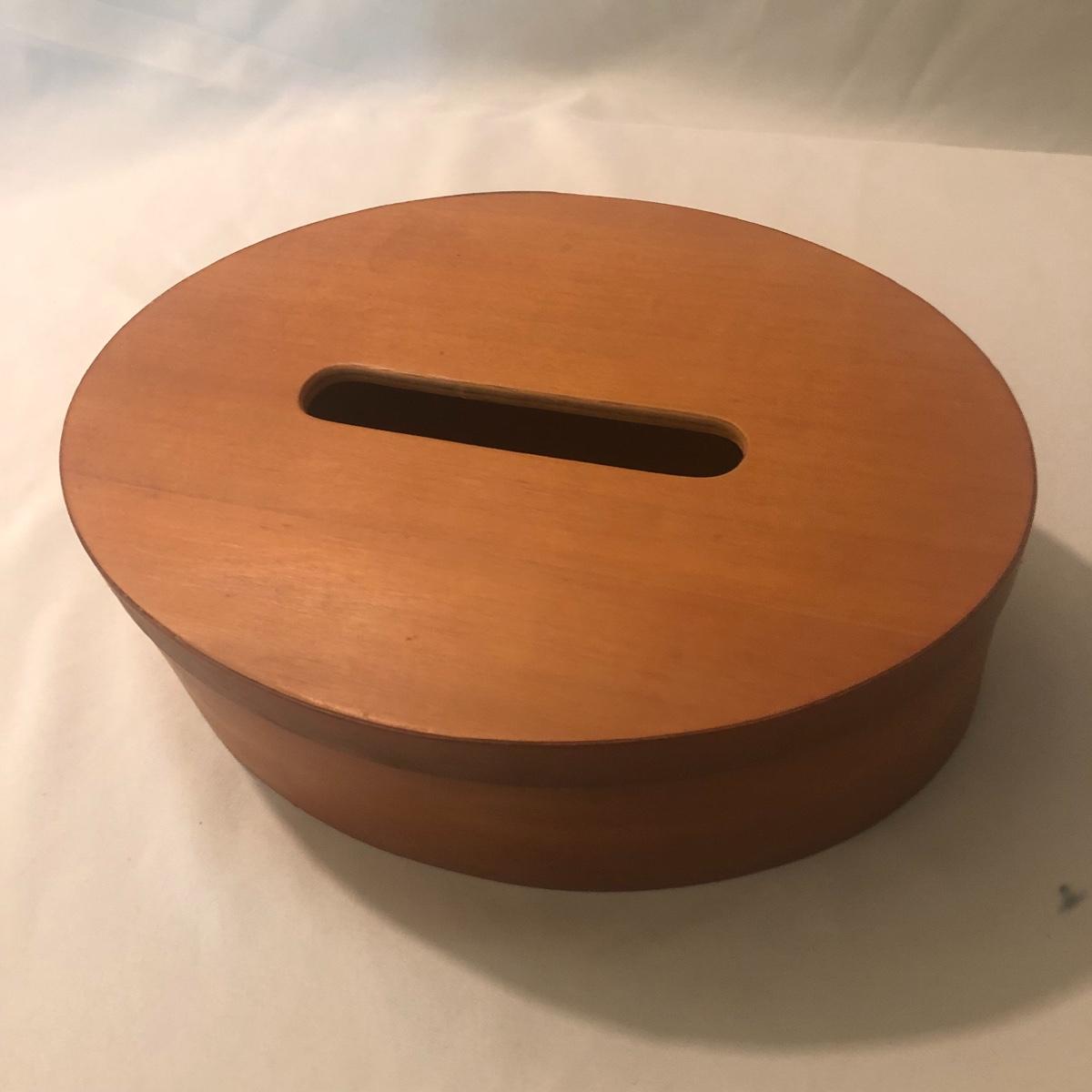 This lot contains three wooden boxes. Dimensions of the tissue box is 12” x 9”. The black box is 8” diameter and the red one 6”. Shipping Available. All have fitted lids. Shipping Available.