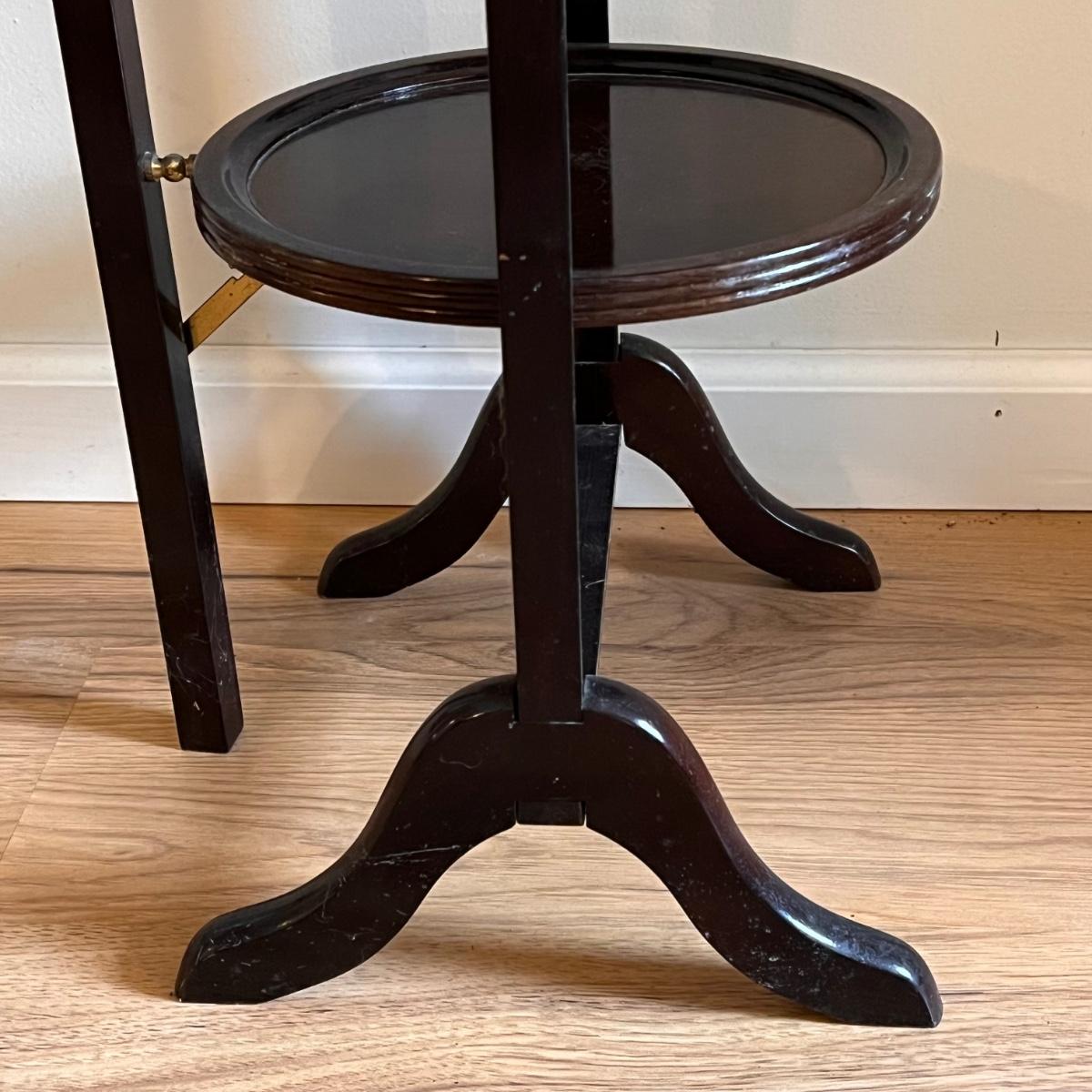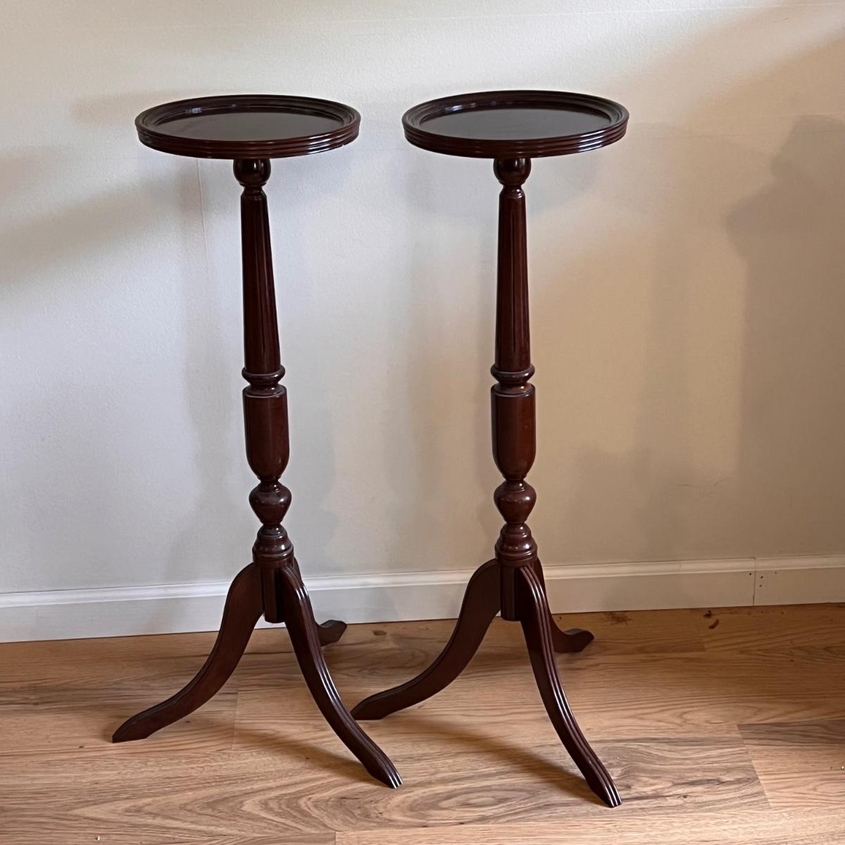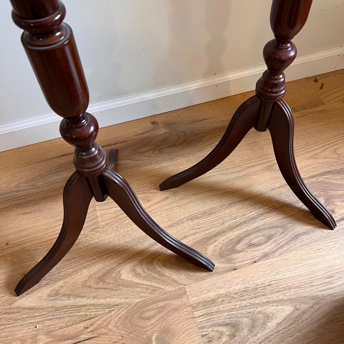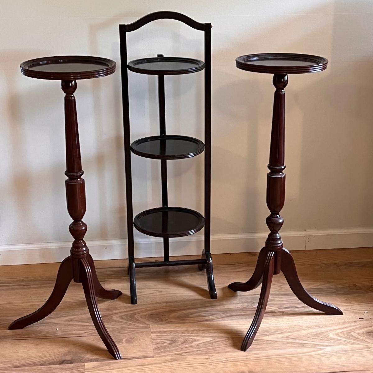 Lot includes three reproduction Victorian style side tables. There are two matching Bombay Company pedestal side tables on a tripod leg and a three tier shelf in the style of a Victorian cake stand. This piece has a loose wooden handle on the top. It is the largest and measures 12” x 39”H. Local pickup only.