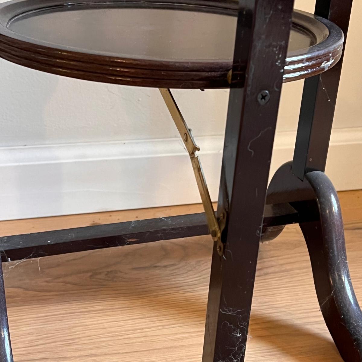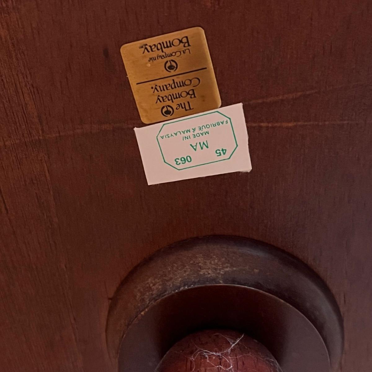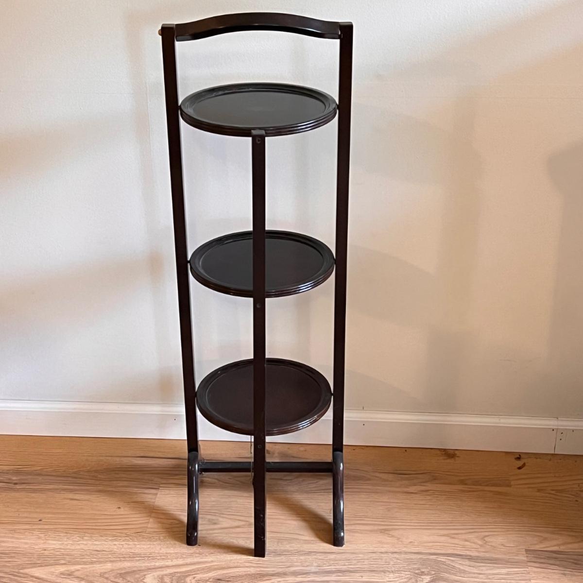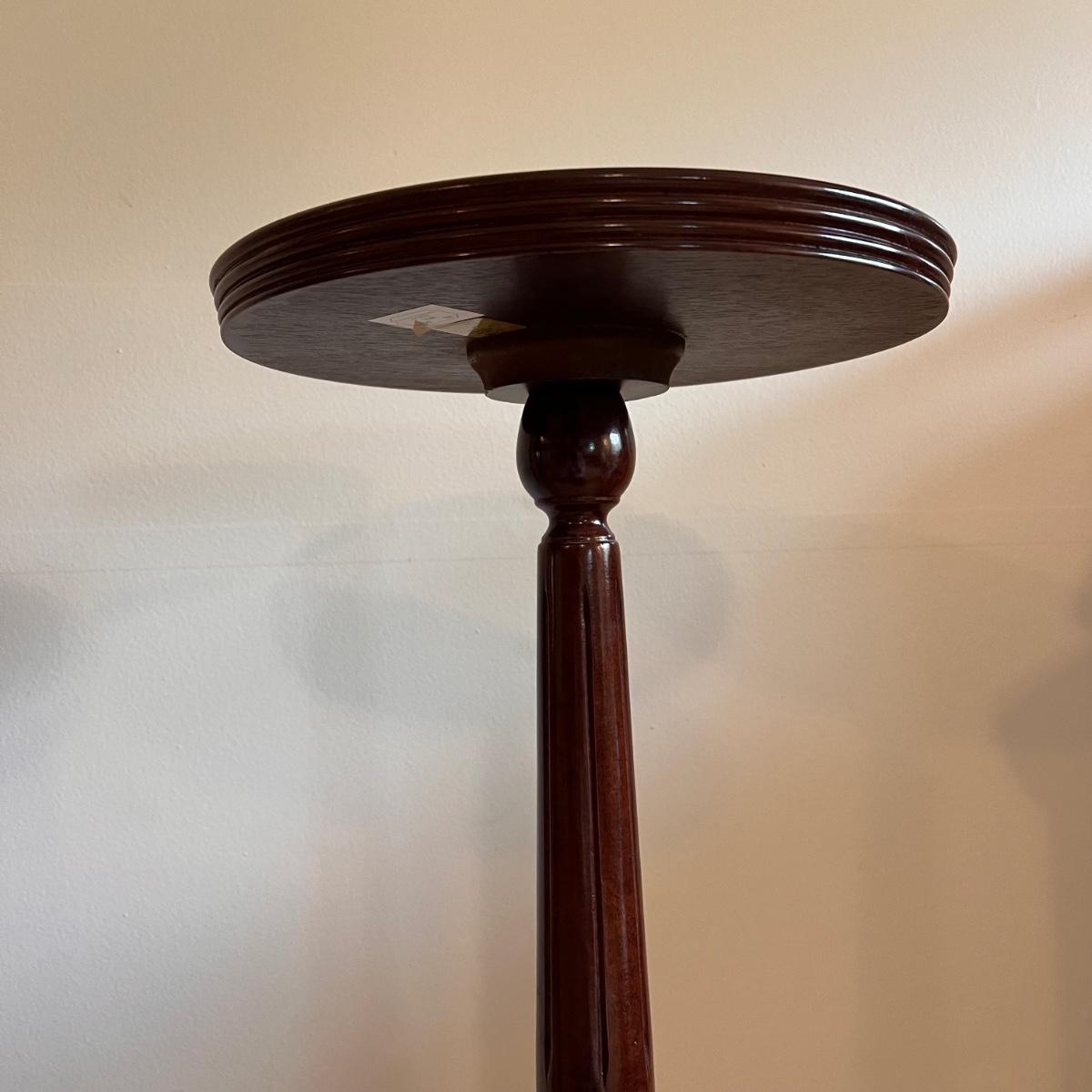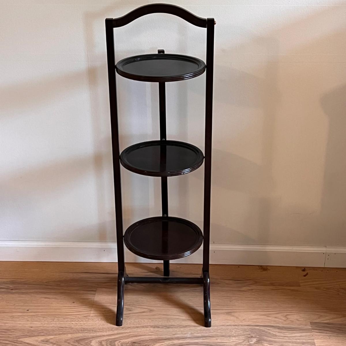 Lot includes three reproduction Victorian style side tables. There are two matching Bombay Company pedestal side tables on a tripod leg and a three tier shelf in the style of a Victorian cake stand. This piece has a loose wooden handle on the top. It is the largest and measures 12” x 39”H. Local pickup only.