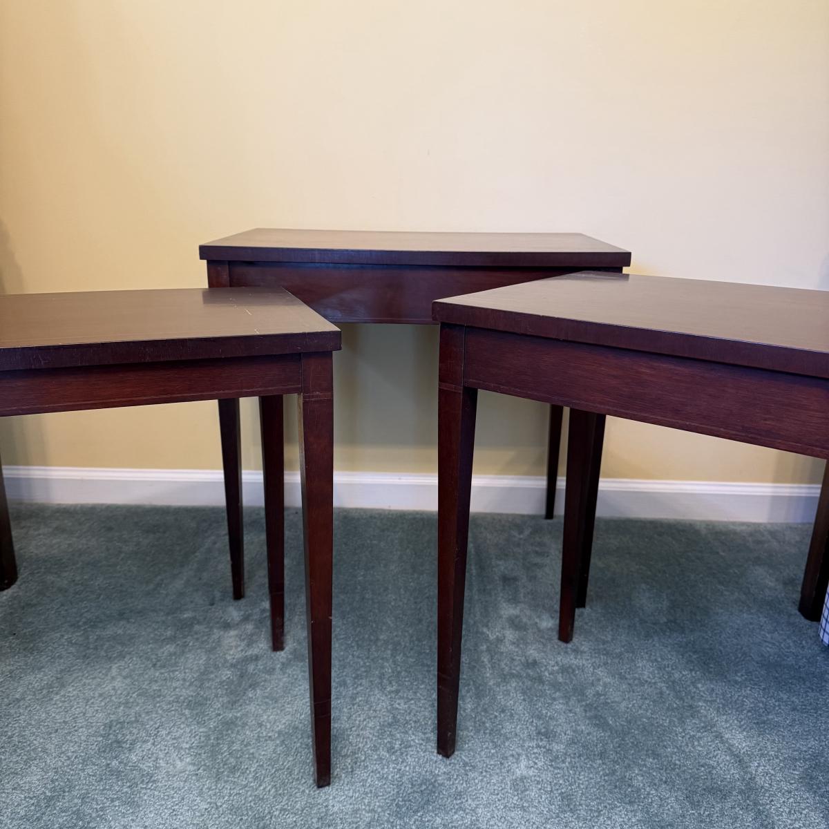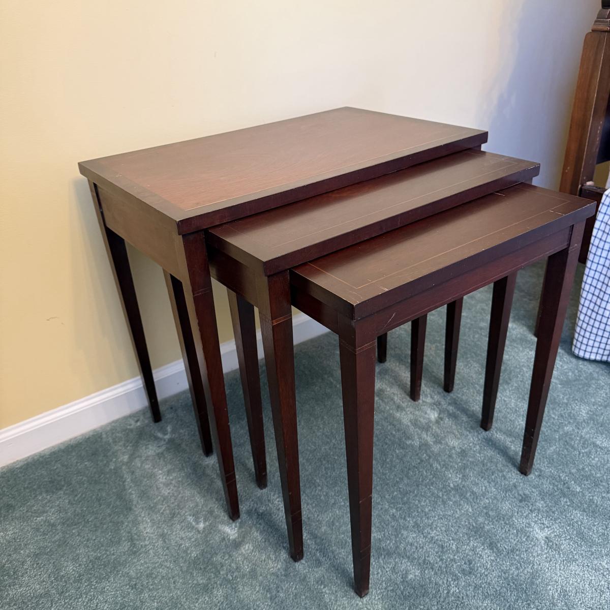 A set of three wooden nesting table with what appears to be inlay on each top and twice on the legs. Tables show wear, but look great for their age! See images. Largest table measures 22” x 14” x 21”H. Local pick up only.