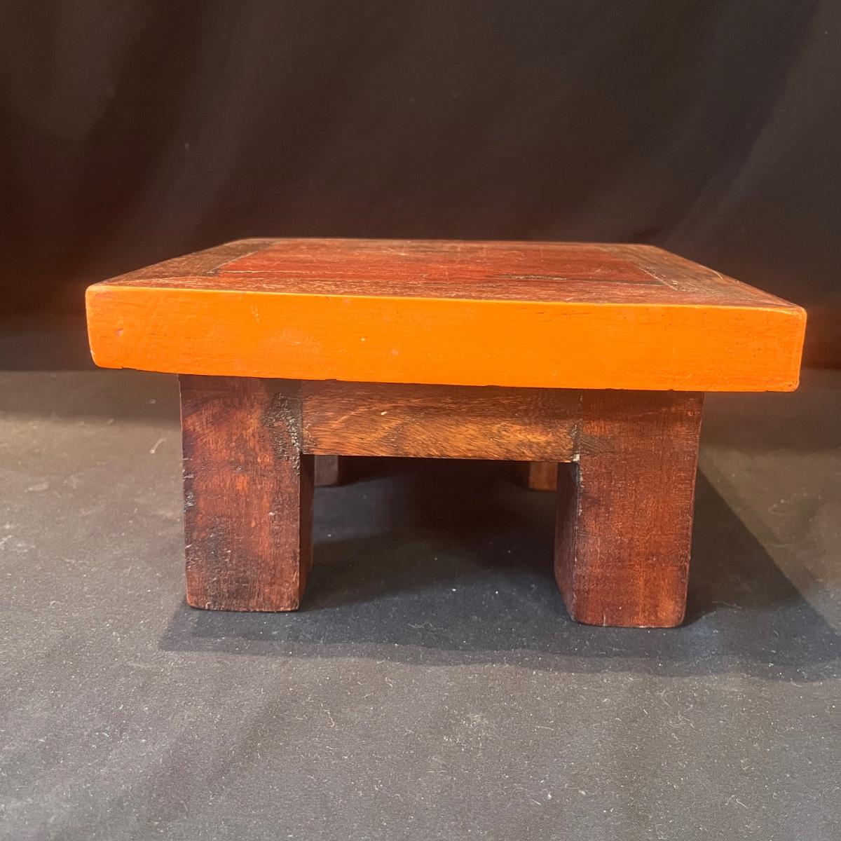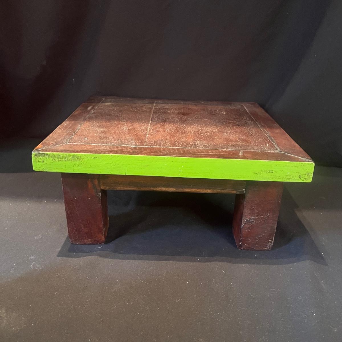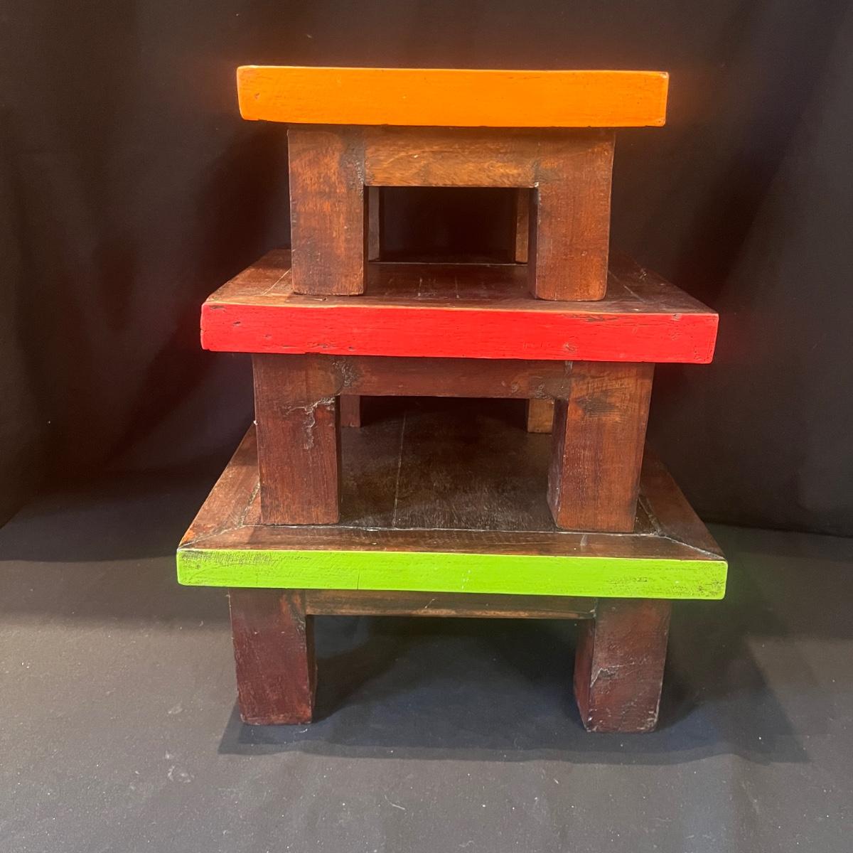 Lot includes three wooden stacking tables each with a different color painted around edge. Largest table measures 12” x 12” x 5.5”H.