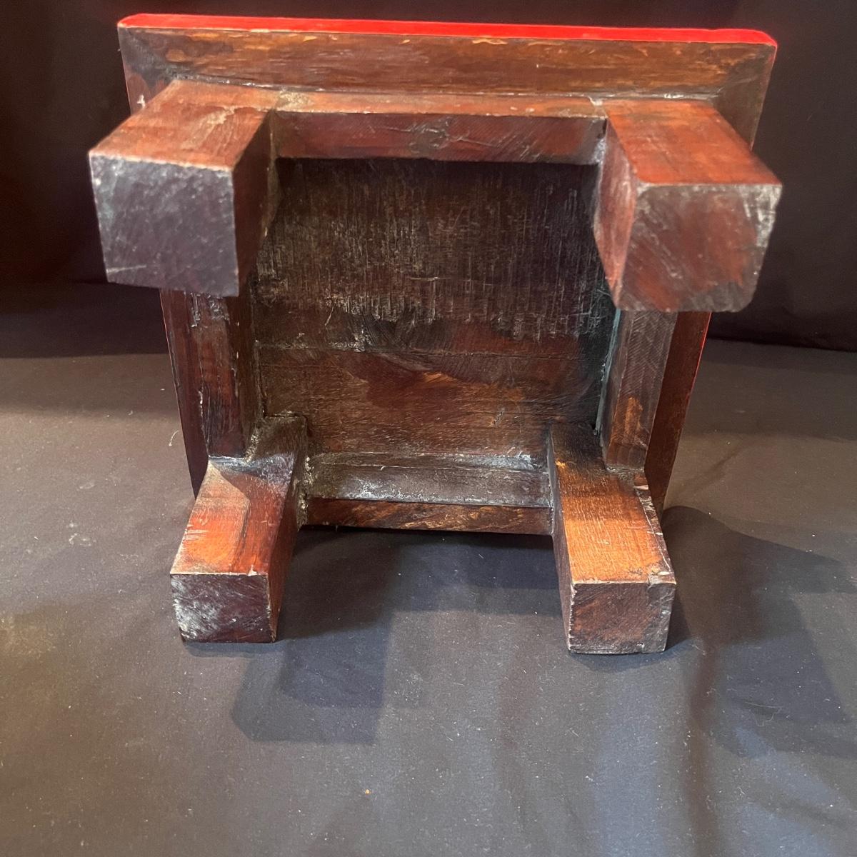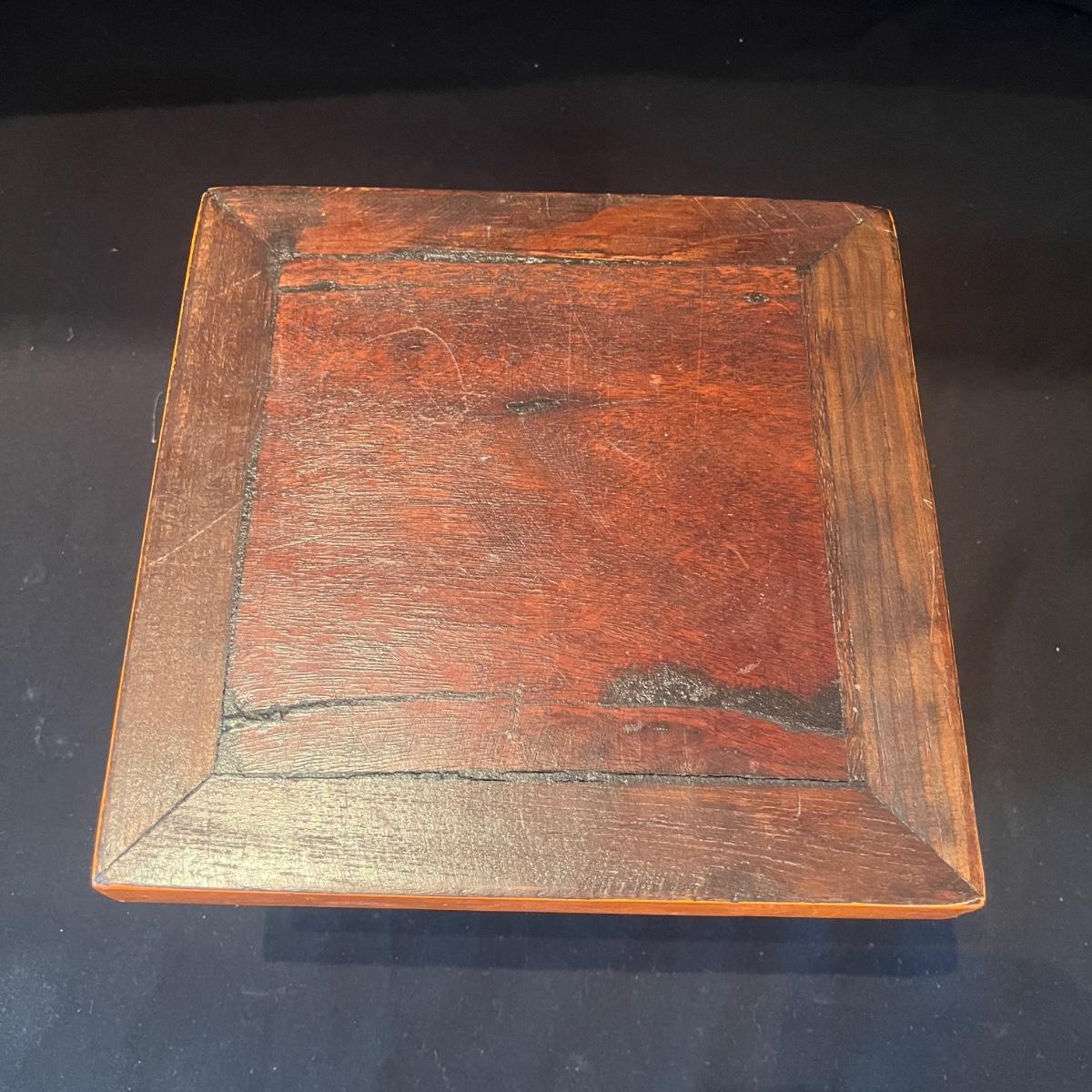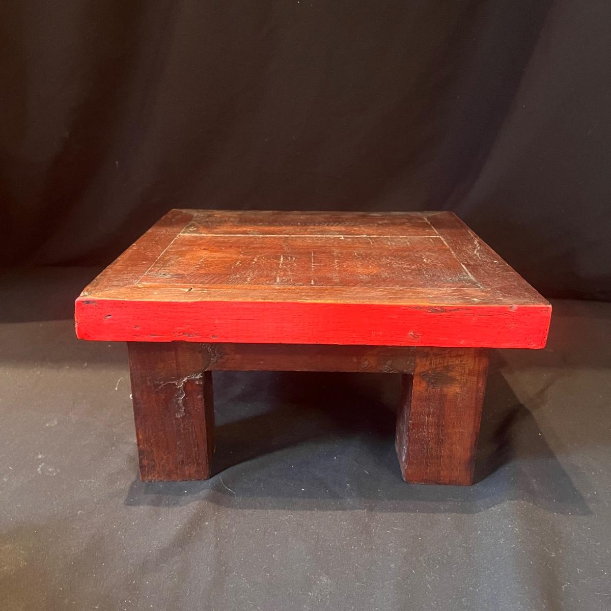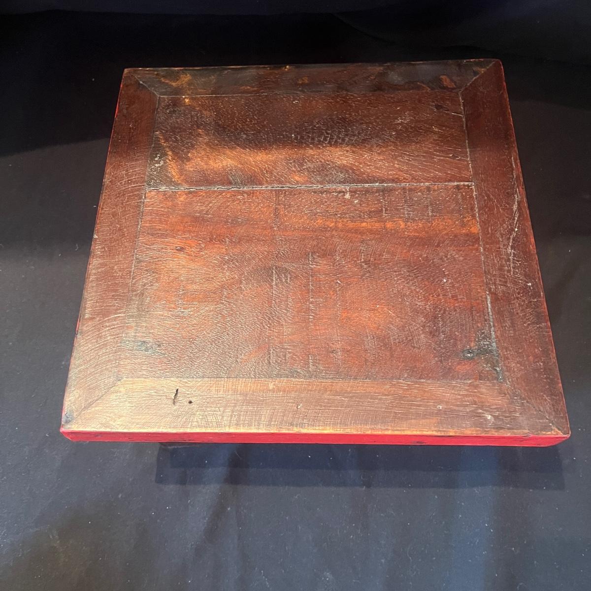 Lot includes three wooden stacking tables each with a different color painted around edge. Largest table measures 12” x 12” x 5.5”H.