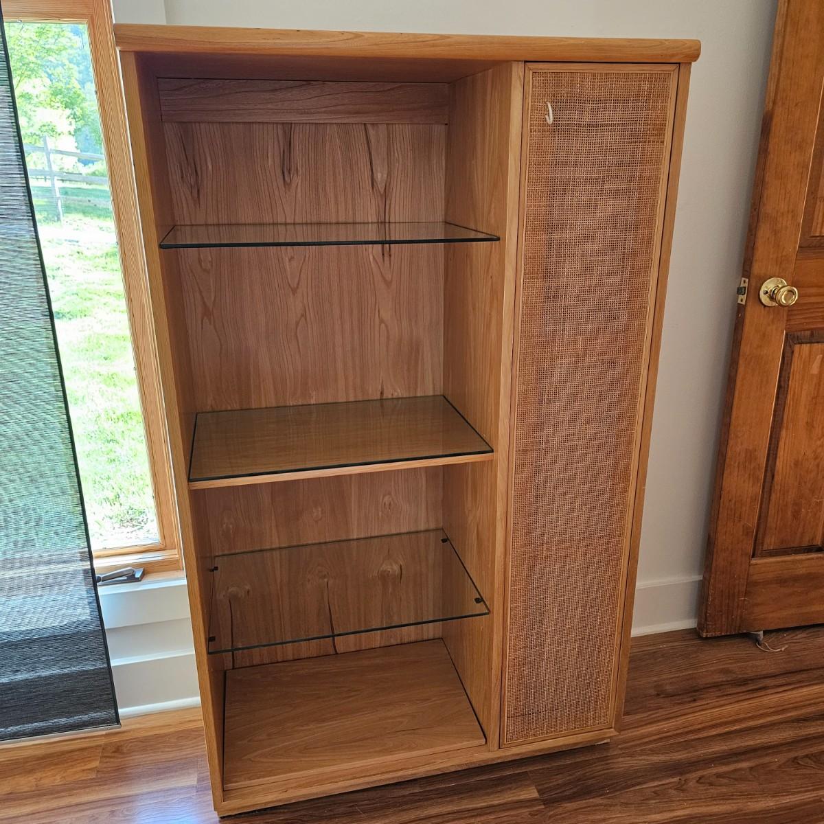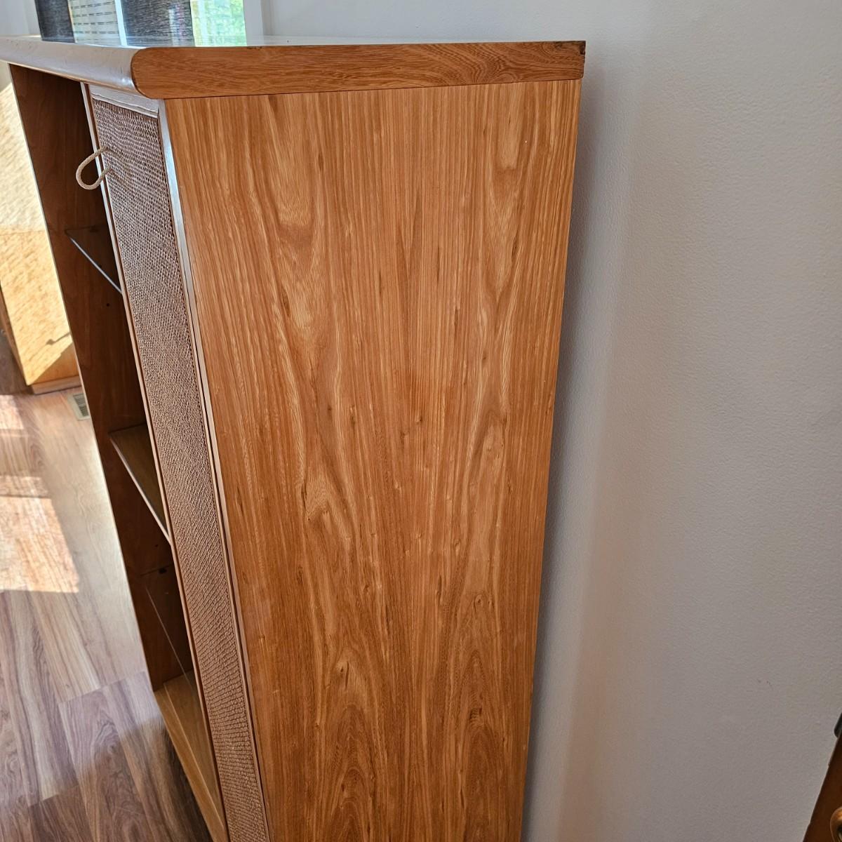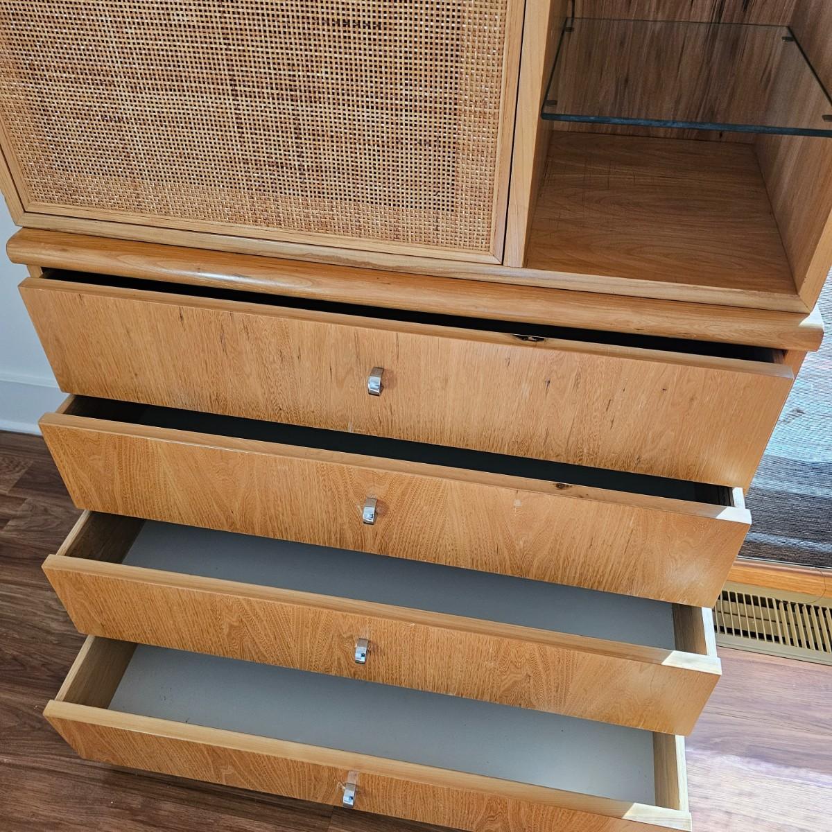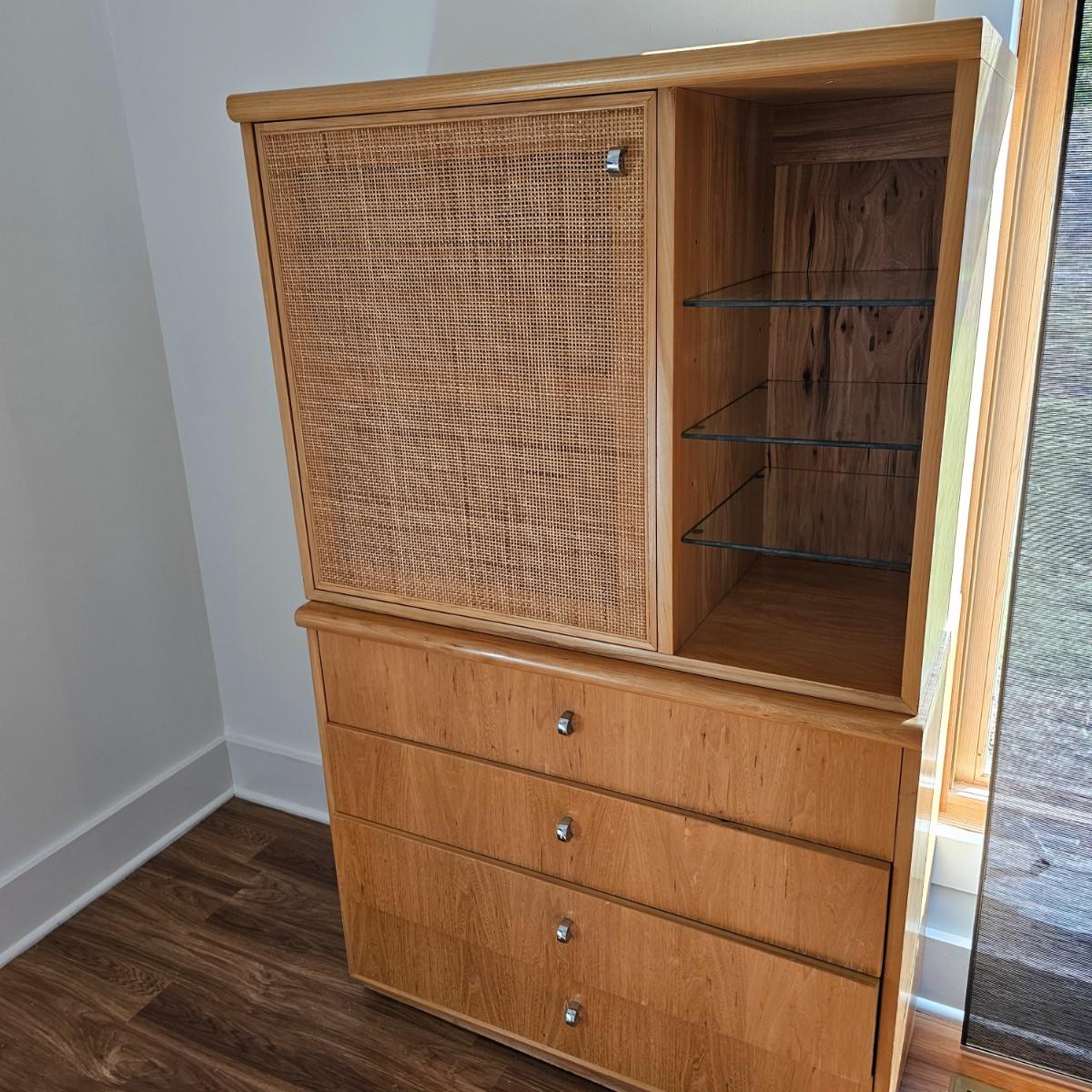 Two sets of wooden storage cabinets, one unit is two pieces. Glass shelves, rattan style doors, and four drawers on one piece. Each set measures 33" x 15" x 54"H. The smaller cabinets can be stacked and measure approximately 33" x 15" x 26"H each. See photos for details. Local pickup only. Winning bidder must bring assistance to help move and load this item due to its weight and/or size.