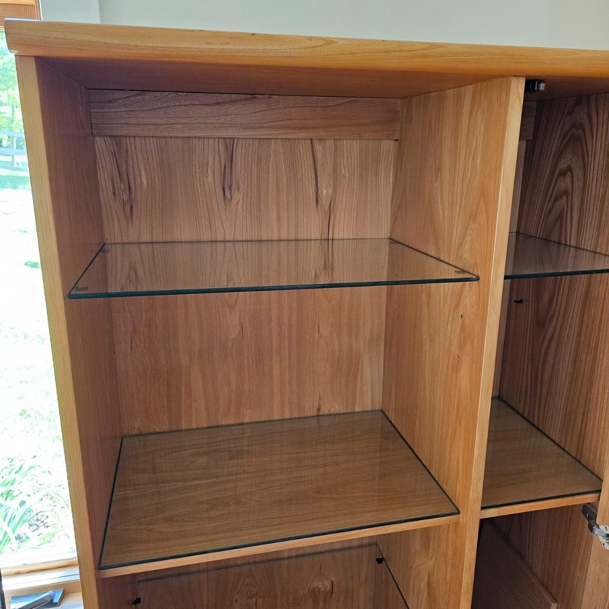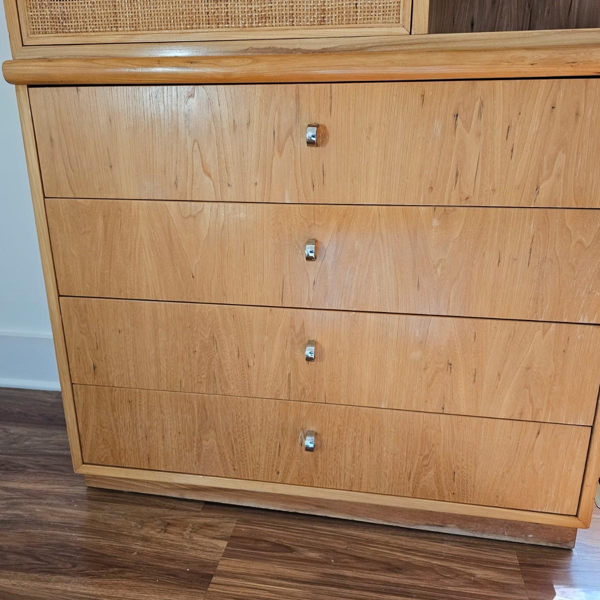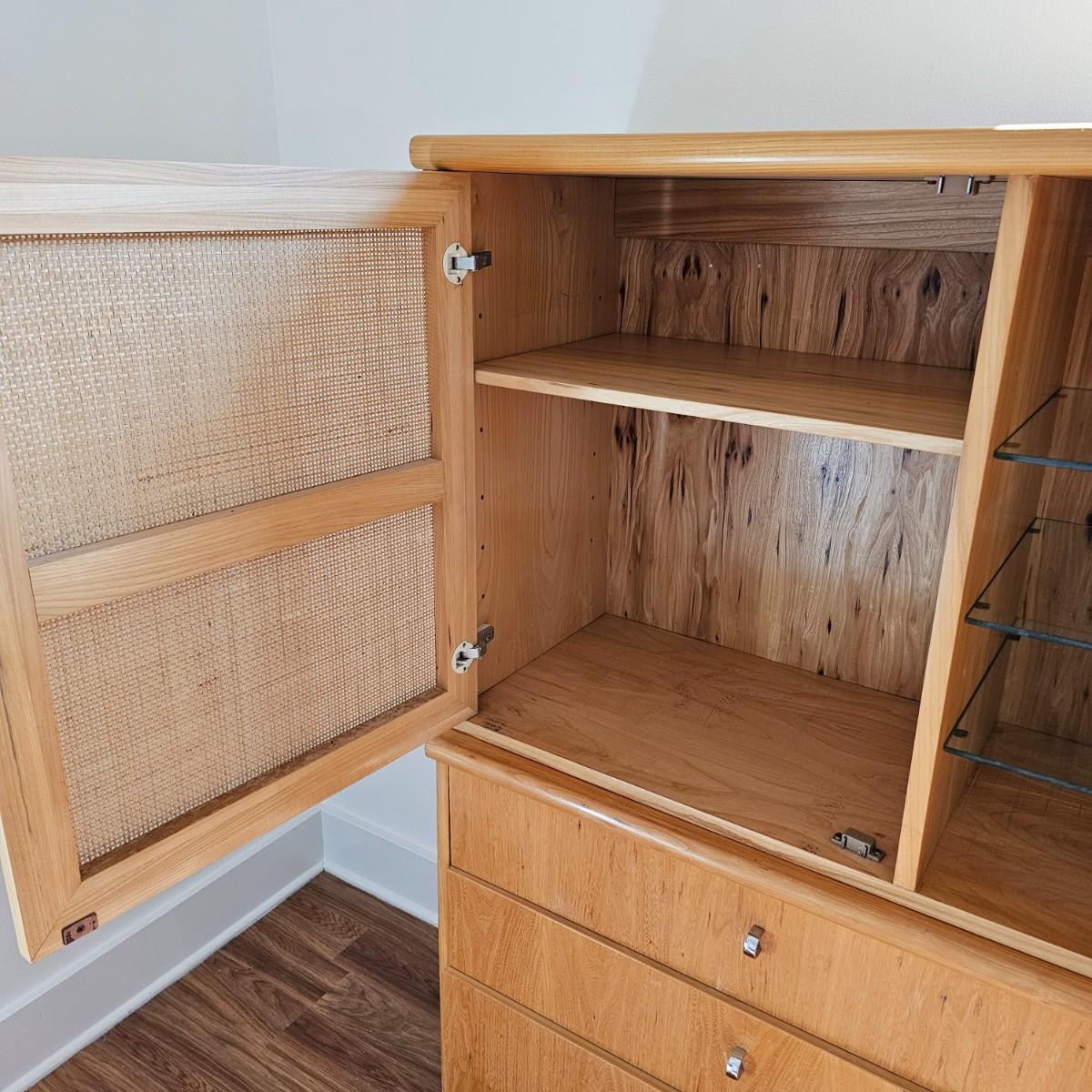 Two sets of wooden storage cabinets, one unit is two pieces. Glass shelves, rattan style doors, and four drawers on one piece. Each set measures 33" x 15" x 54"H. The smaller cabinets can be stacked and measure approximately 33" x 15" x 26"H each. See photos for details. Local pickup only. Winning bidder must bring assistance to help move and load this item due to its weight and/or size.