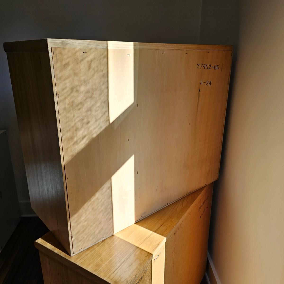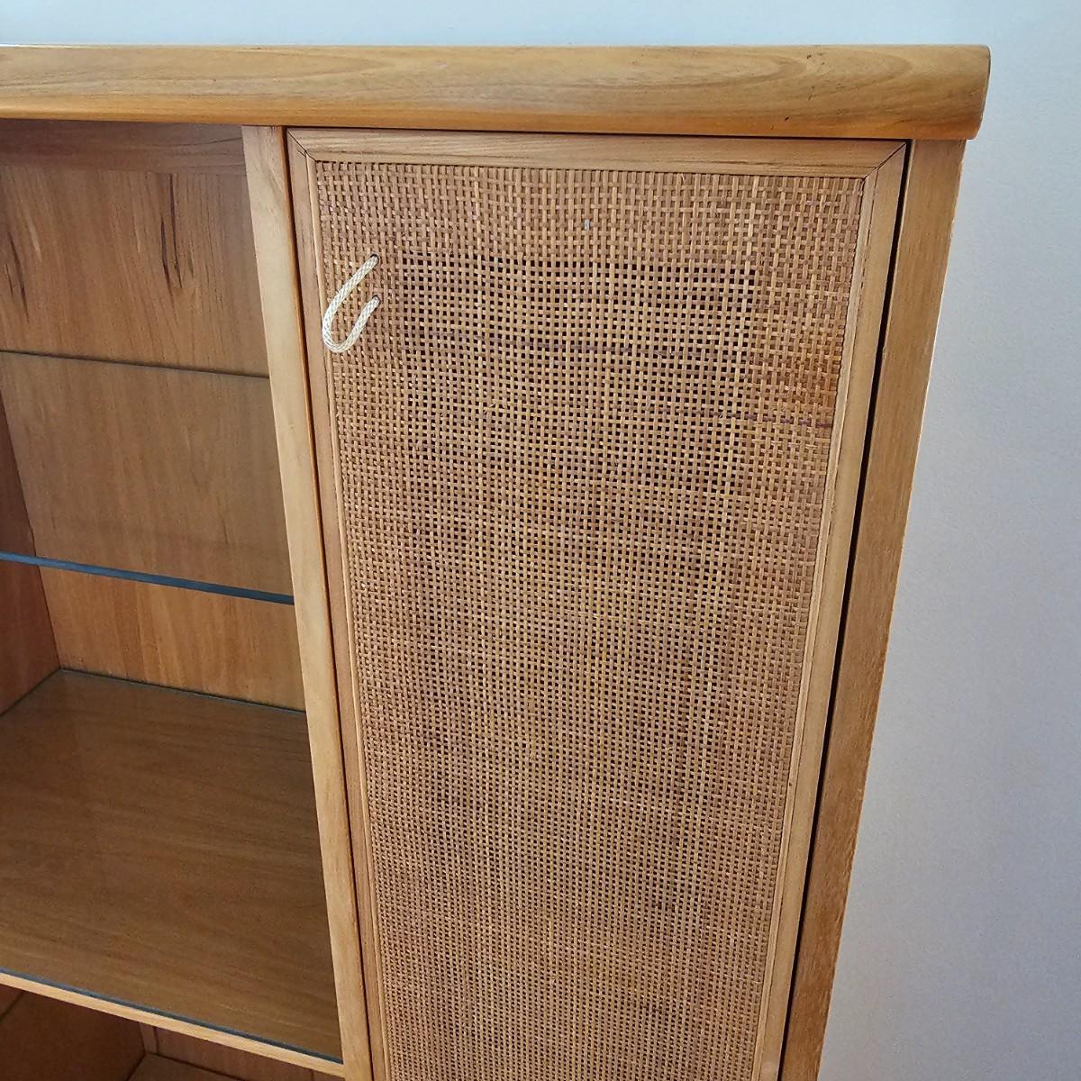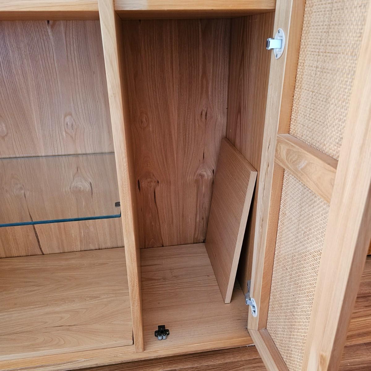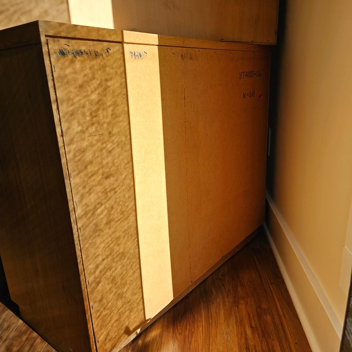 Two sets of wooden storage cabinets, one unit is two pieces. Glass shelves, rattan style doors, and four drawers on one piece. Each set measures 33" x 15" x 54"H. The smaller cabinets can be stacked and measure approximately 33" x 15" x 26"H each. See photos for details. Local pickup only. Winning bidder must bring assistance to help move and load this item due to its weight and/or size.