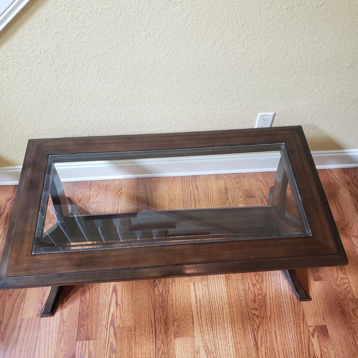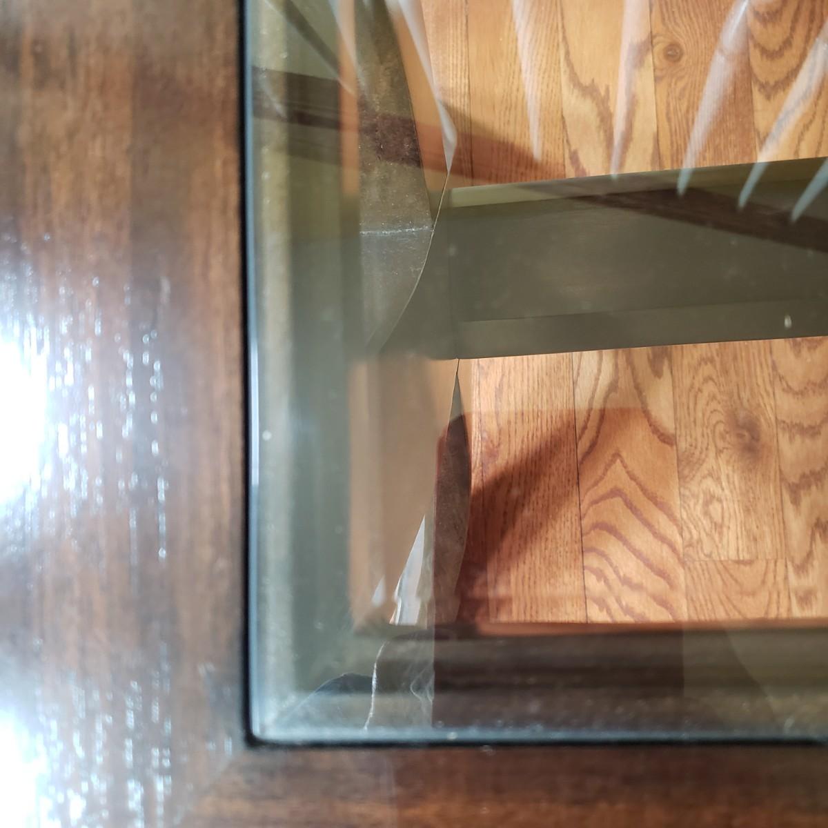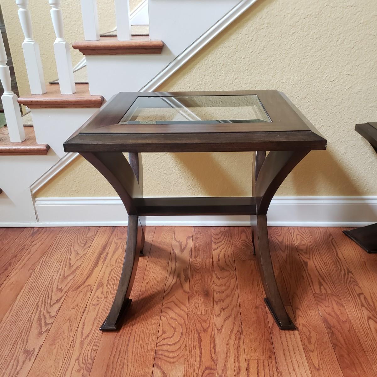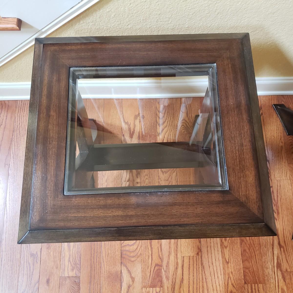 This lot contains three matching wooden and beveled glass tables. The coffee table measures 48" x 26" x 19"H. The square table measures 24" x 22" x 23"H. The round table measures 20"D x 24"H. The coffee table has a few marks, see pictures.