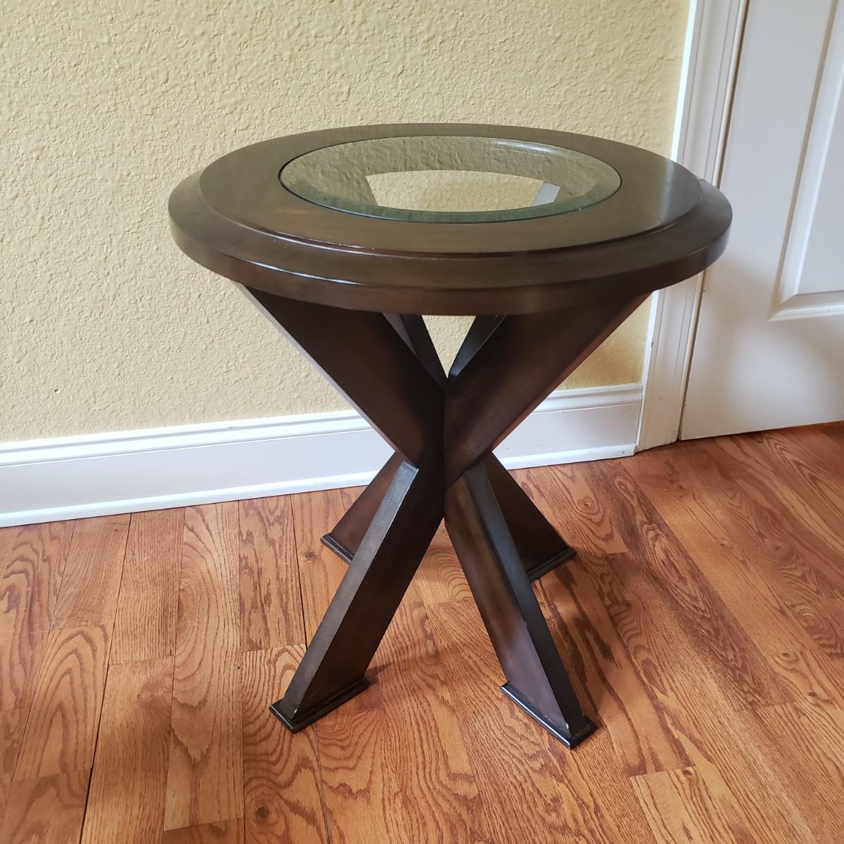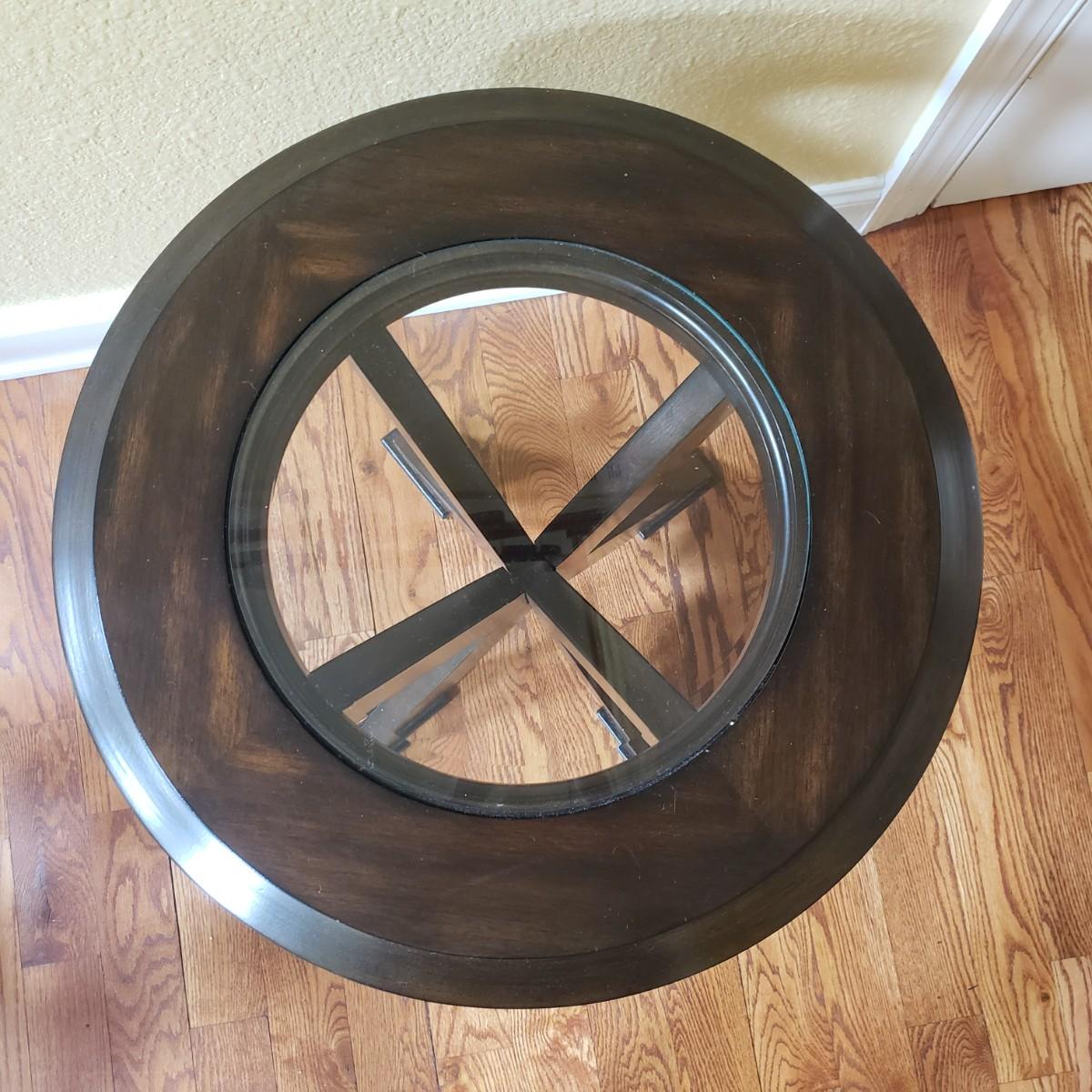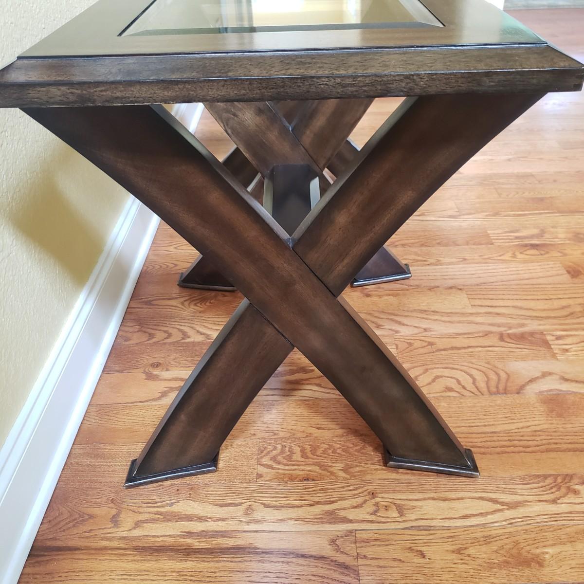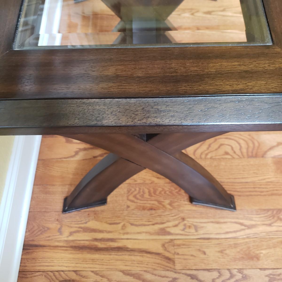 This lot contains three matching wooden and beveled glass tables. The coffee table measures 48" x 26" x 19"H. The square table measures 24" x 22" x 23"H. The round table measures 20"D x 24"H. The coffee table has a few marks, see pictures.