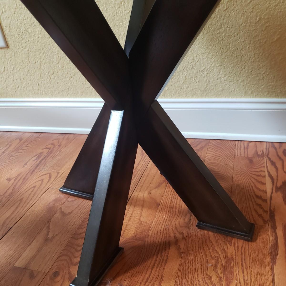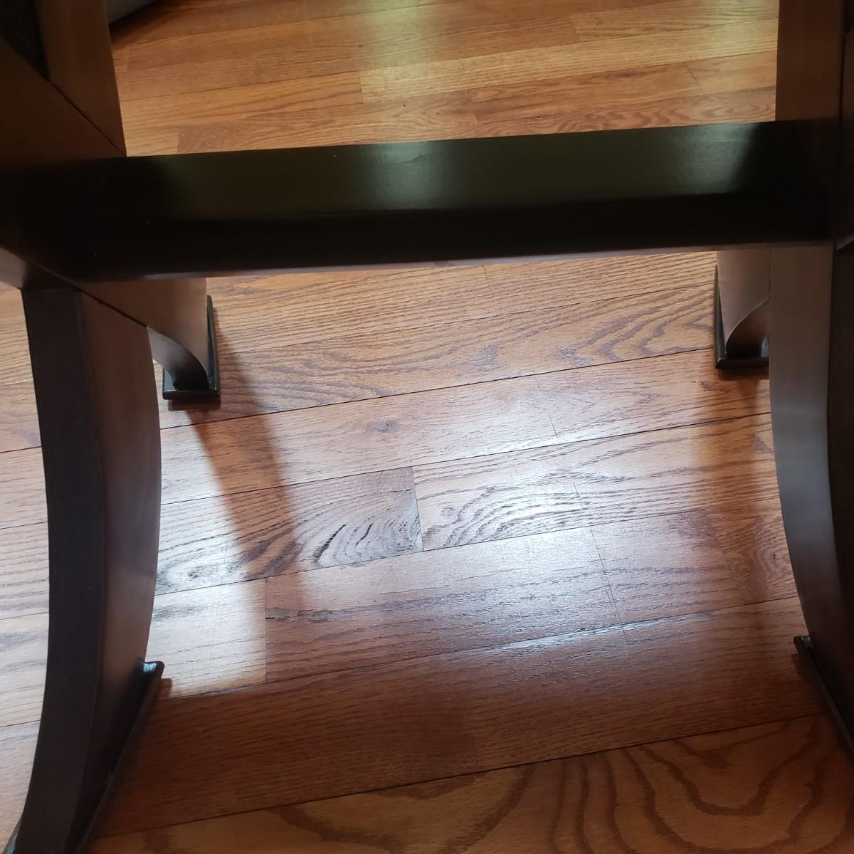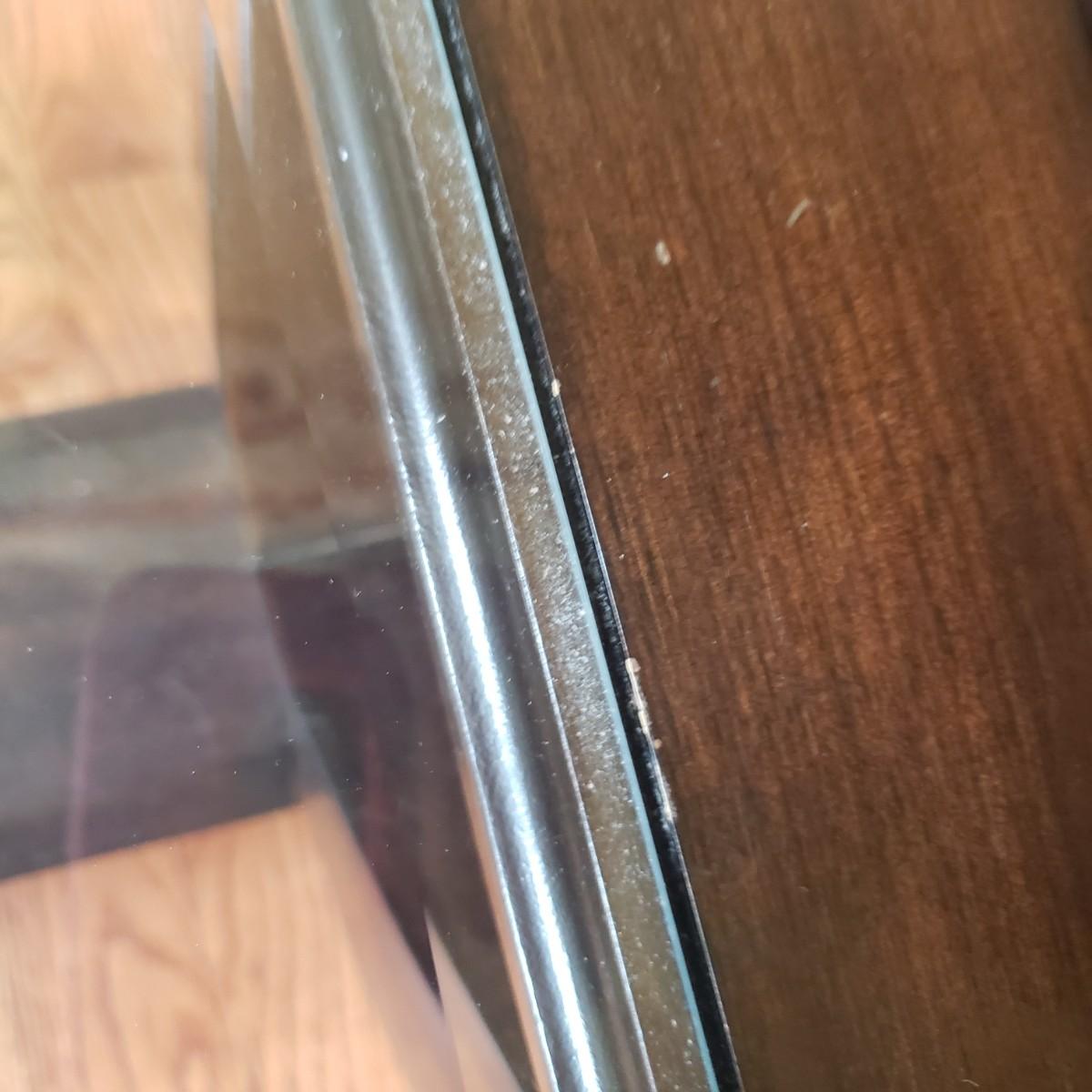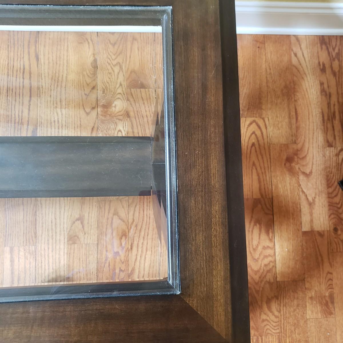 This lot contains three matching wooden and beveled glass tables. The coffee table measures 48" x 26" x 19"H. The square table measures 24" x 22" x 23"H. The round table measures 20"D x 24"H. The coffee table has a few marks, see pictures.