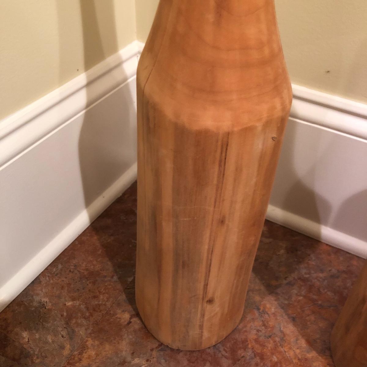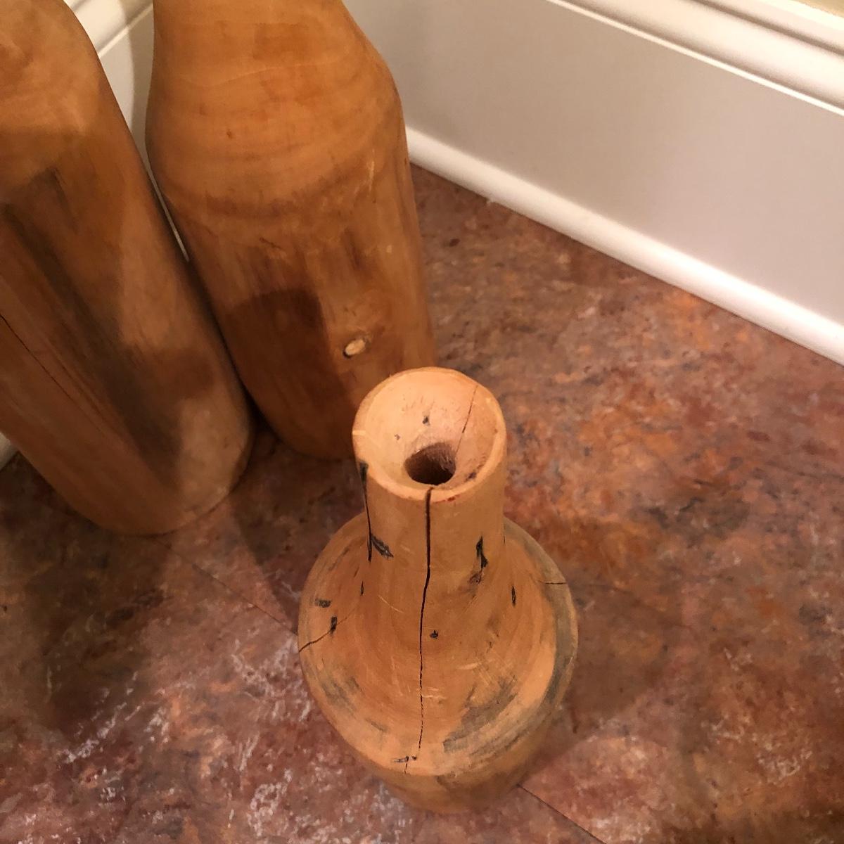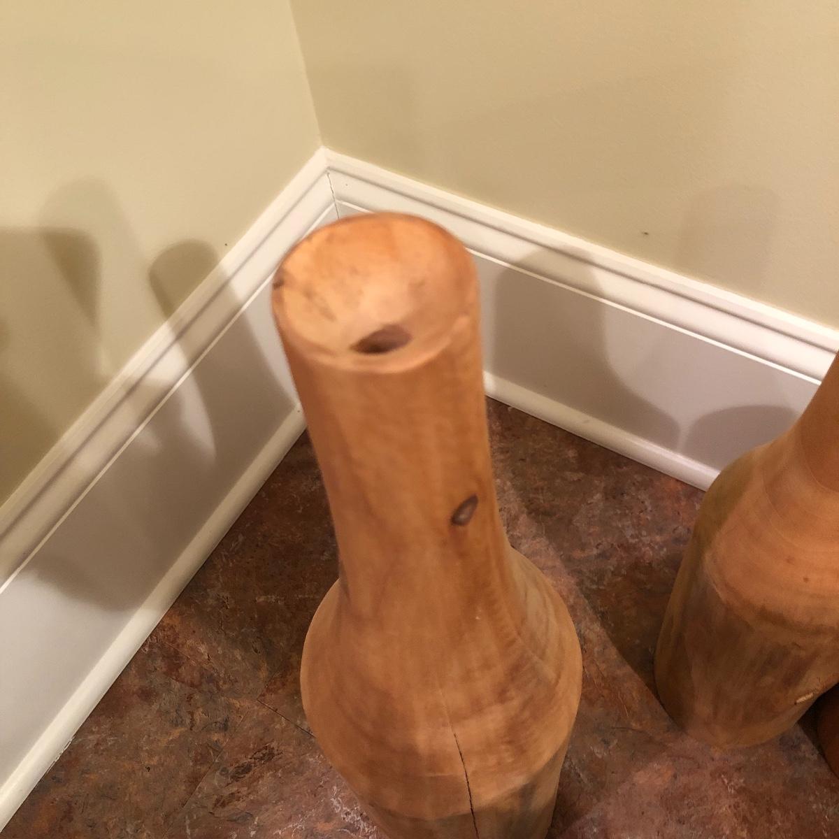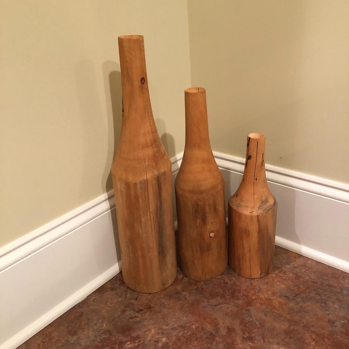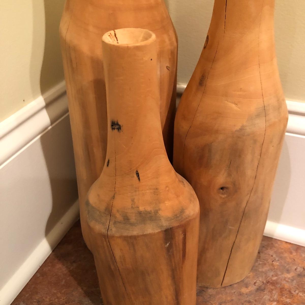 Each vase is made of wood measuring 20” , 16” and 12” tall with approximately a 4” diameter. Shipping Available.