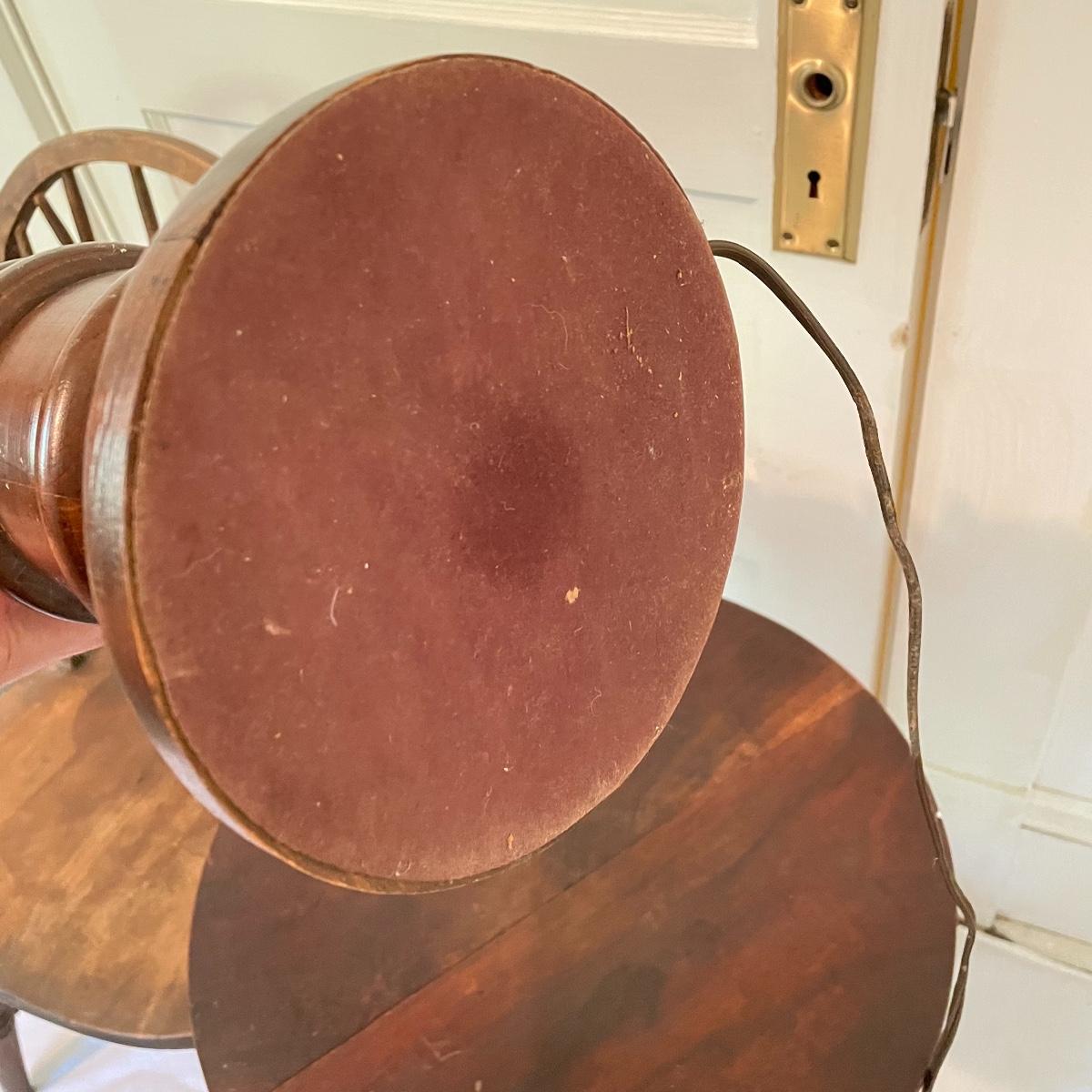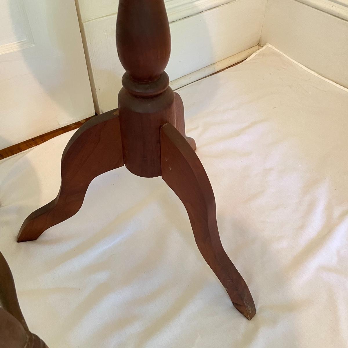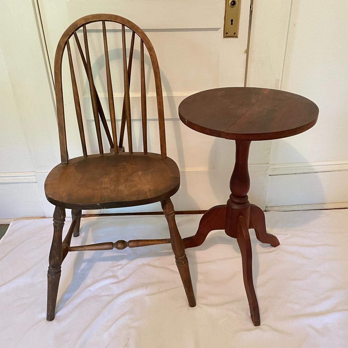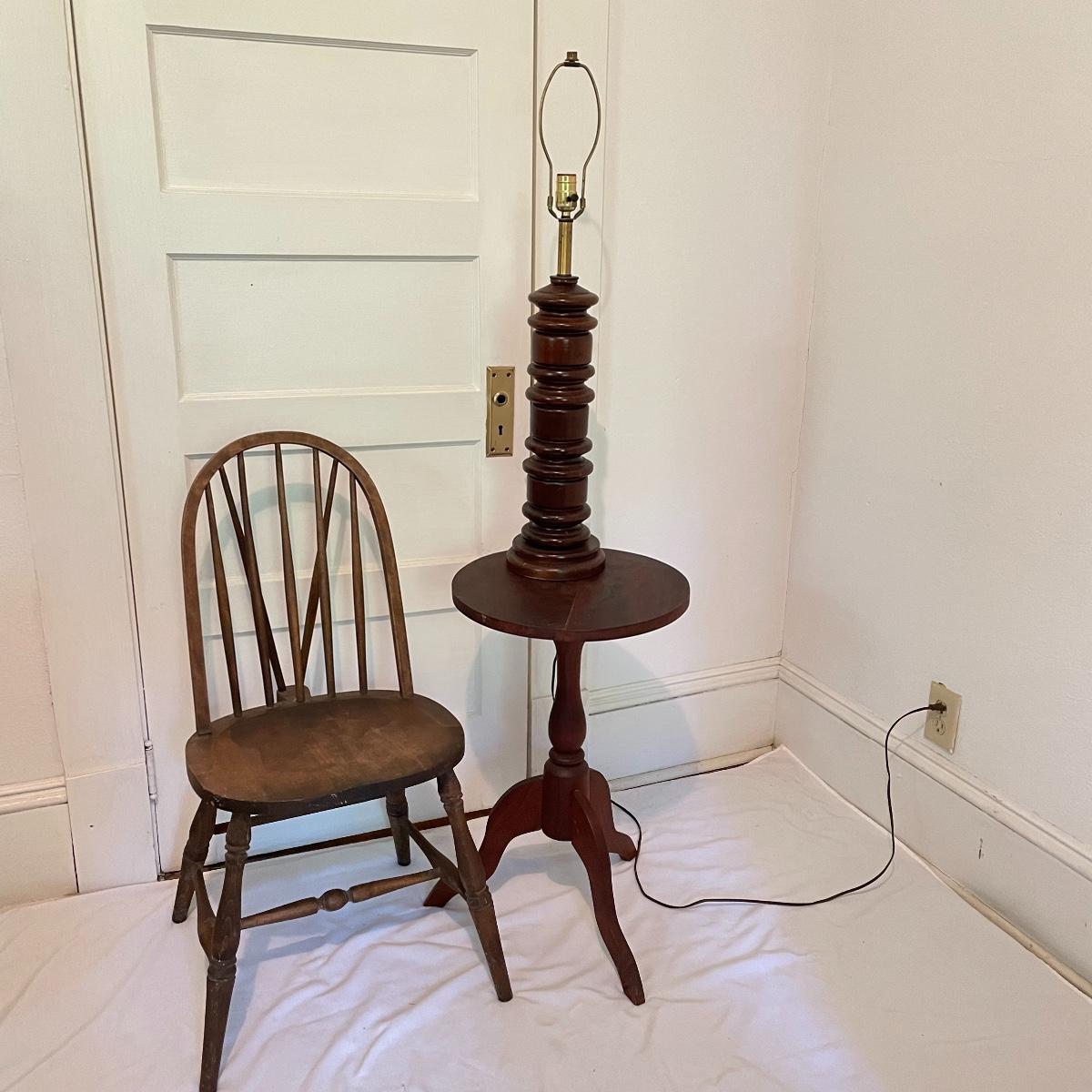 Three dark solid wood vintage finds. Lot includes 33.5” tall lamp, 16”d x 26” pedestal table and the chair measures 17” x 17.5” x 35” with a seat height at 17.5”. Chair needs a bit of cleaning and all three could use a bit of polish. See images. Local pick up only.