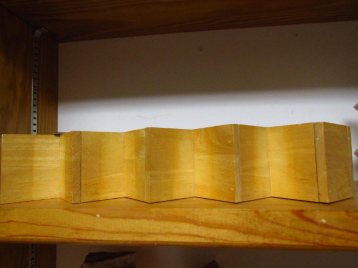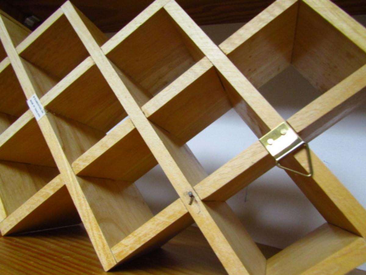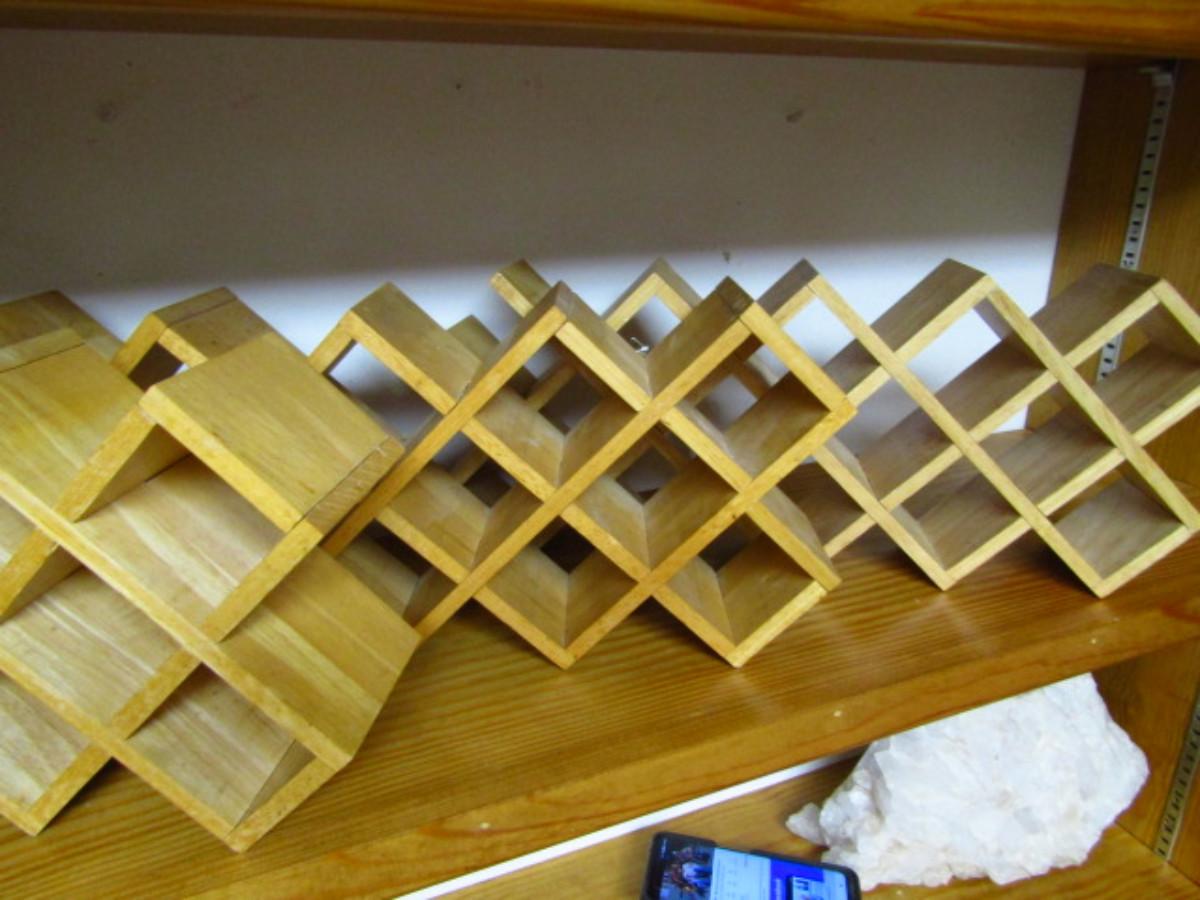 Three Wooden Wall Hanging Displays. Over-all size of each piece is approx 18" x 7", with each slot being approx 2" side-to-side. Please see pictures- one display has piece of wood that needs to be repaired.