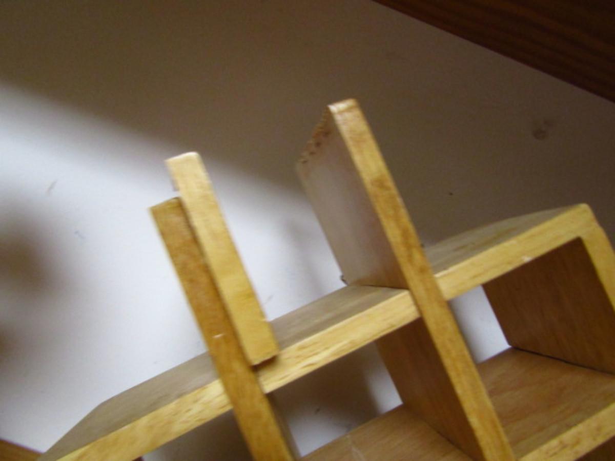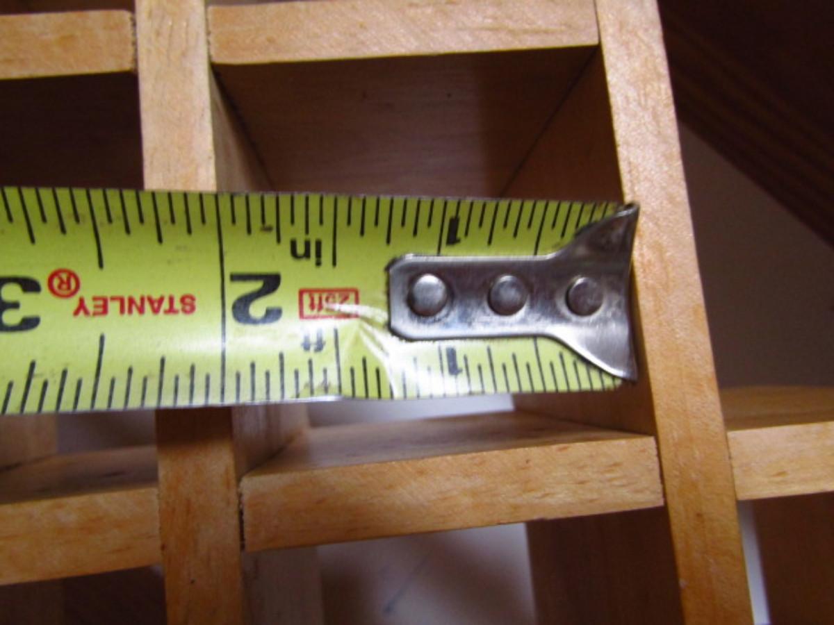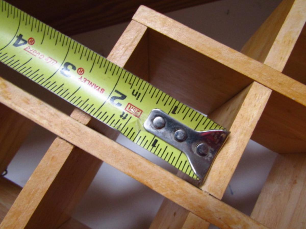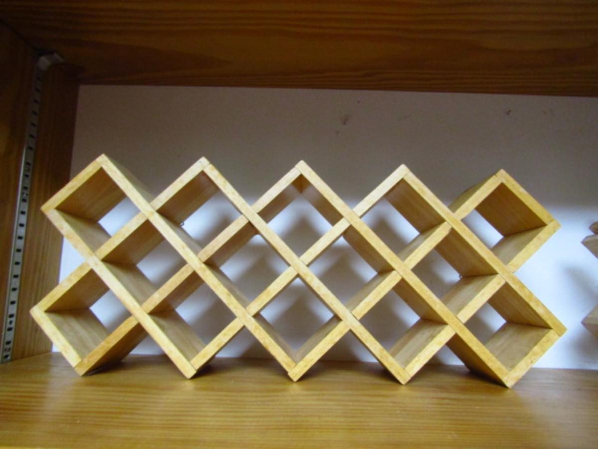 Three Wooden Wall Hanging Displays. Over-all size of each piece is approx 18" x 7", with each slot being approx 2" side-to-side. Please see pictures- one display has piece of wood that needs to be repaired.