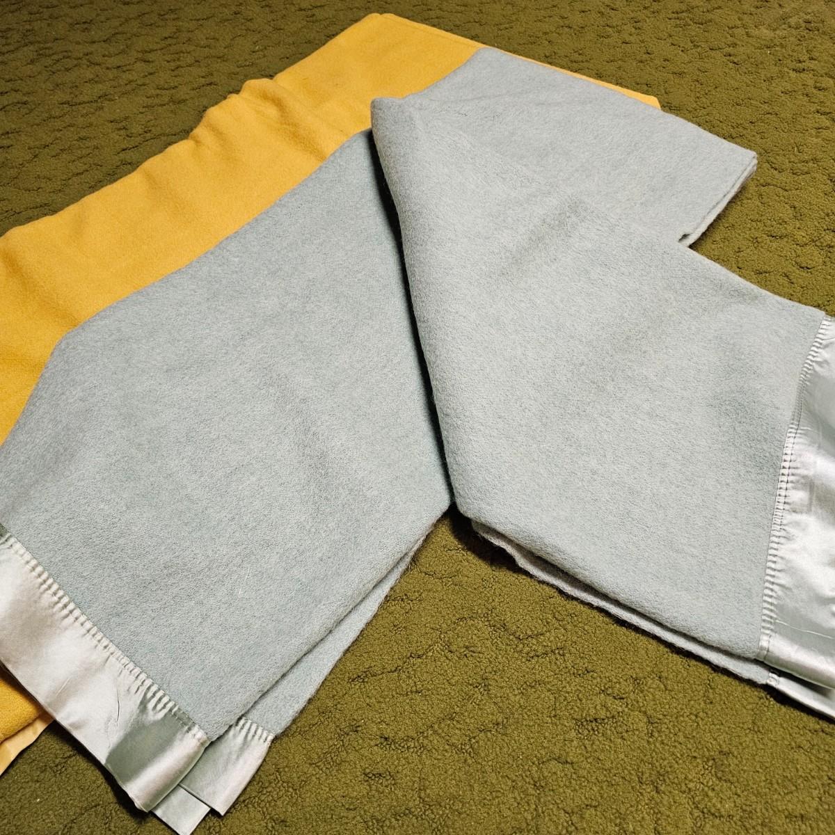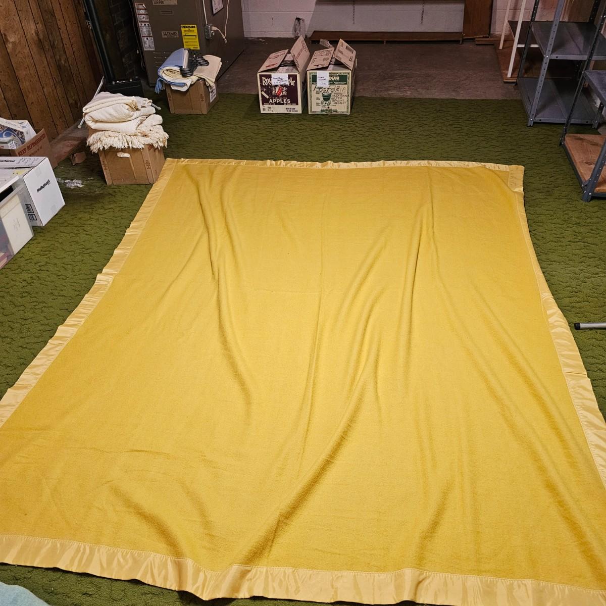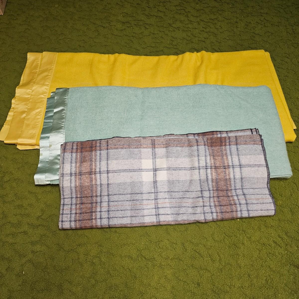 Three blankets for bed use or as cover ups, they all appear to be wool, but certainty of material is unknown. One piece by Kenwood Wool Products. Gold blanket is 92" x 108", green is 74" x 90", and plaid is 58" x 72". Some slight mothball smell. See photos for details. Shipping available.