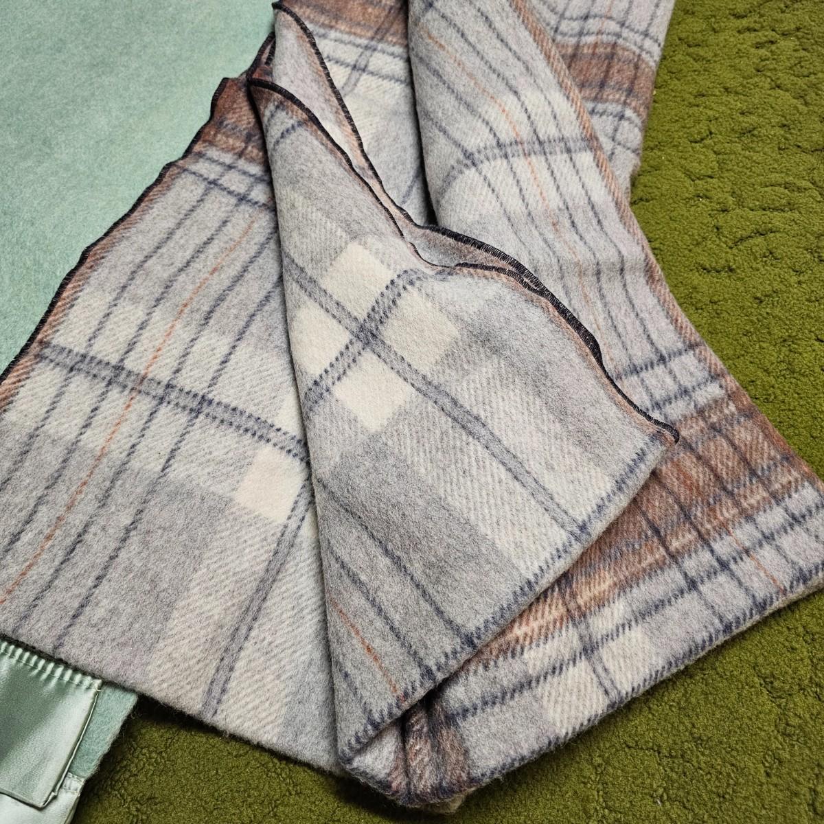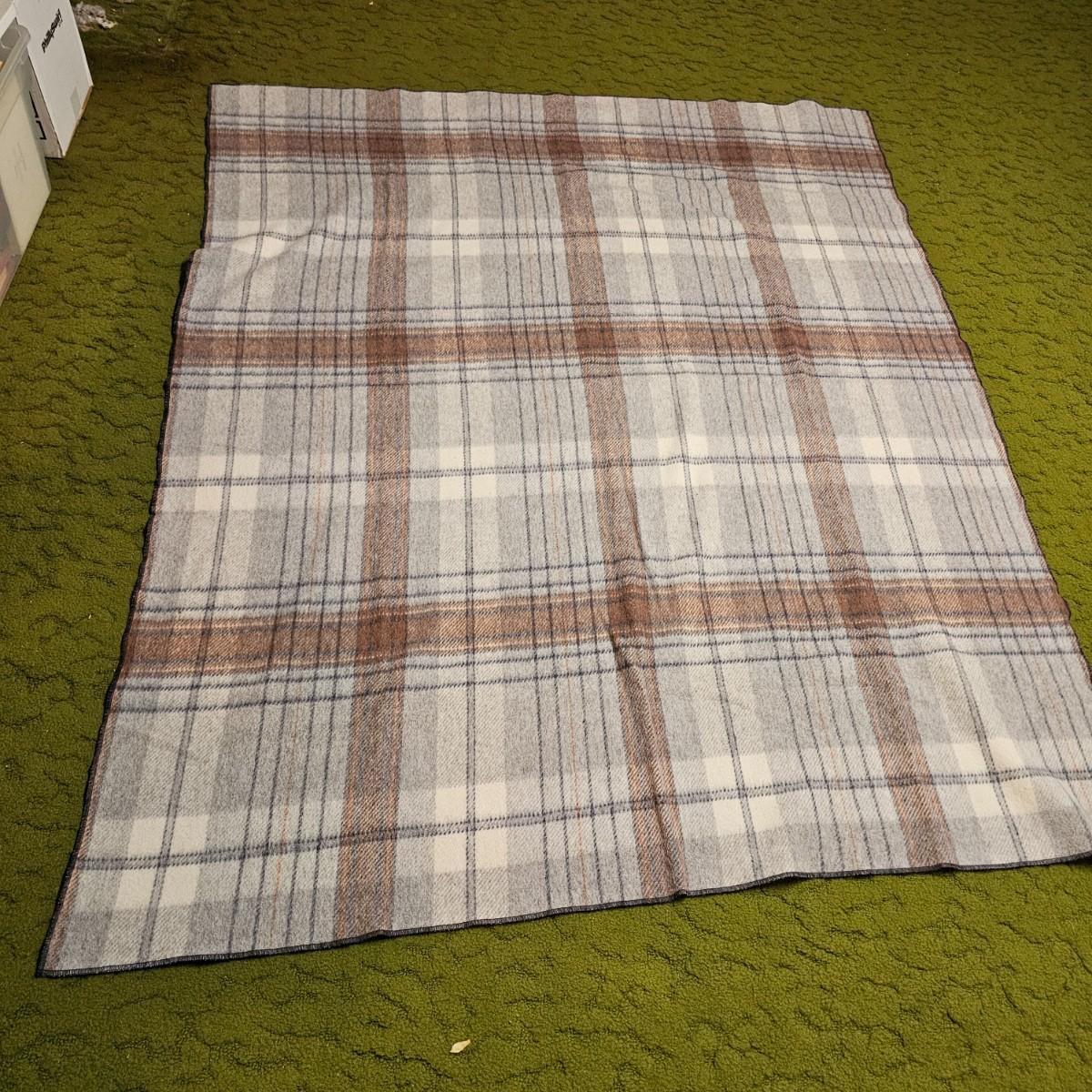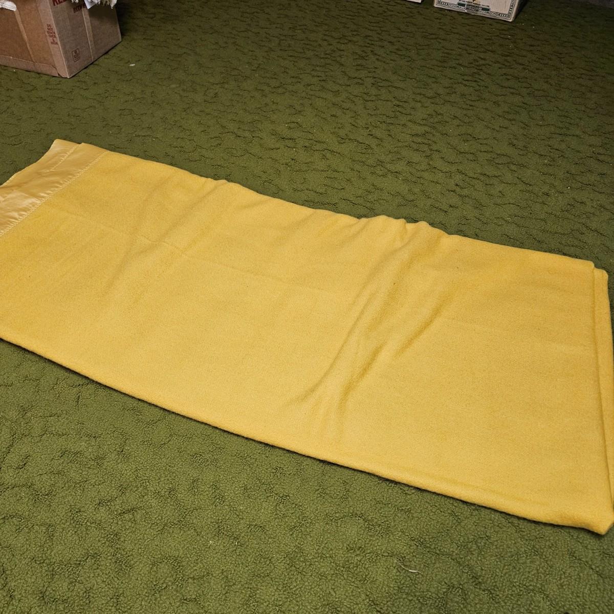 Three blankets for bed use or as cover ups, they all appear to be wool, but certainty of material is unknown. One piece by Kenwood Wool Products. Gold blanket is 92" x 108", green is 74" x 90", and plaid is 58" x 72". Some slight mothball smell. See photos for details. Shipping available.