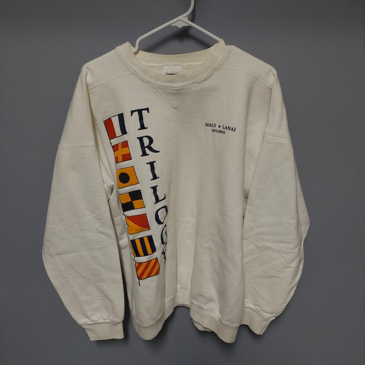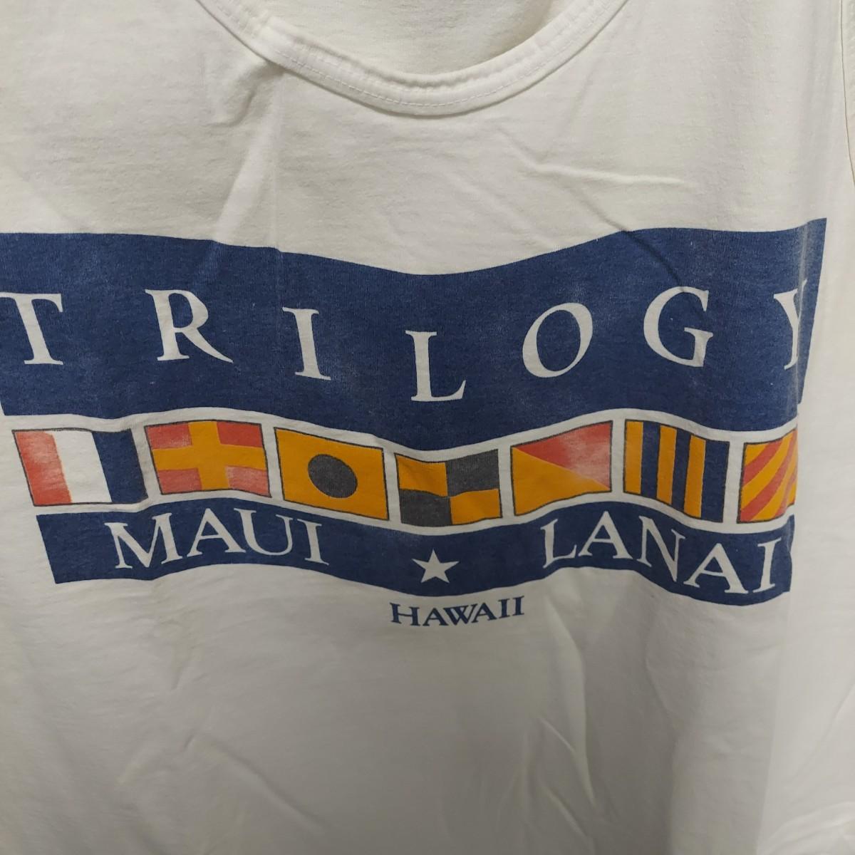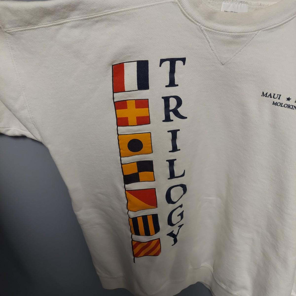 Lot includes three extra large 1990s Trilogy sailing souvenir shirts from Hawaii. The sweatshirt and tee shirt have ring around the collar. All three have an overall yellowing. The Tank top and t-shirt have a single stitch hem. Please see photos for details. Shipping available