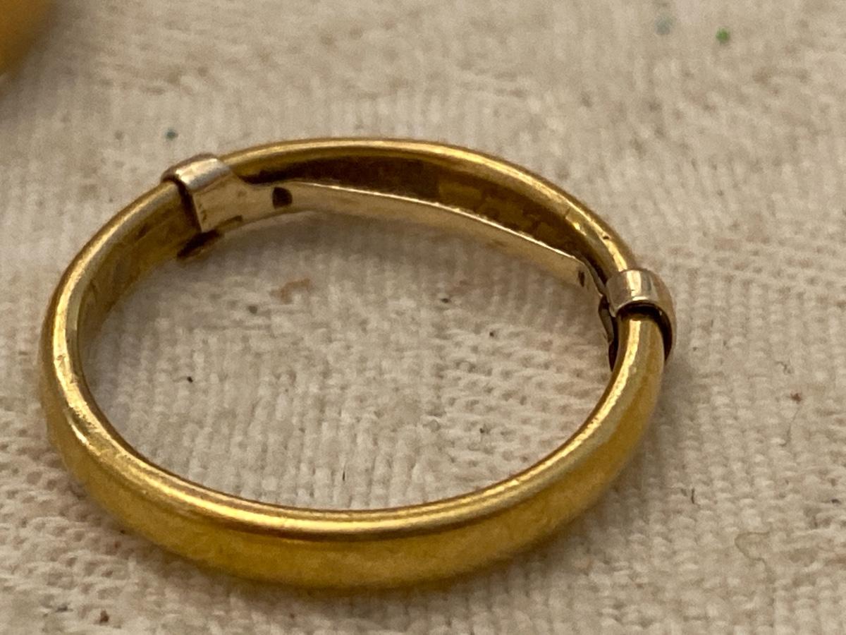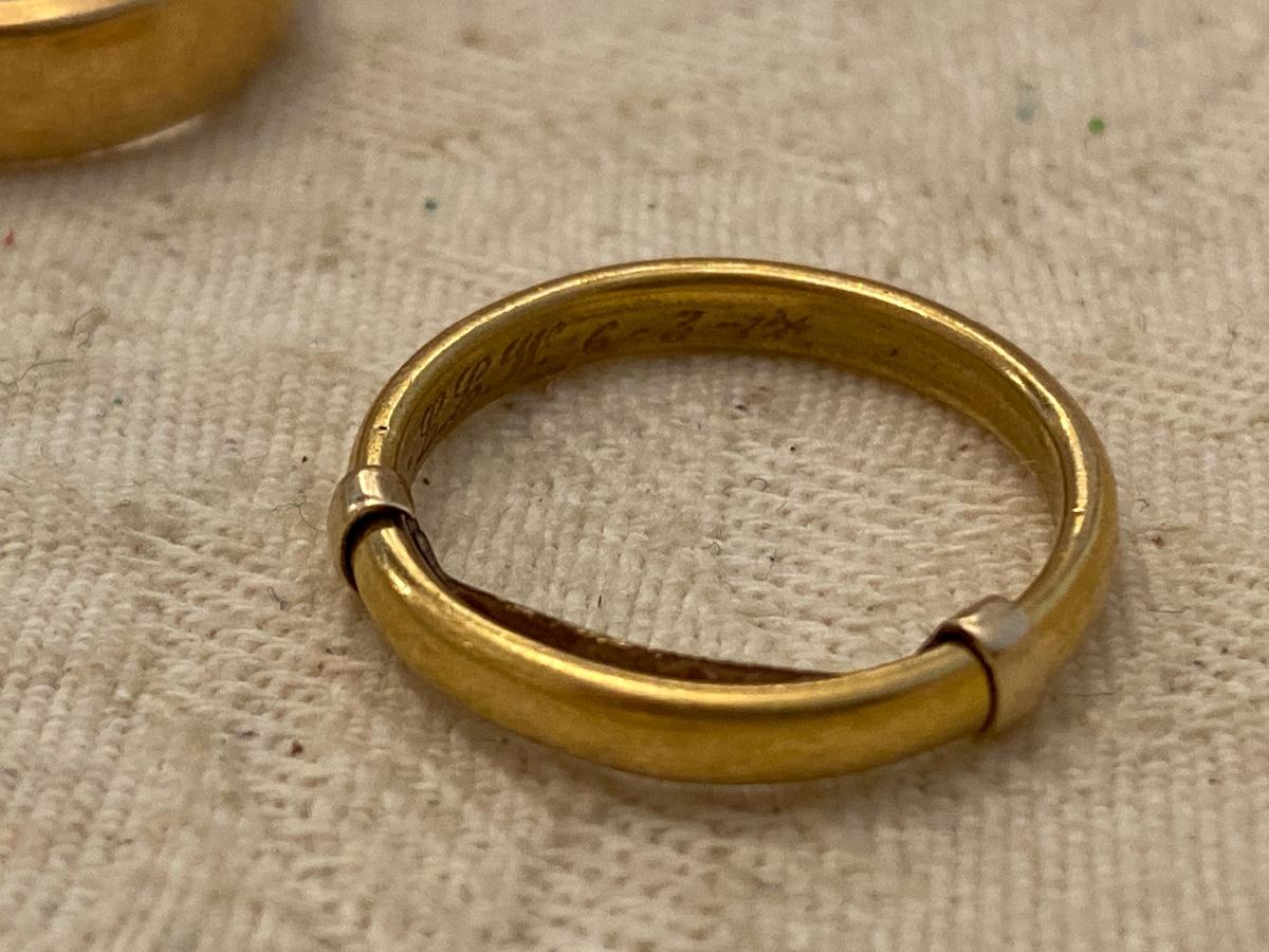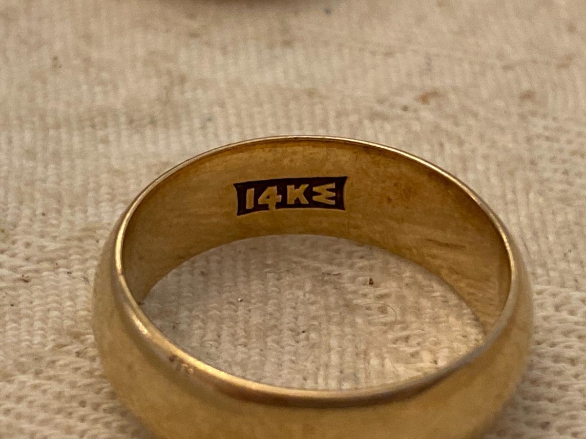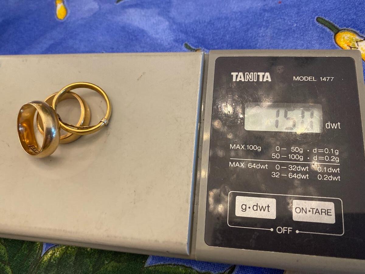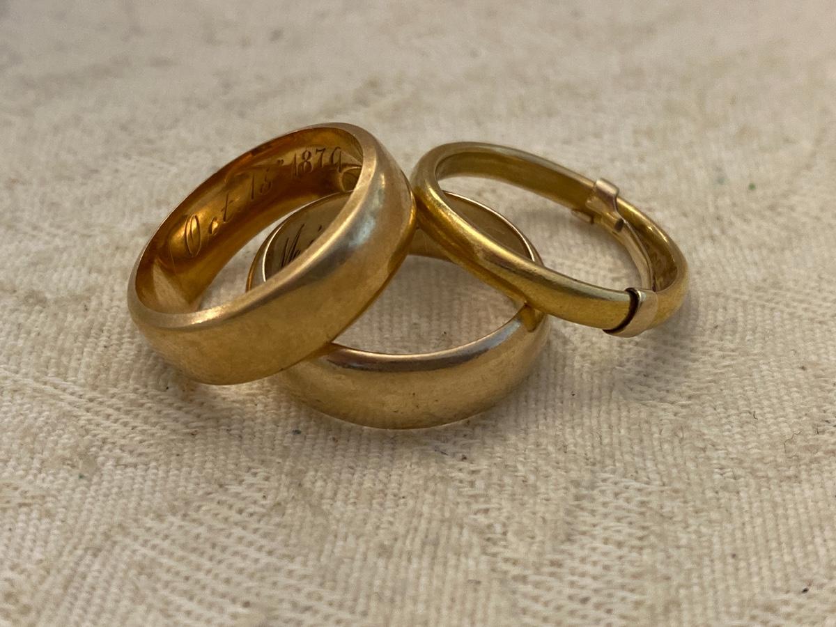One band is marked 14K. One is marked 18K. One has a difficult to read mark. All are size 5. Total weight of all is 9.6 dwt or 15 grams.