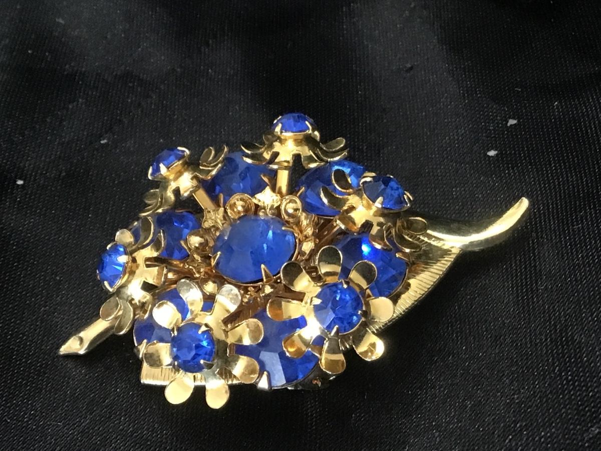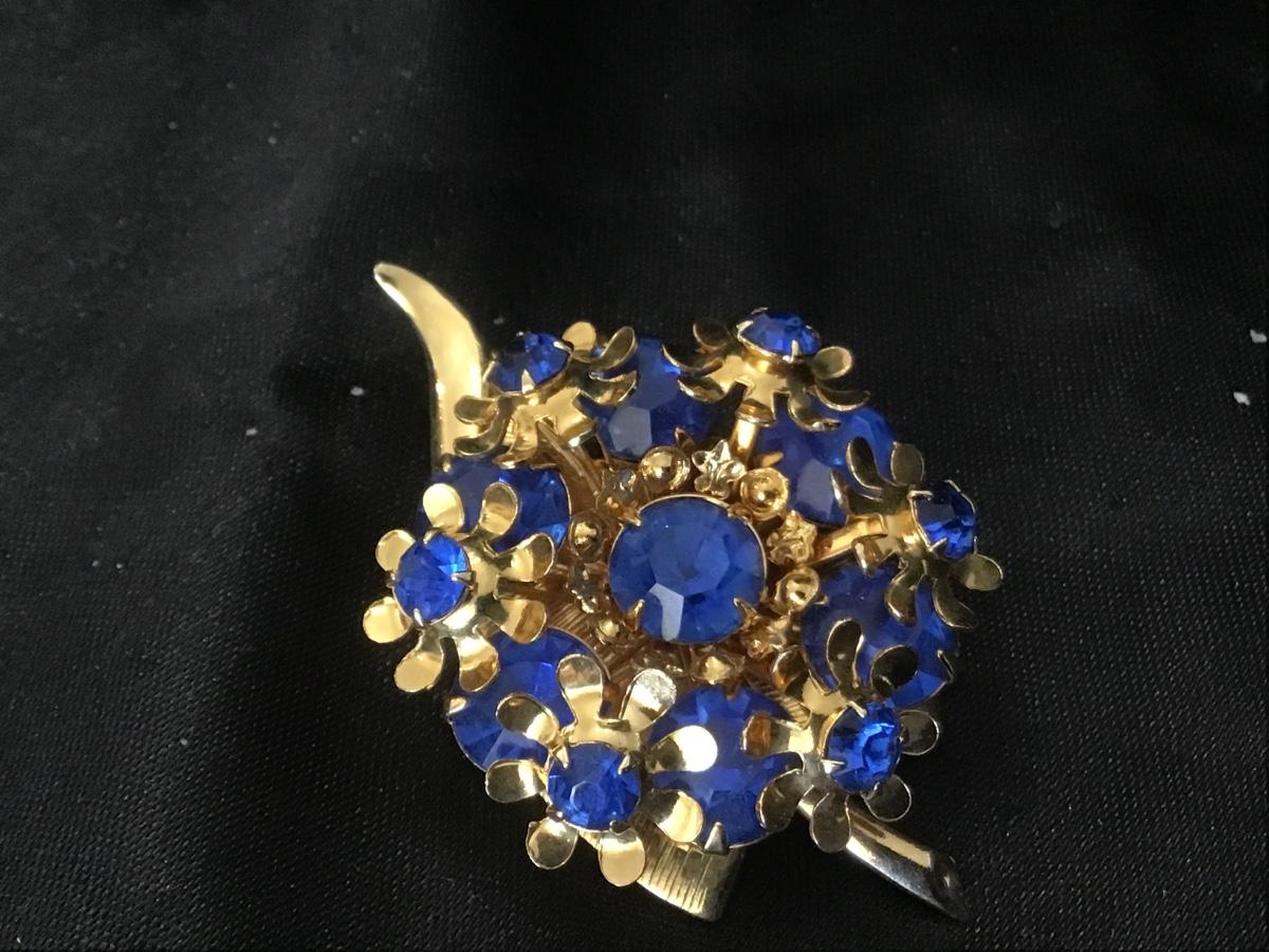 Three-dimensional flower cluster leaf Blue Rhinestone Brooch