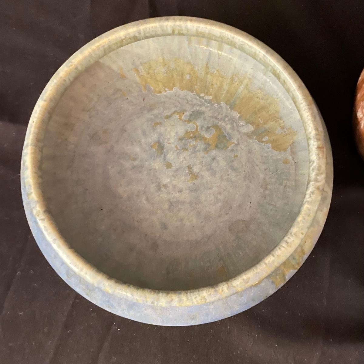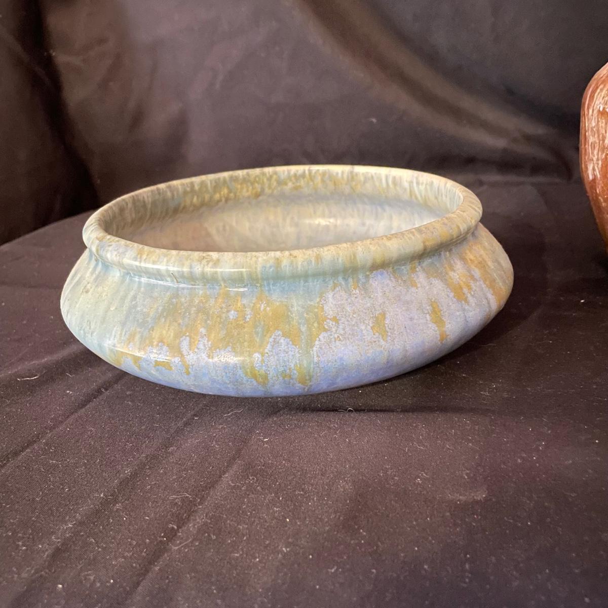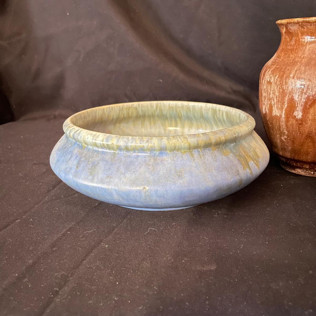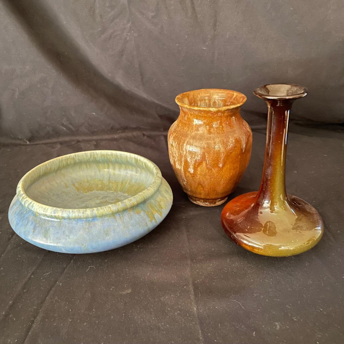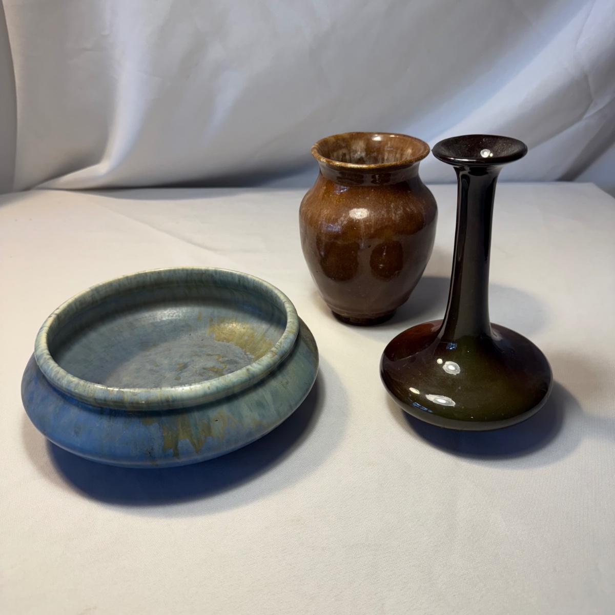 Three pieces of beautiful pottery. The tallest bud vase has a high gloss sheen over its crazed glaze. It is stamped Zane along with other markings. The brown jar has the initials JK and a slight chip on the bottom. Lastly, a fine, shallow bowl with cornflower blue mixed with greens and browns. This bowl is 8.25”D x 3”H. The Zane vase stands at 7.5” tall. See images. Shipping available.