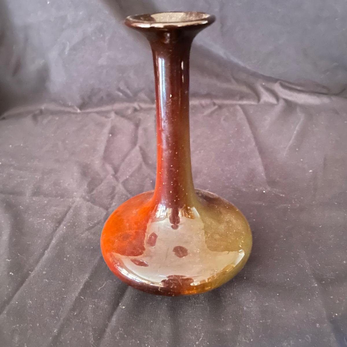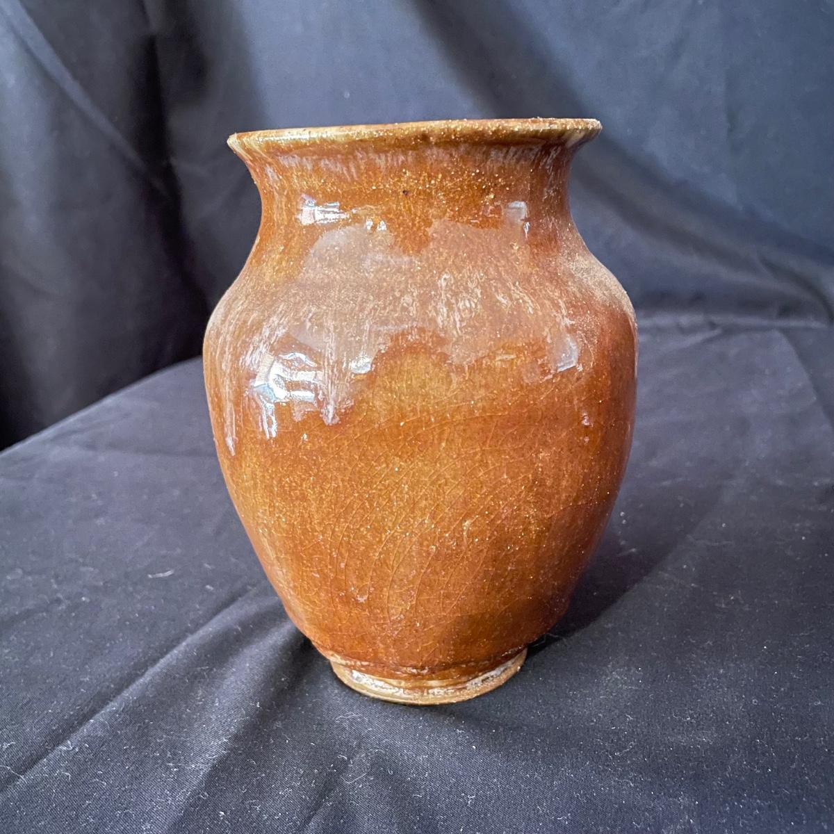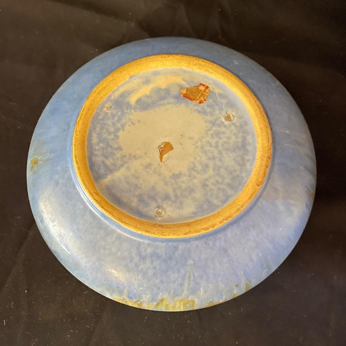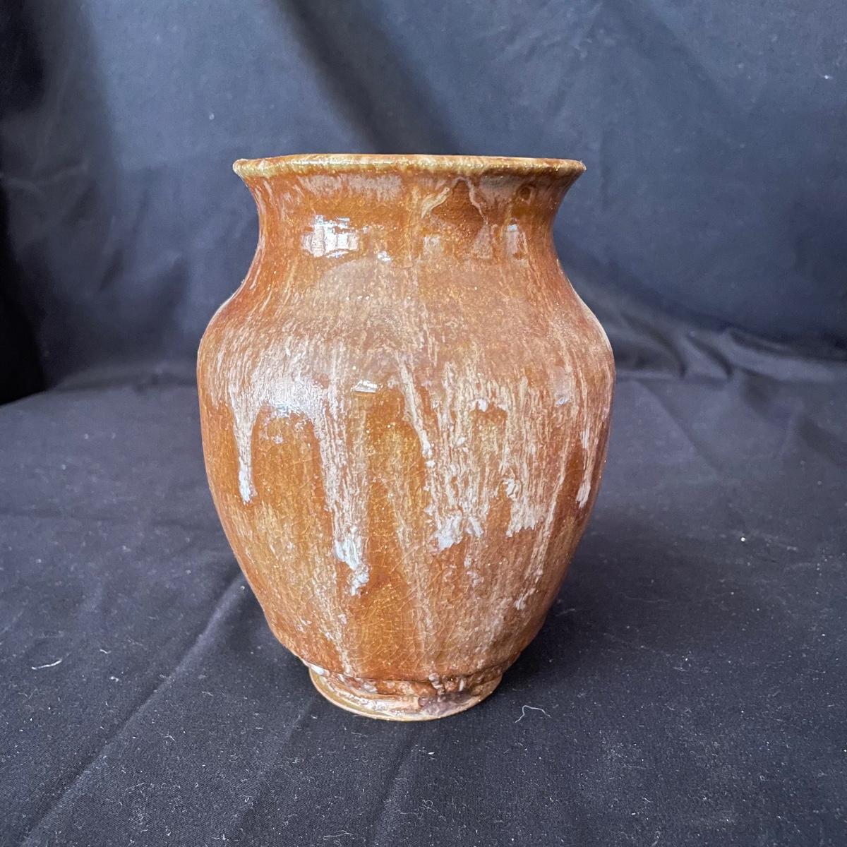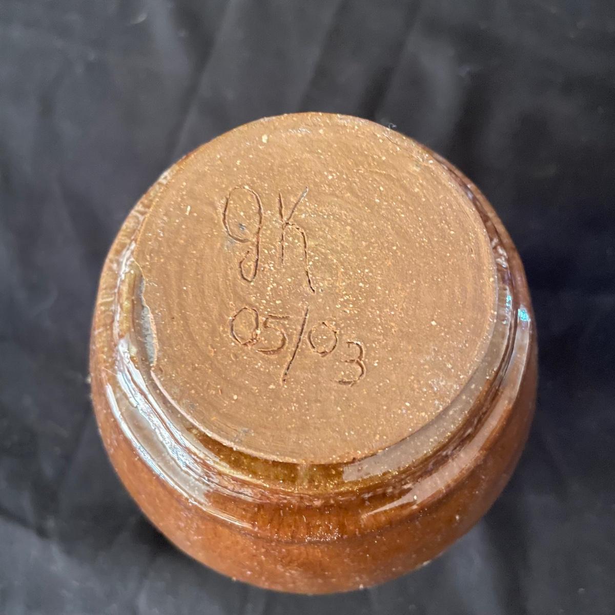 Three pieces of beautiful pottery. The tallest bud vase has a high gloss sheen over its crazed glaze. It is stamped Zane along with other markings. The brown jar has the initials JK and a slight chip on the bottom. Lastly, a fine, shallow bowl with cornflower blue mixed with greens and browns. This bowl is 8.25”D x 3”H. The Zane vase stands at 7.5” tall. See images. Shipping available.