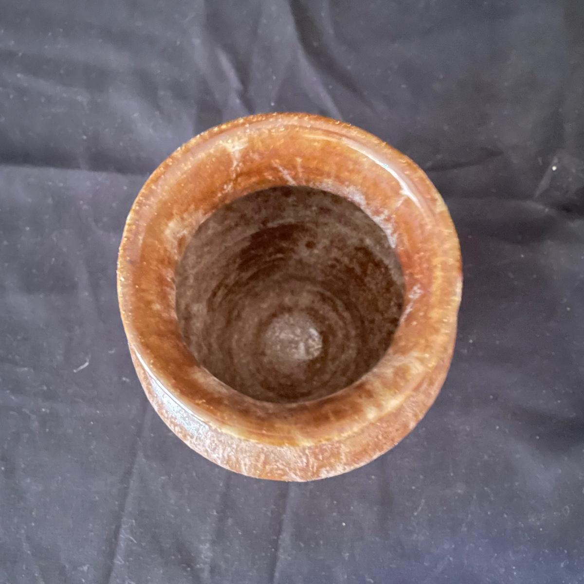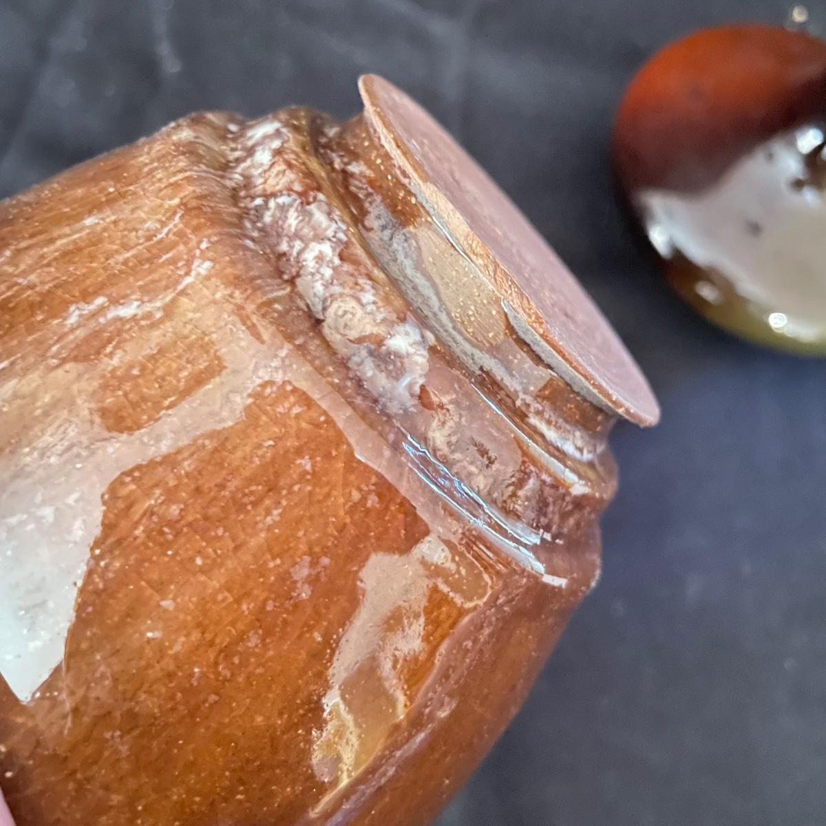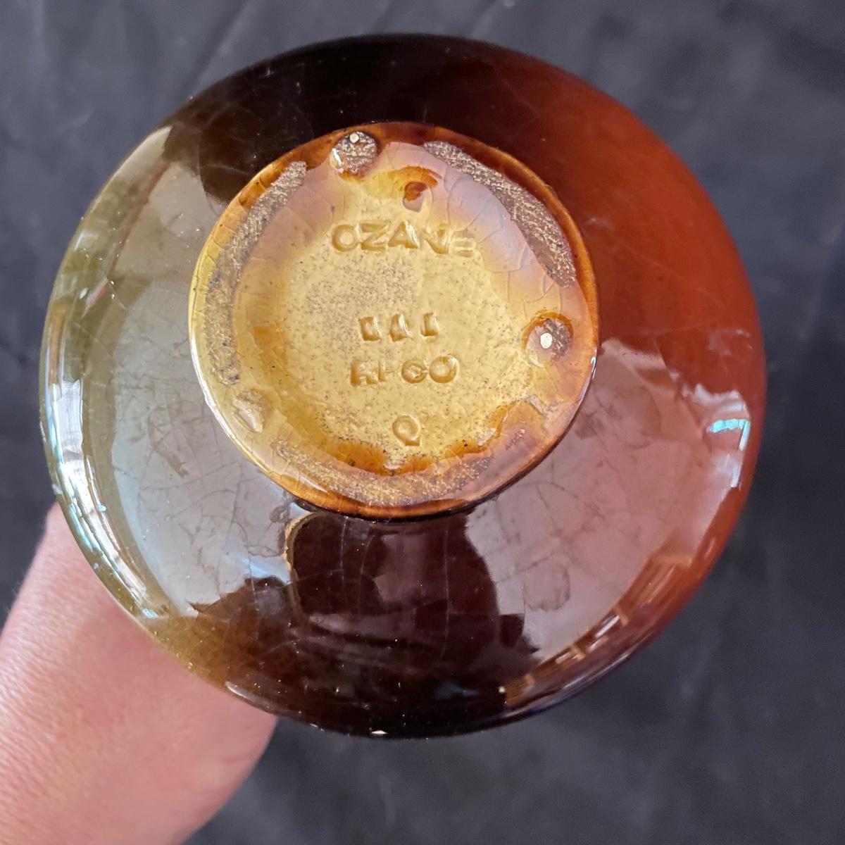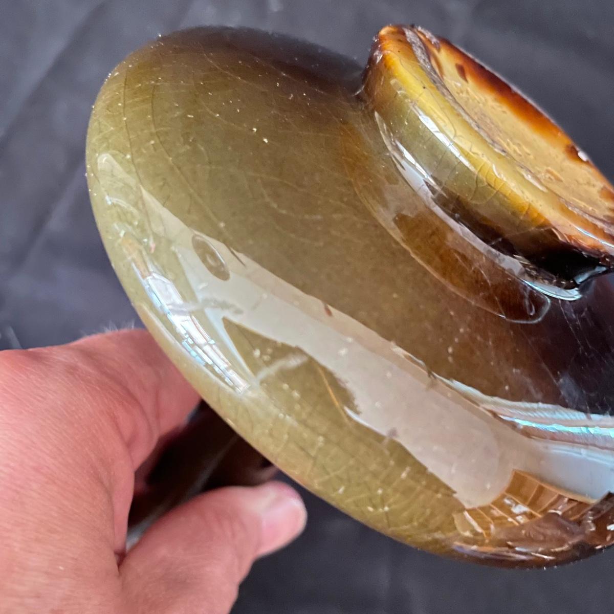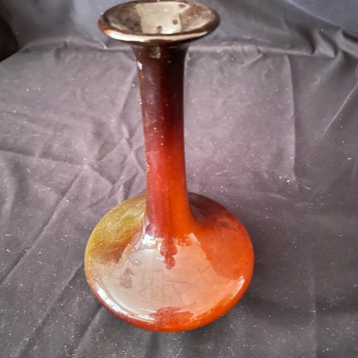 Three pieces of beautiful pottery. The tallest bud vase has a high gloss sheen over its crazed glaze. It is stamped Zane along with other markings. The brown jar has the initials JK and a slight chip on the bottom. Lastly, a fine, shallow bowl with cornflower blue mixed with greens and browns. This bowl is 8.25”D x 3”H. The Zane vase stands at 7.5” tall. See images. Shipping available.