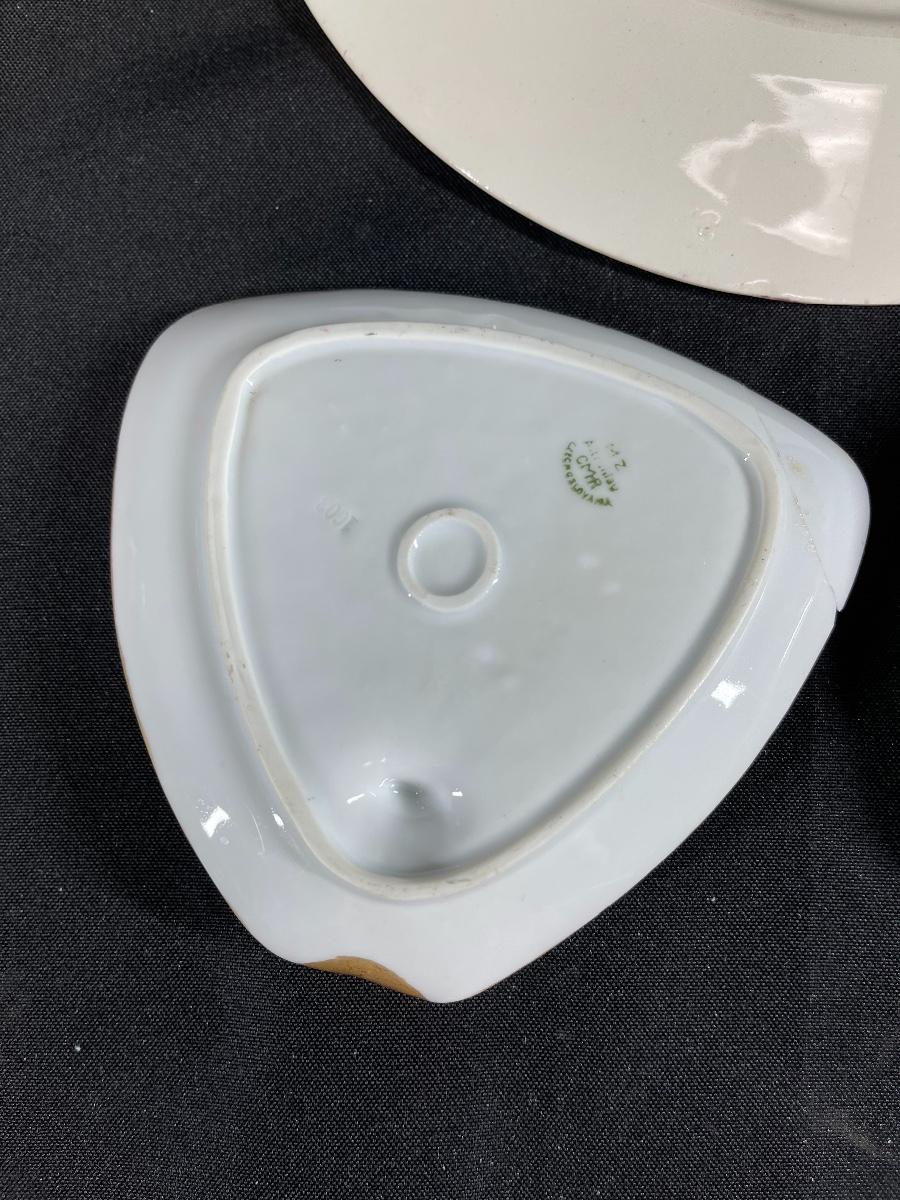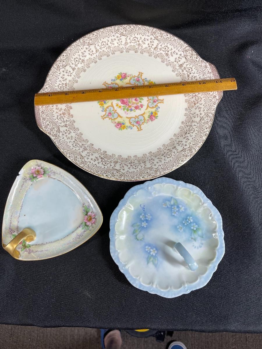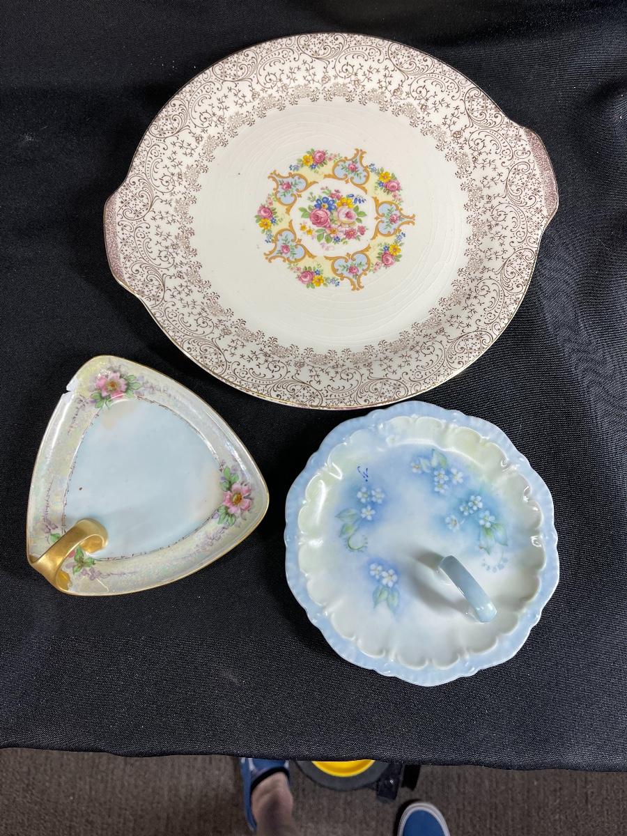 Triangular nappy has been cracked and chipped. Other two pieces are in good shape. Cake plate has some crazing.