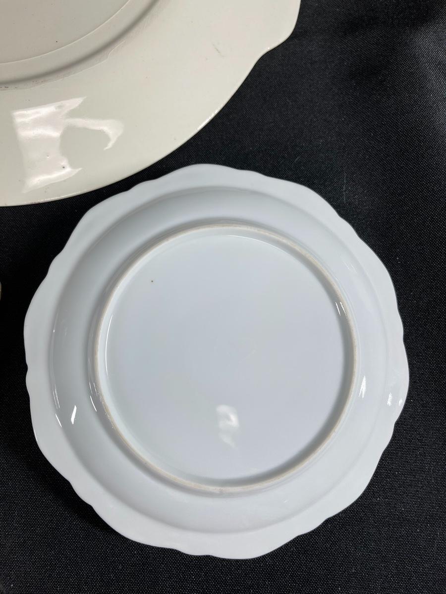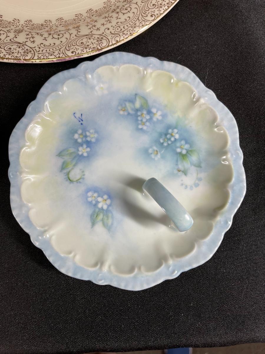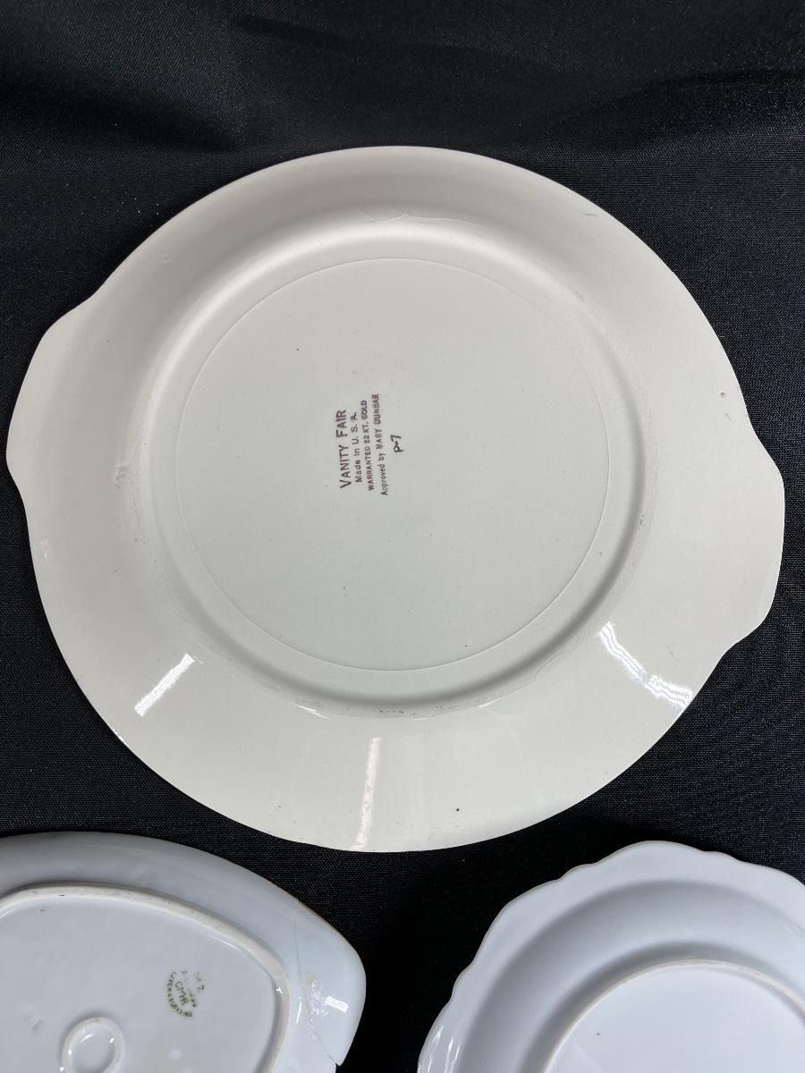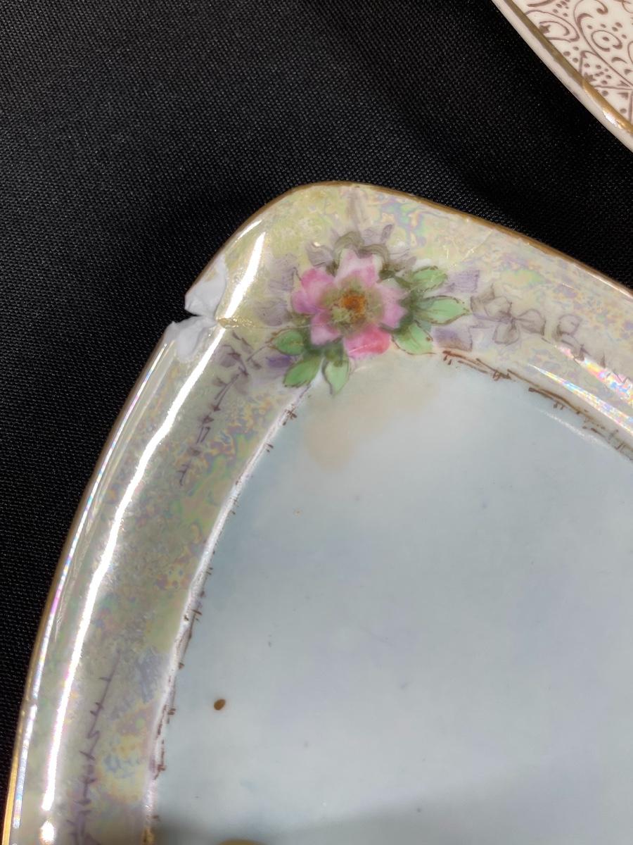 Triangular nappy has been cracked and chipped. Other two pieces are in good shape. Cake plate has some crazing.