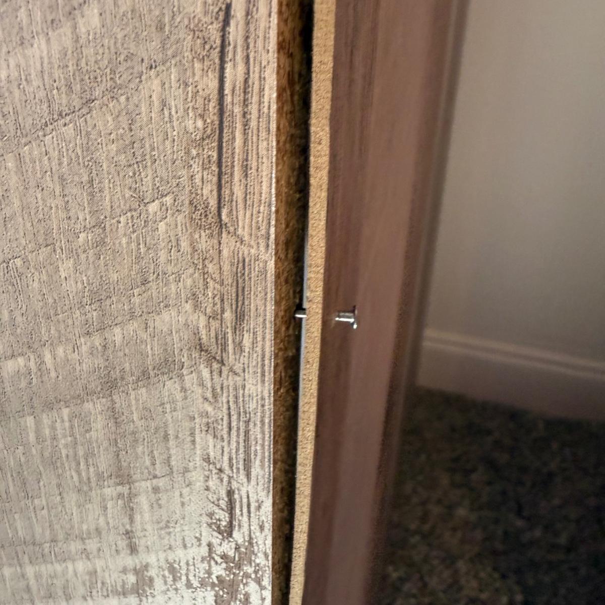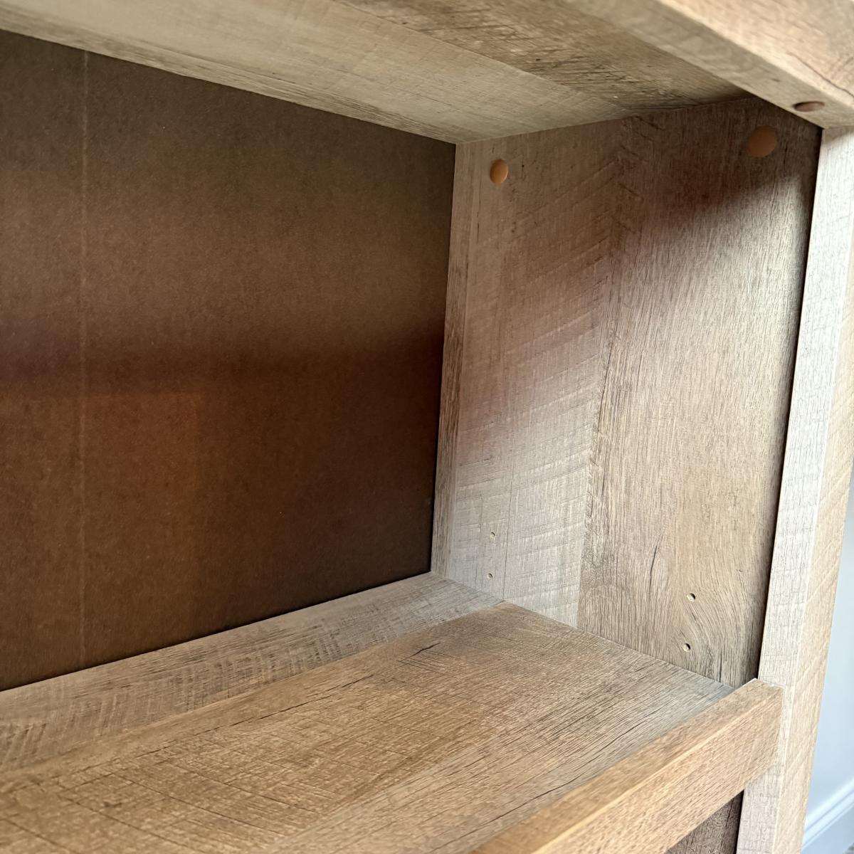 This three-shelf bookcase measures 35.25” x 13.5” x 44”H. It appears to be made of manufactured wood with a tan/gray natural wood finish. Shelves are adjustable. One nail is popping out on the back but looks like it can be hammered right back in.
