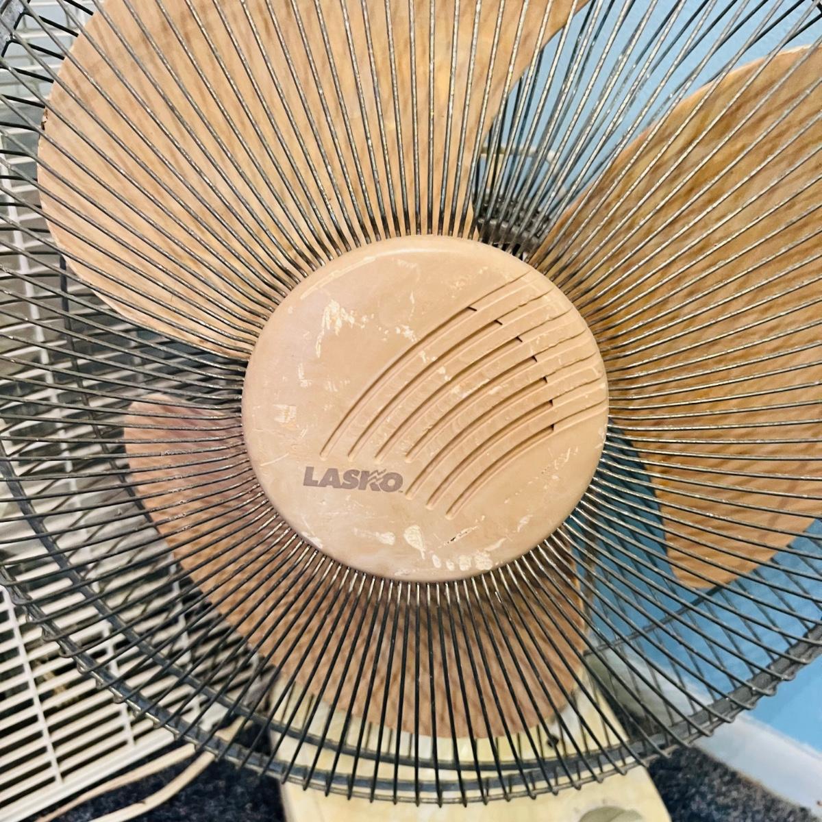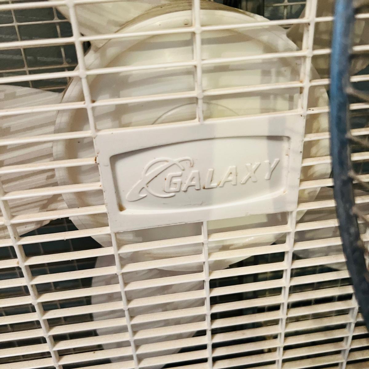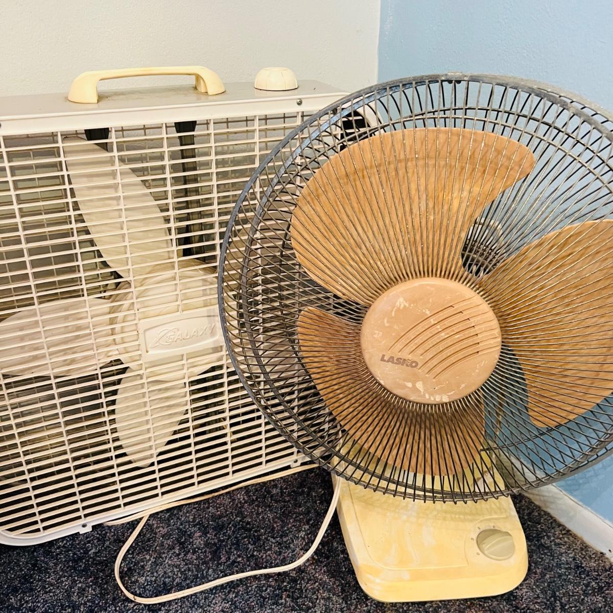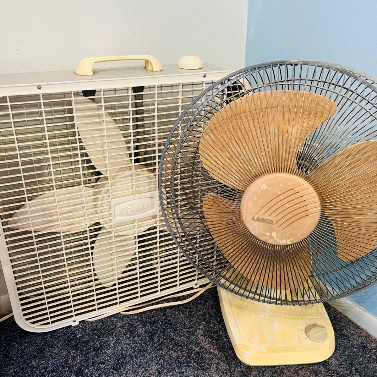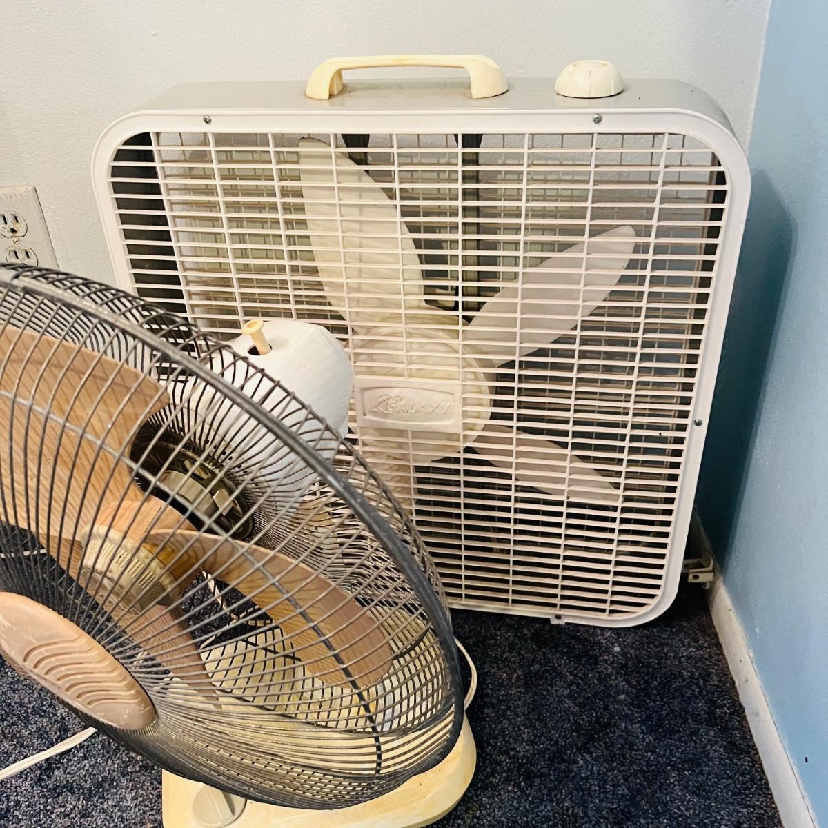 One Gaxy box fan and one Lasko oscillating fan. Both work when plugged in.