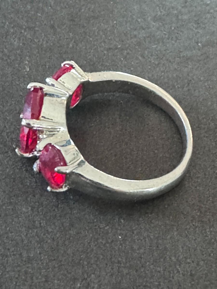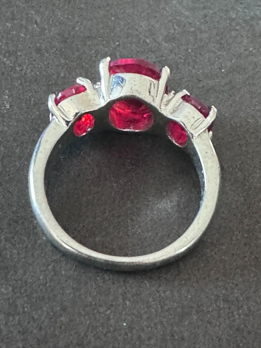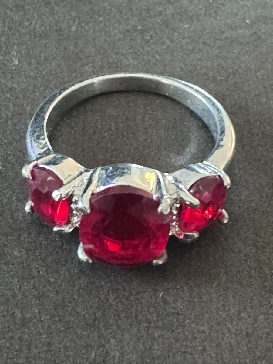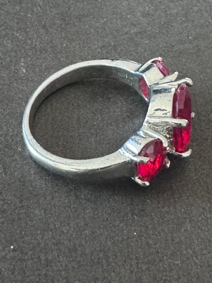 three-stone ring featuring vibrant red gemstones, likely rubies or red rhinestones/cubic zirconia, set in what appears to be a silver-toned metal, possibly sterling silver.
