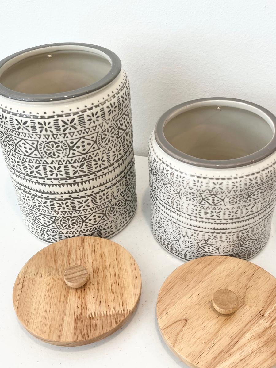 Large canister measures 8.5” H x 5.5” round ~ small canister measures 6” H x 5.5” round ~ utensil measures 6” H x 5.5” round ~ utensils included ~ lids are wood
