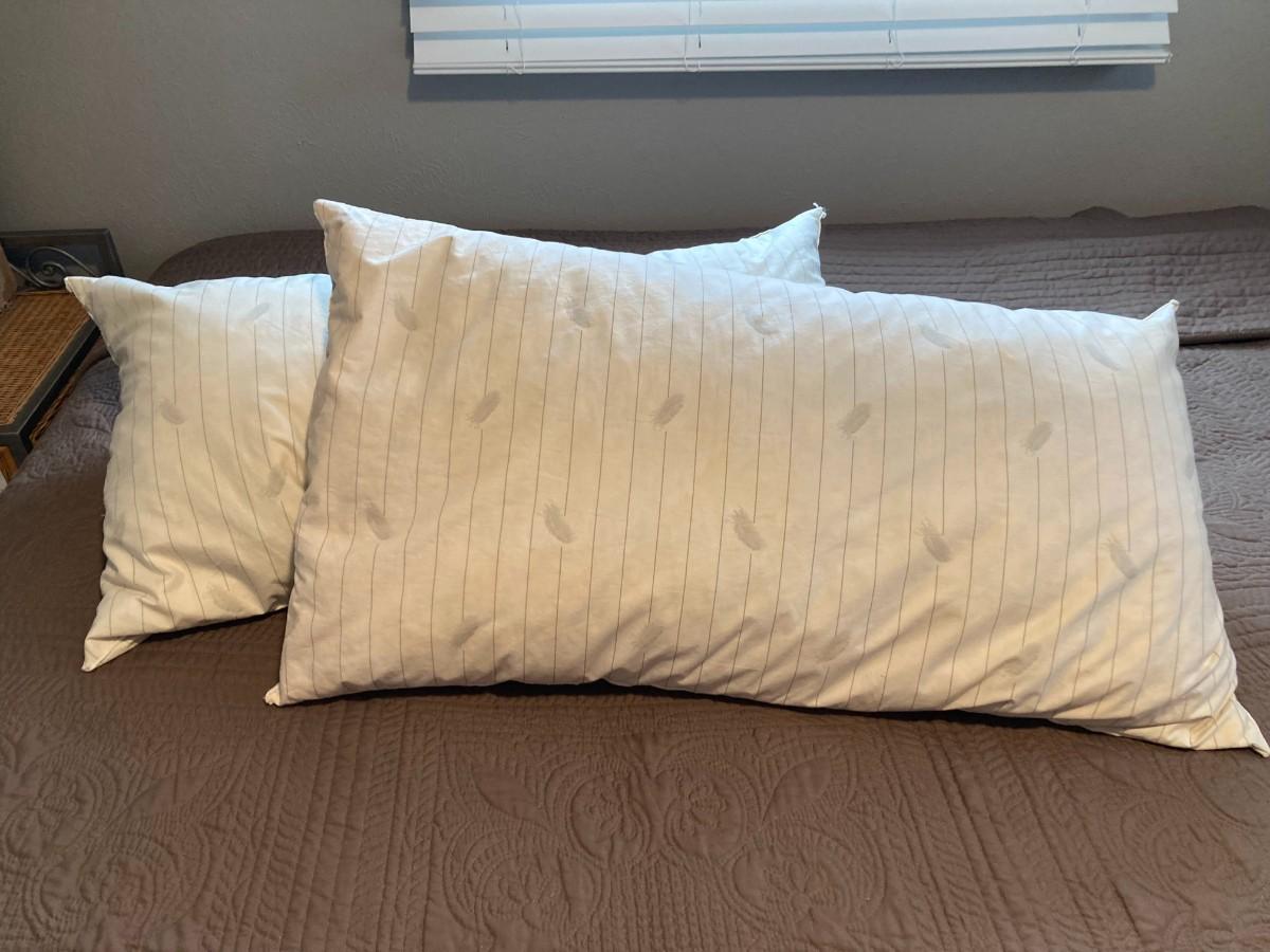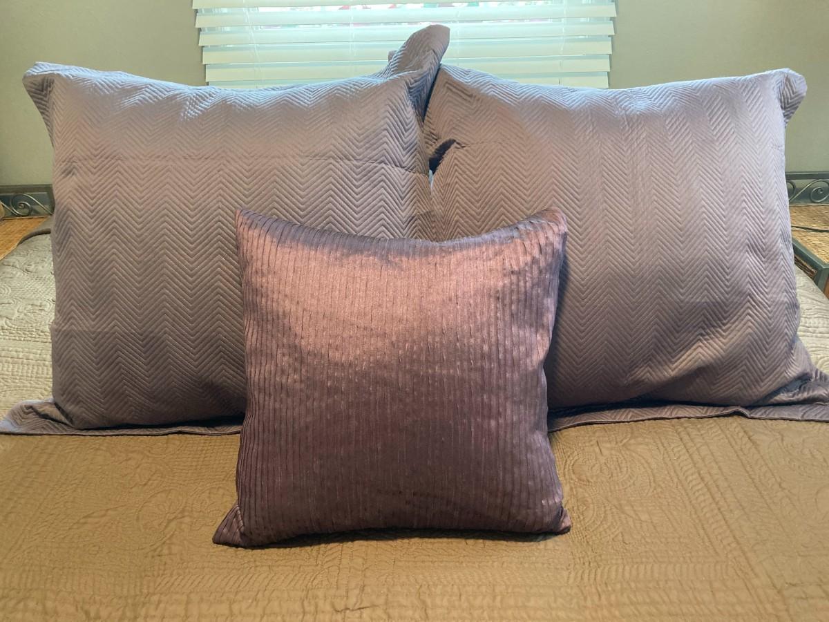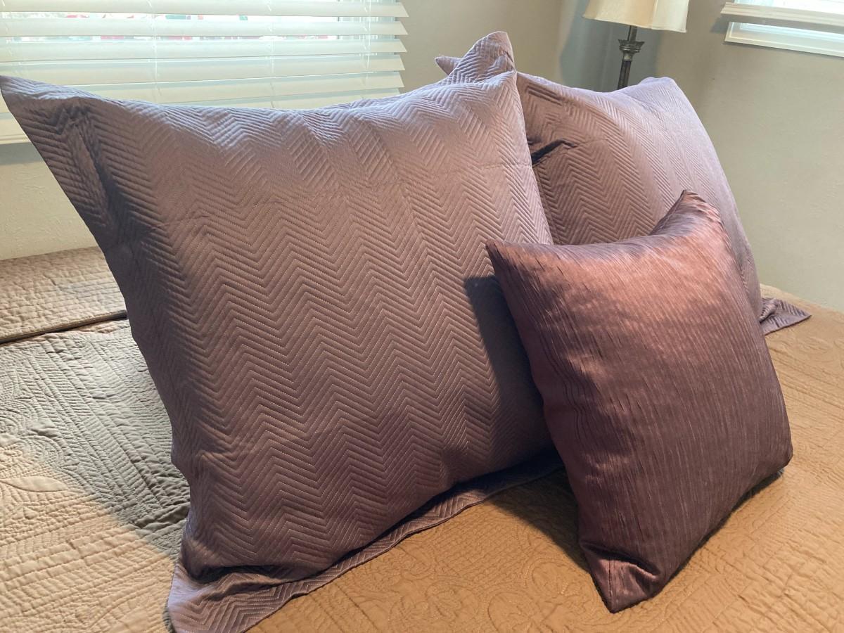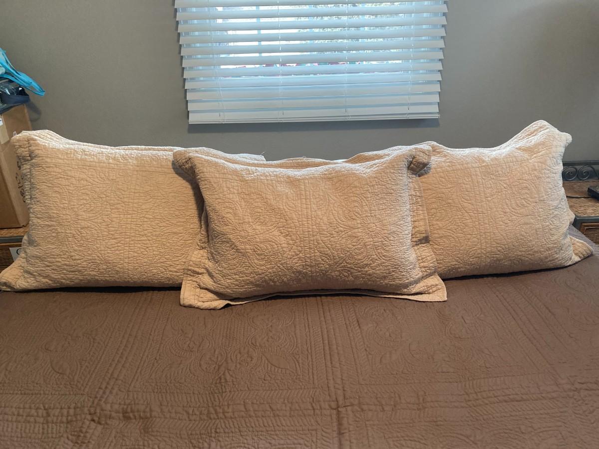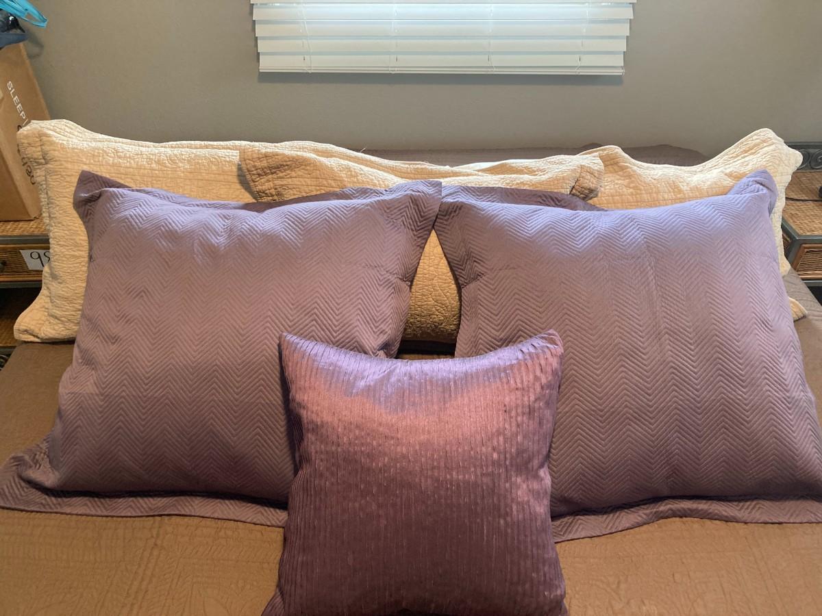 .3 TAN KING SHAMS WITH PILLOWS. TWO 28" X 28" AND ONE 18" X 18" PURPLE PILLOW