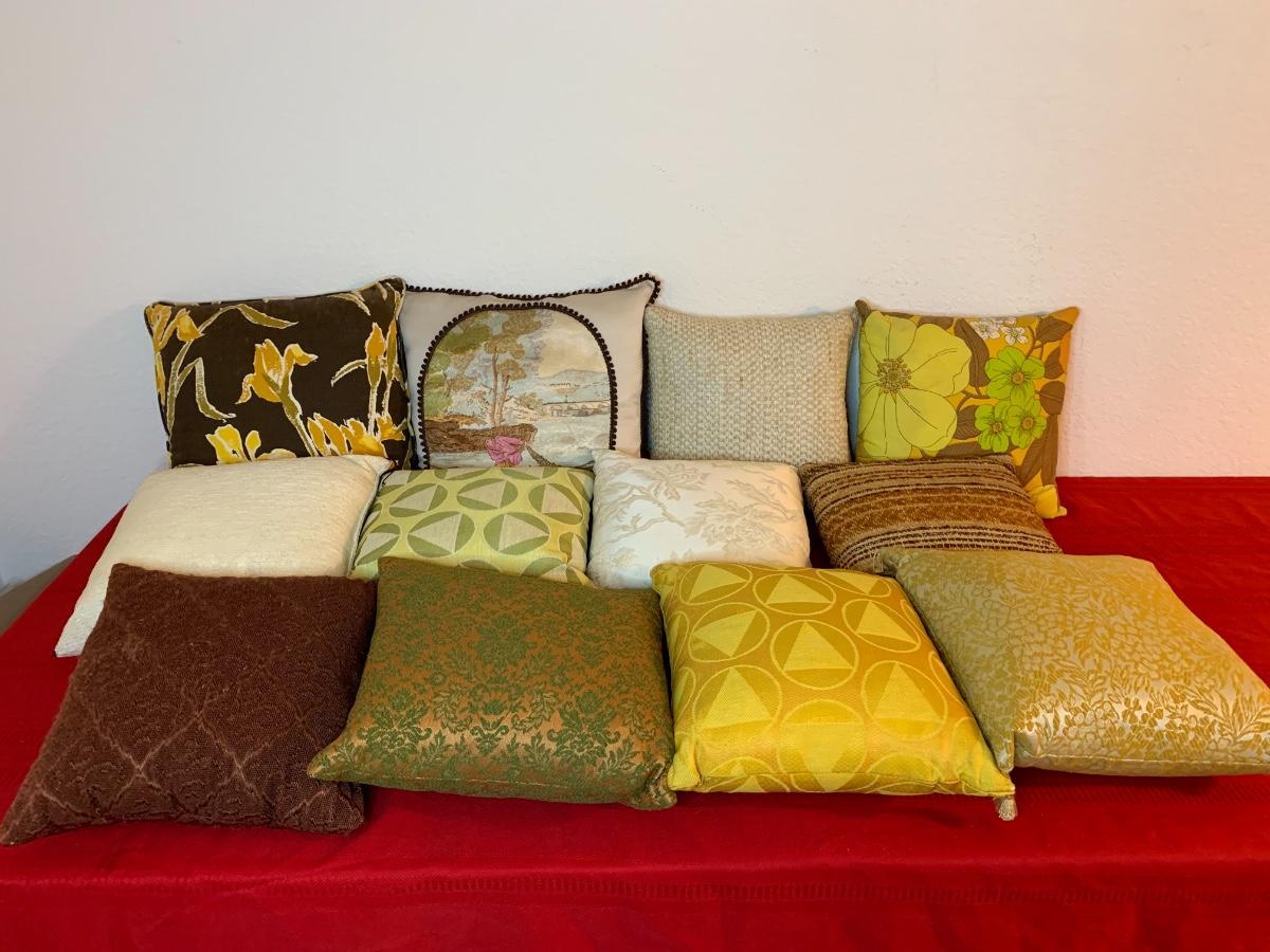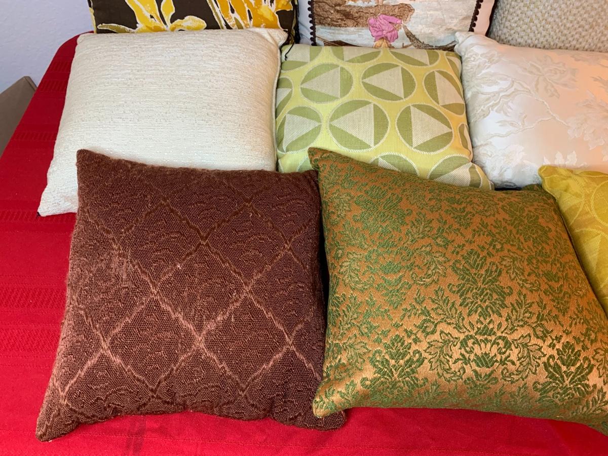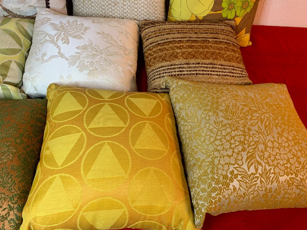 12 small throw pillows, various patterns and fabrics, some are missing corner tassels and a few have worn