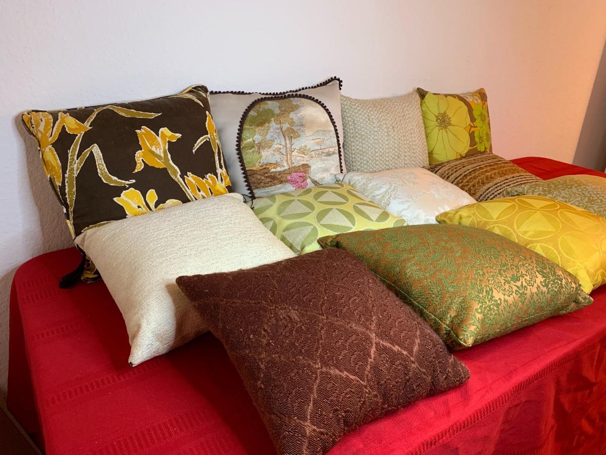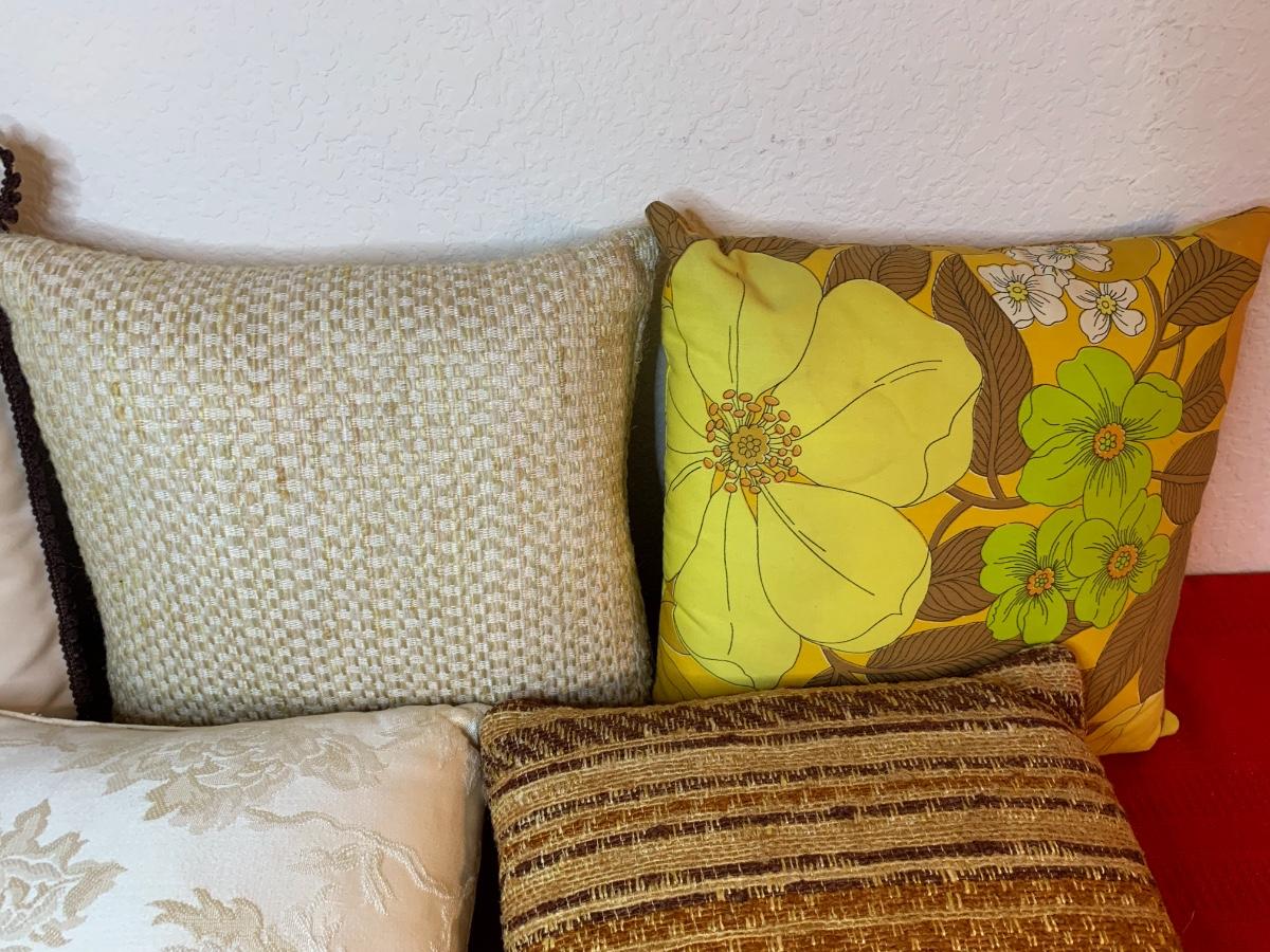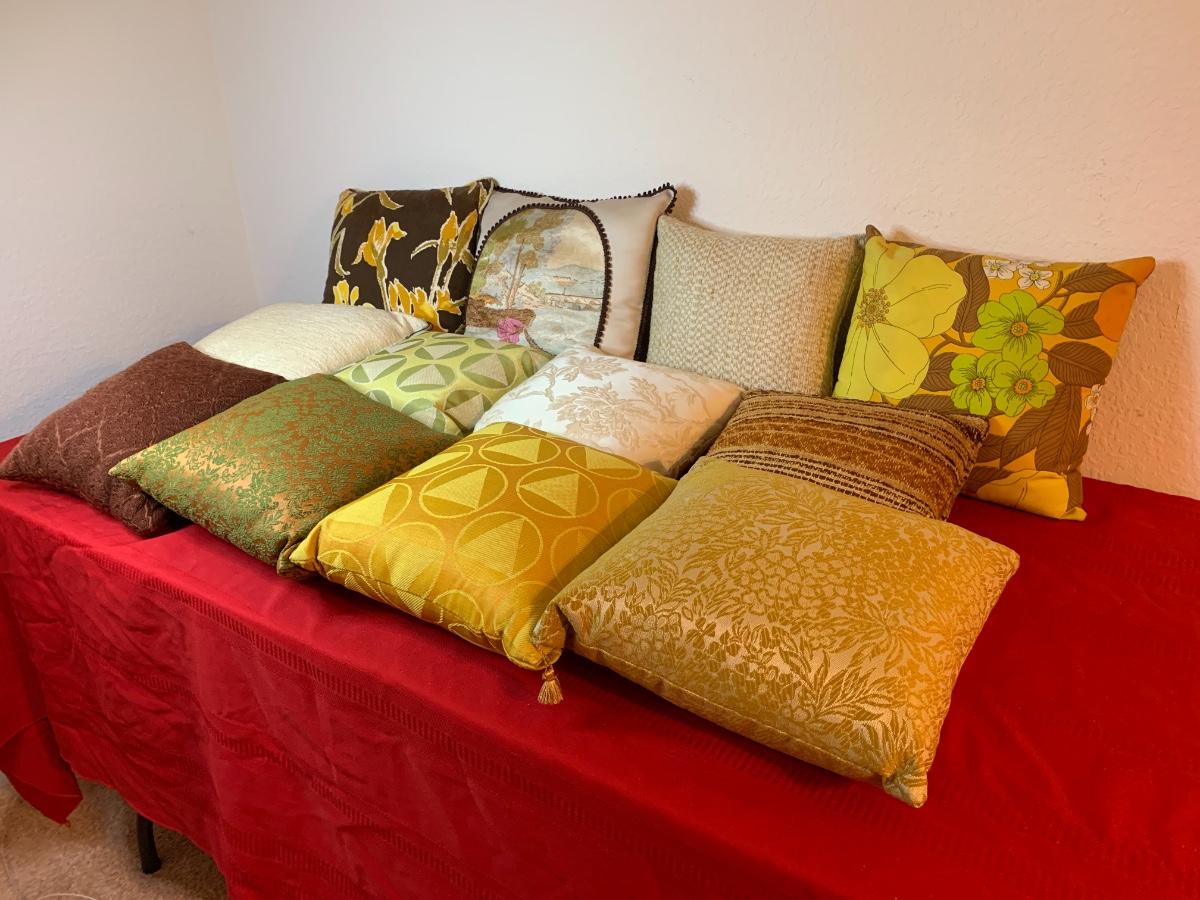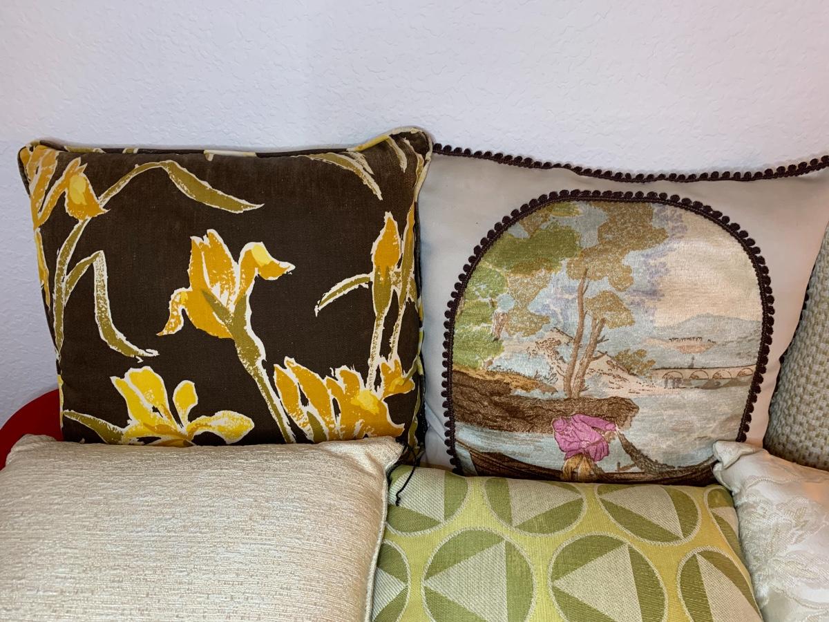12 small throw pillows, various patterns and fabrics, some are missing corner tassels and a few have worn