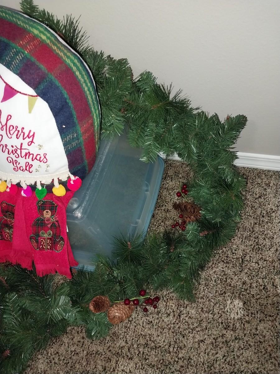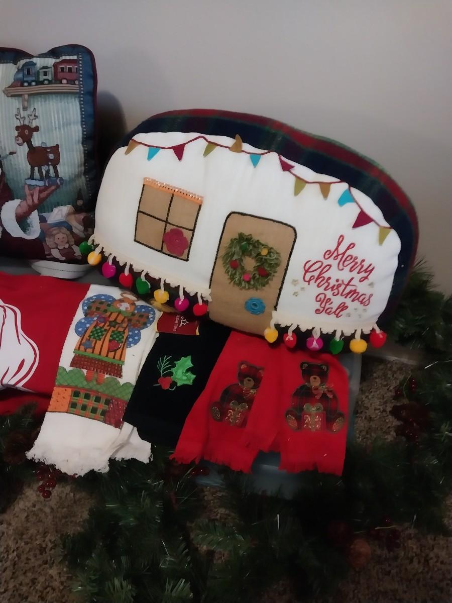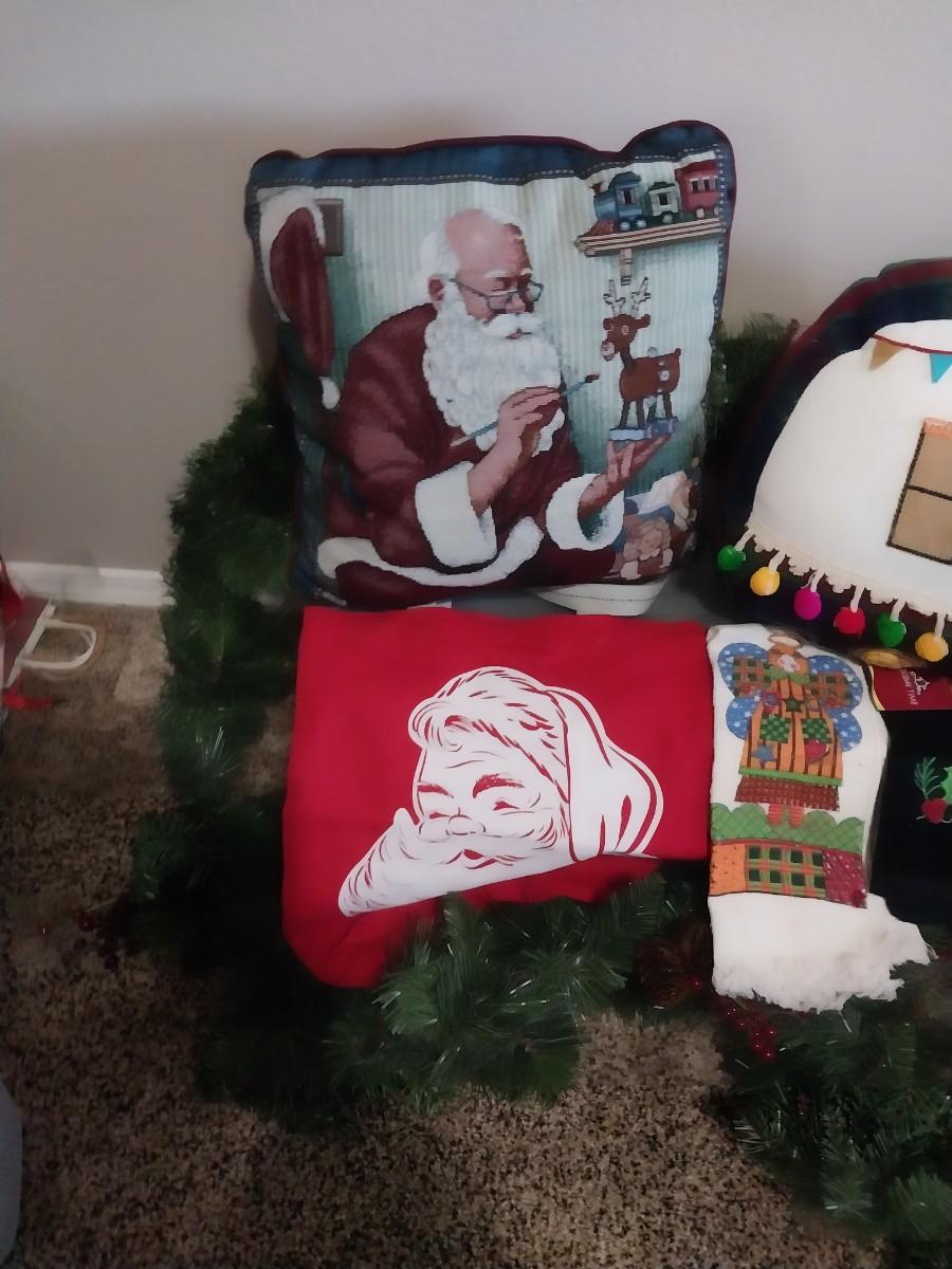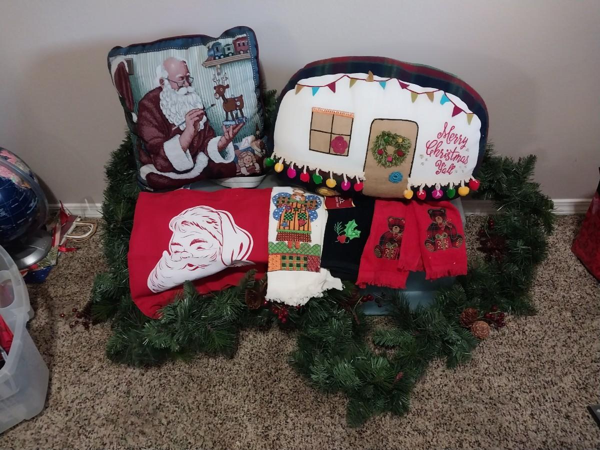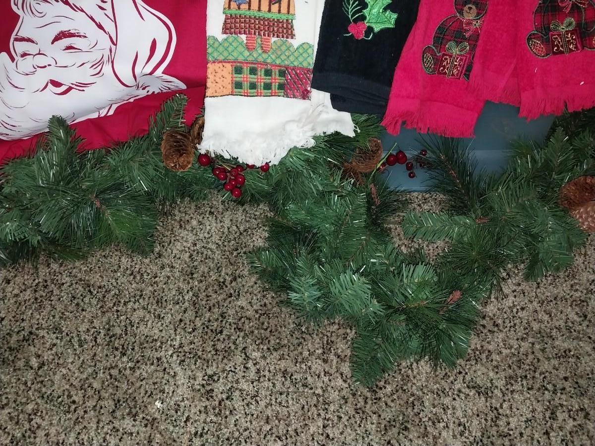 THROW PILLOWS, TEA TOWELS, FAUX EVERGREEN GARLAND
