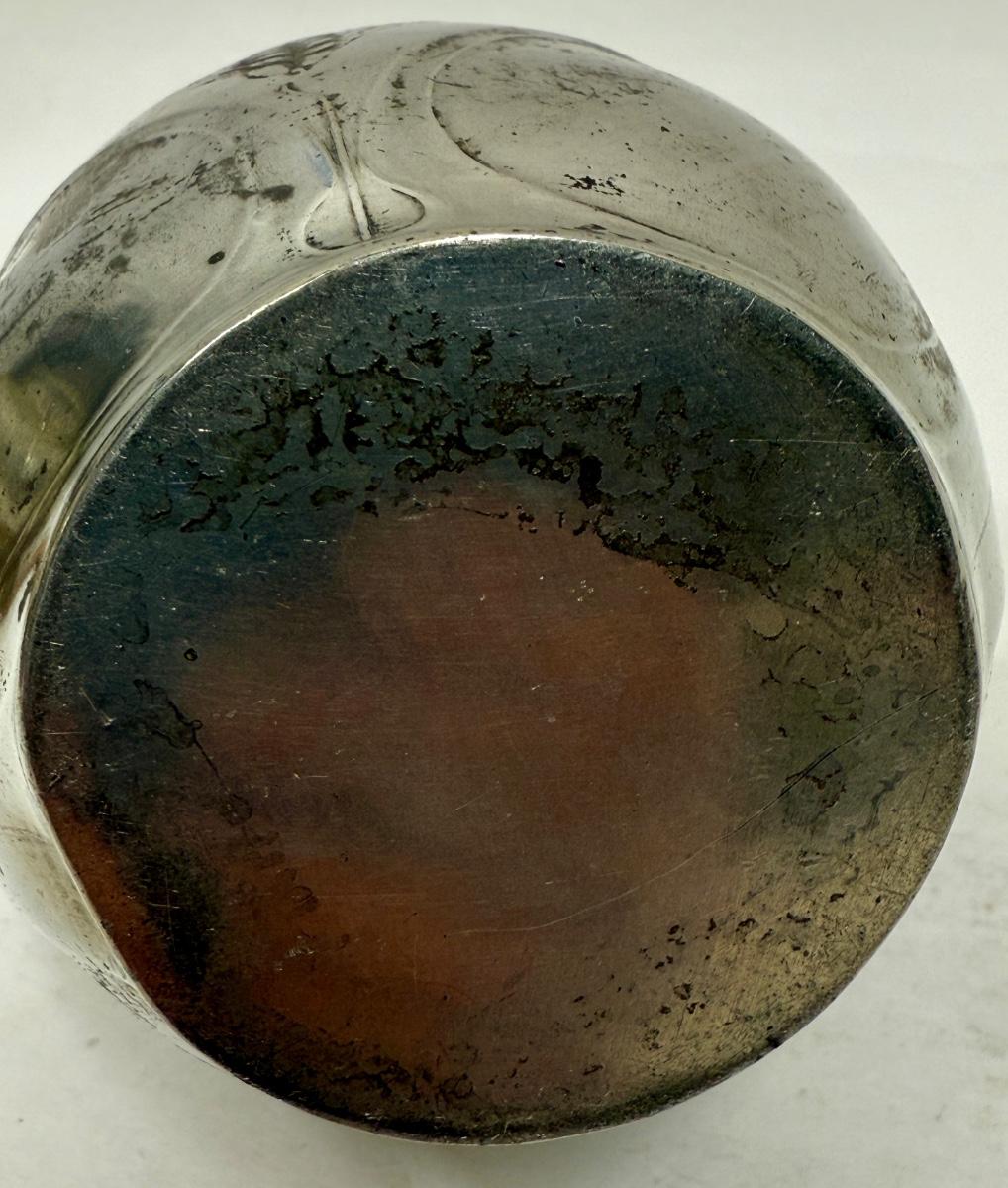 Appears to be plated tin. Most of the plating is gone from the upper half of the teapot. Item is otherwise in good condition, no dents, gouges or scratches. Approx. 7.75" tall.