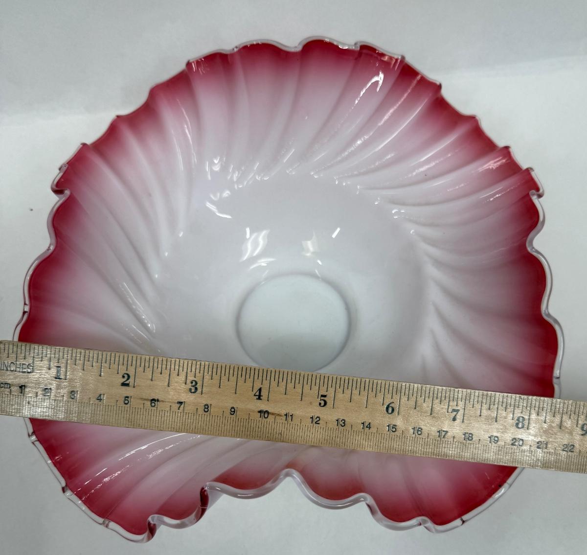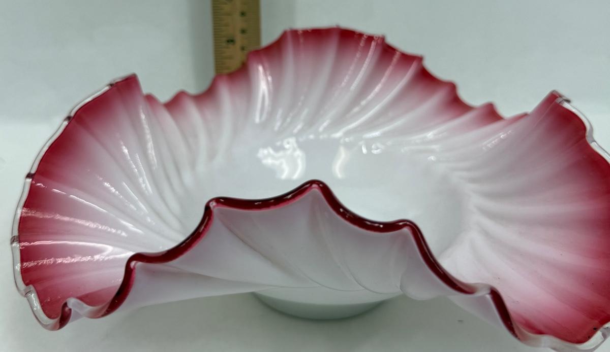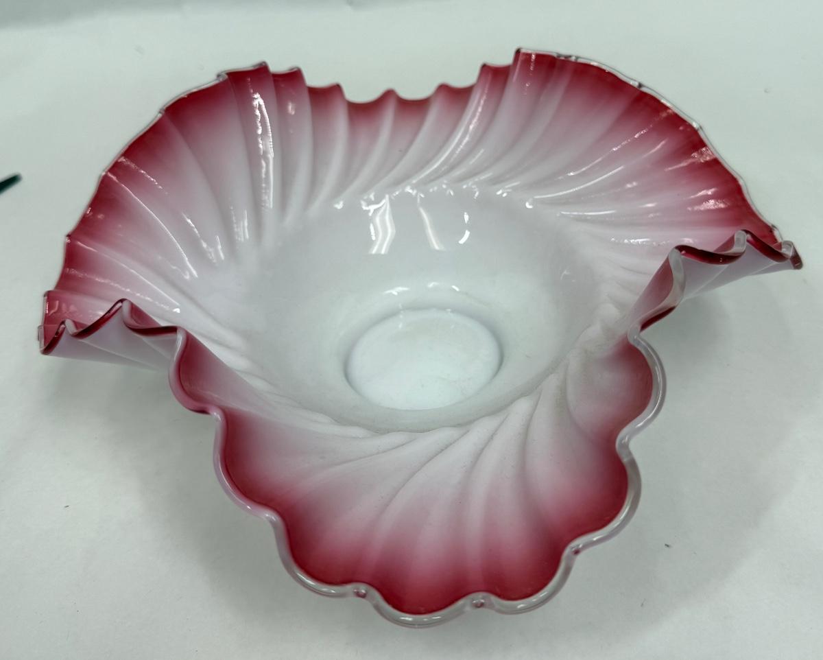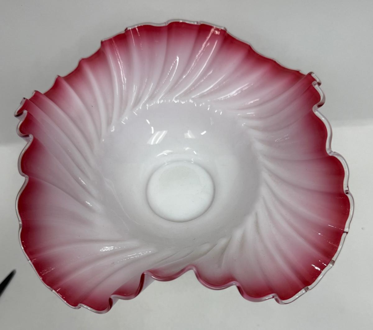 Antique Victorian Ruffled Glass Bride's Basket Footed Pink and White Ruffled Bowl