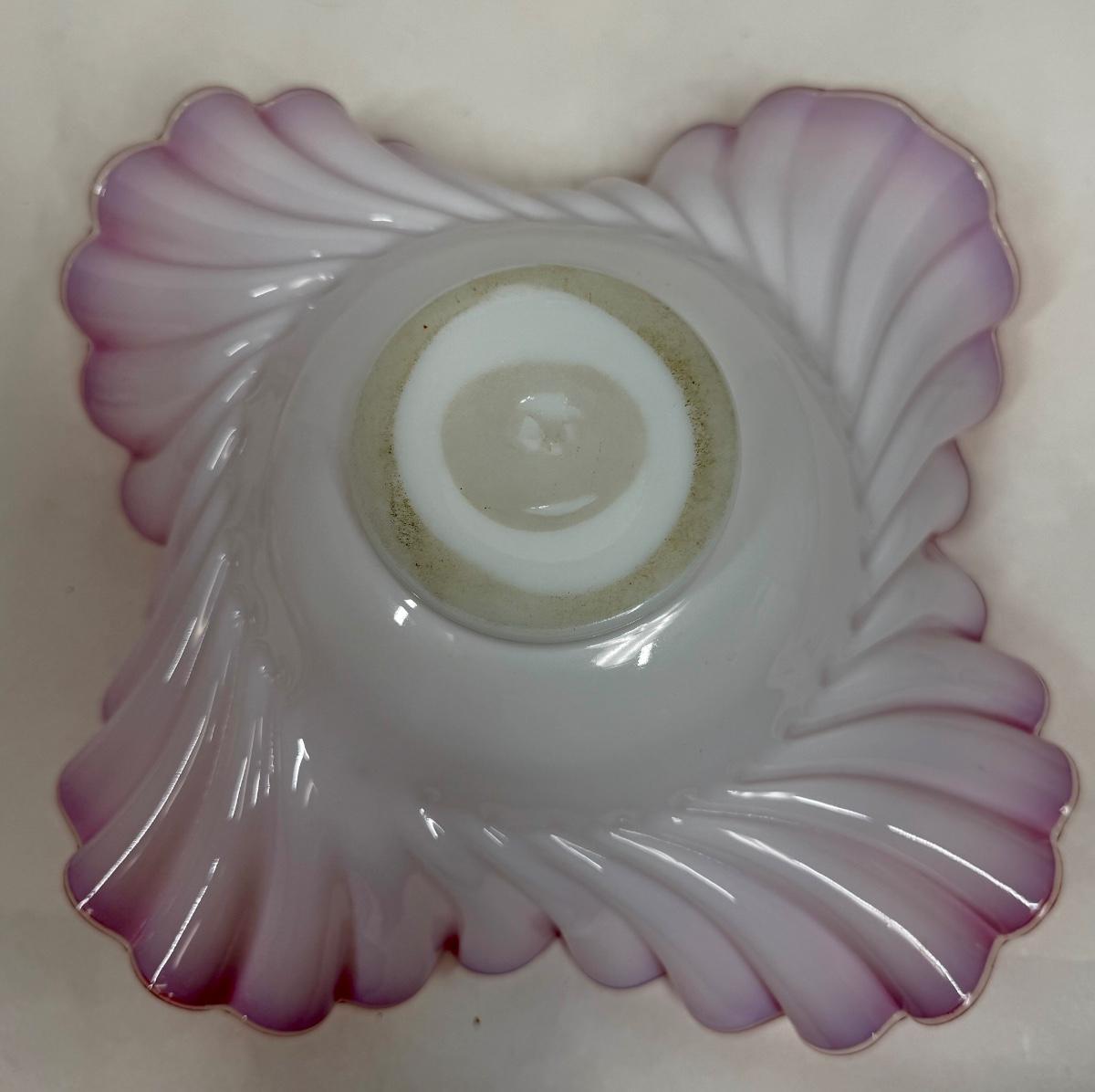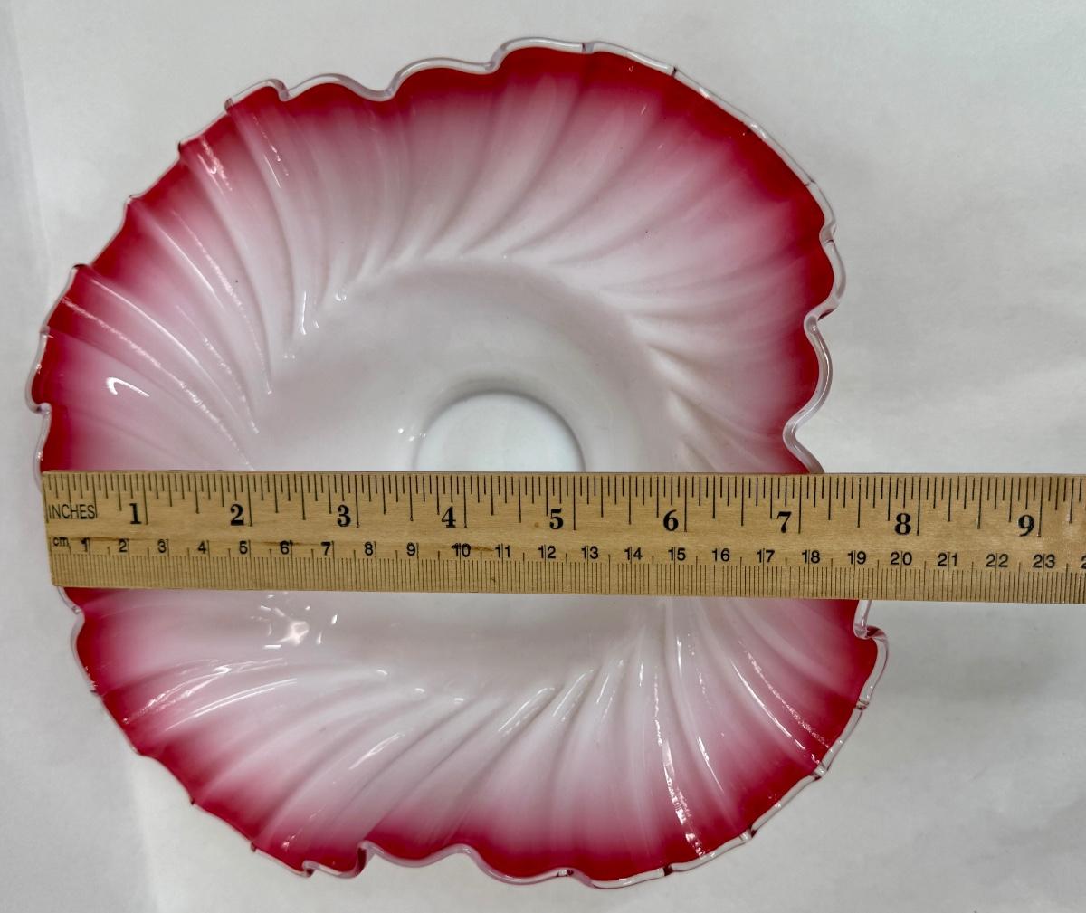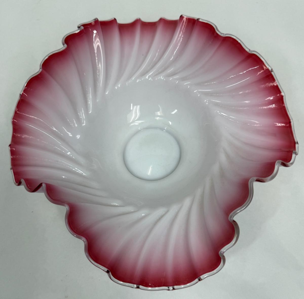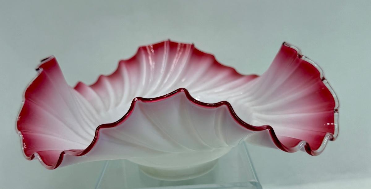 Antique Victorian Ruffled Glass Bride's Basket Footed Pink and White Ruffled Bowl