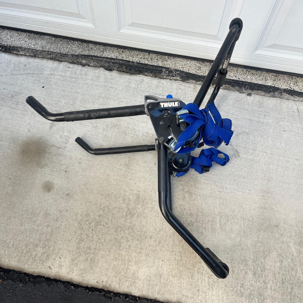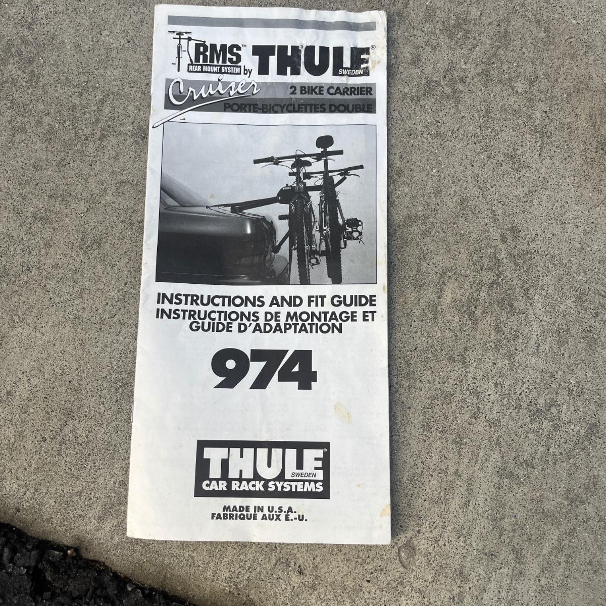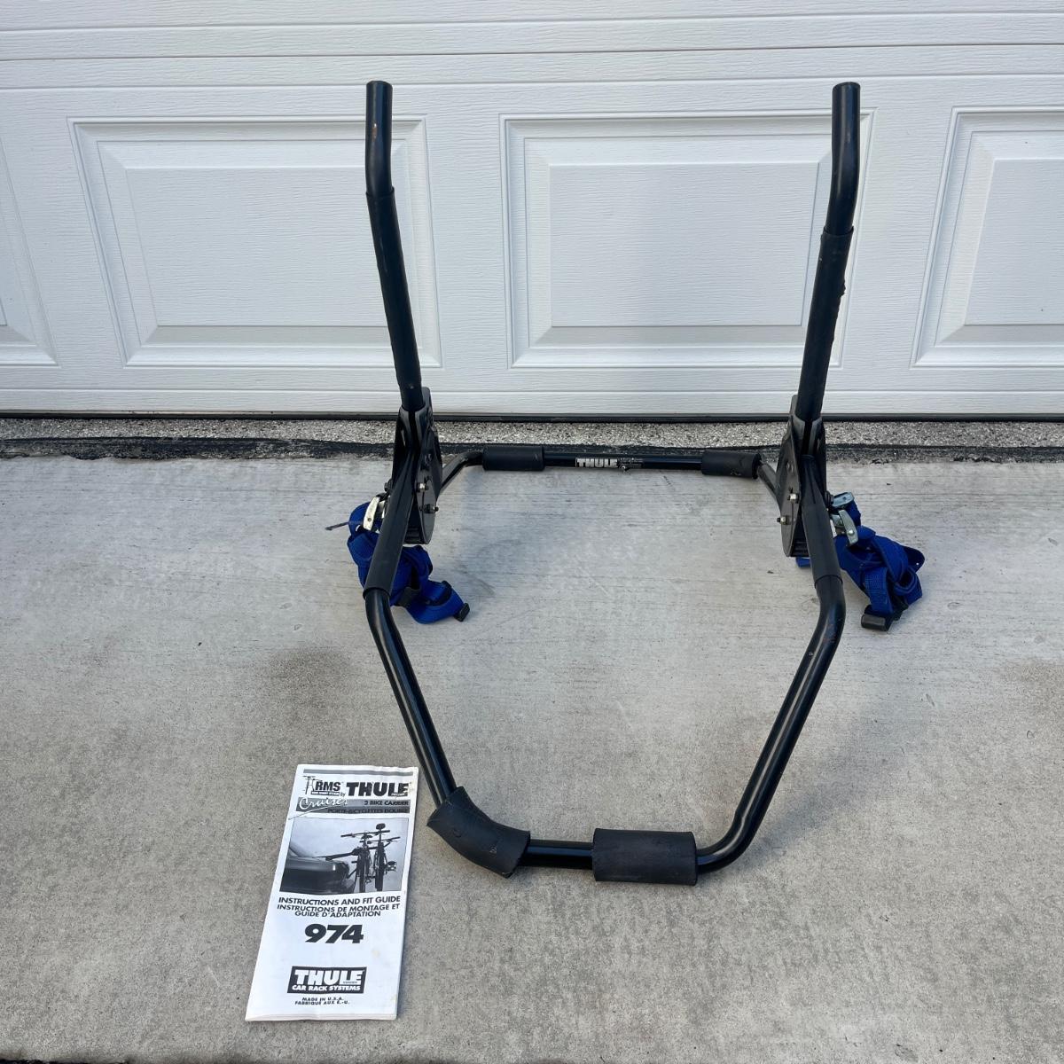 Lot includes a Thule two bike carrier. Carrier measures 19” x 25” x 29”H. Carrier has scratches and nicks, see pictures. Also includes Owners manual.