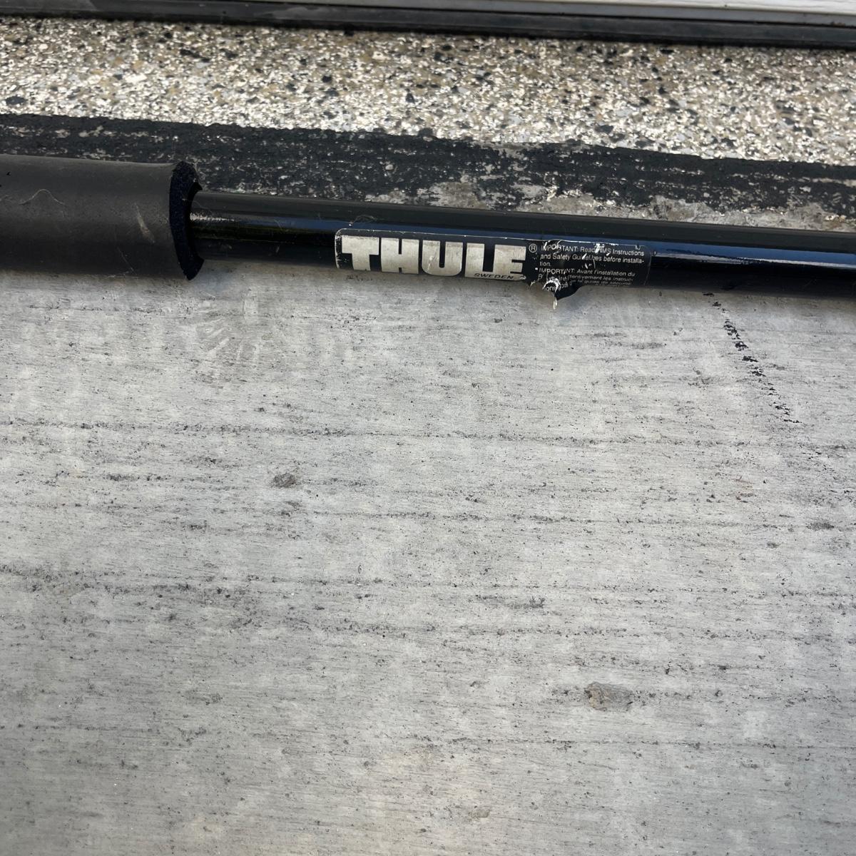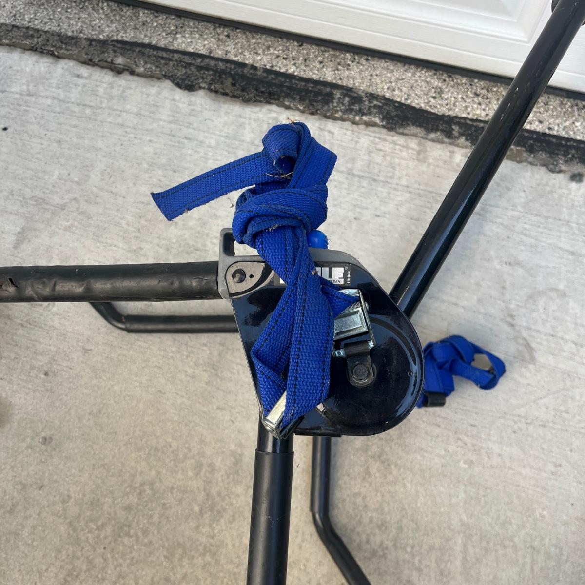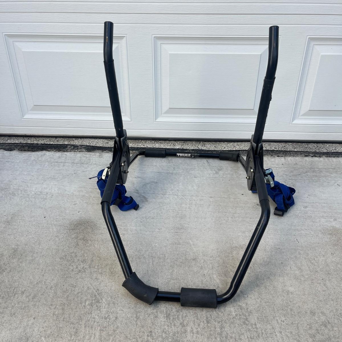 Lot includes a Thule two bike carrier. Carrier measures 19” x 25” x 29”H. Carrier has scratches and nicks, see pictures. Also includes Owners manual.