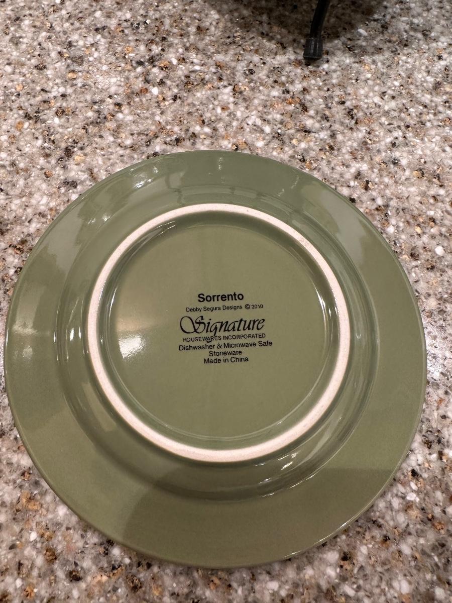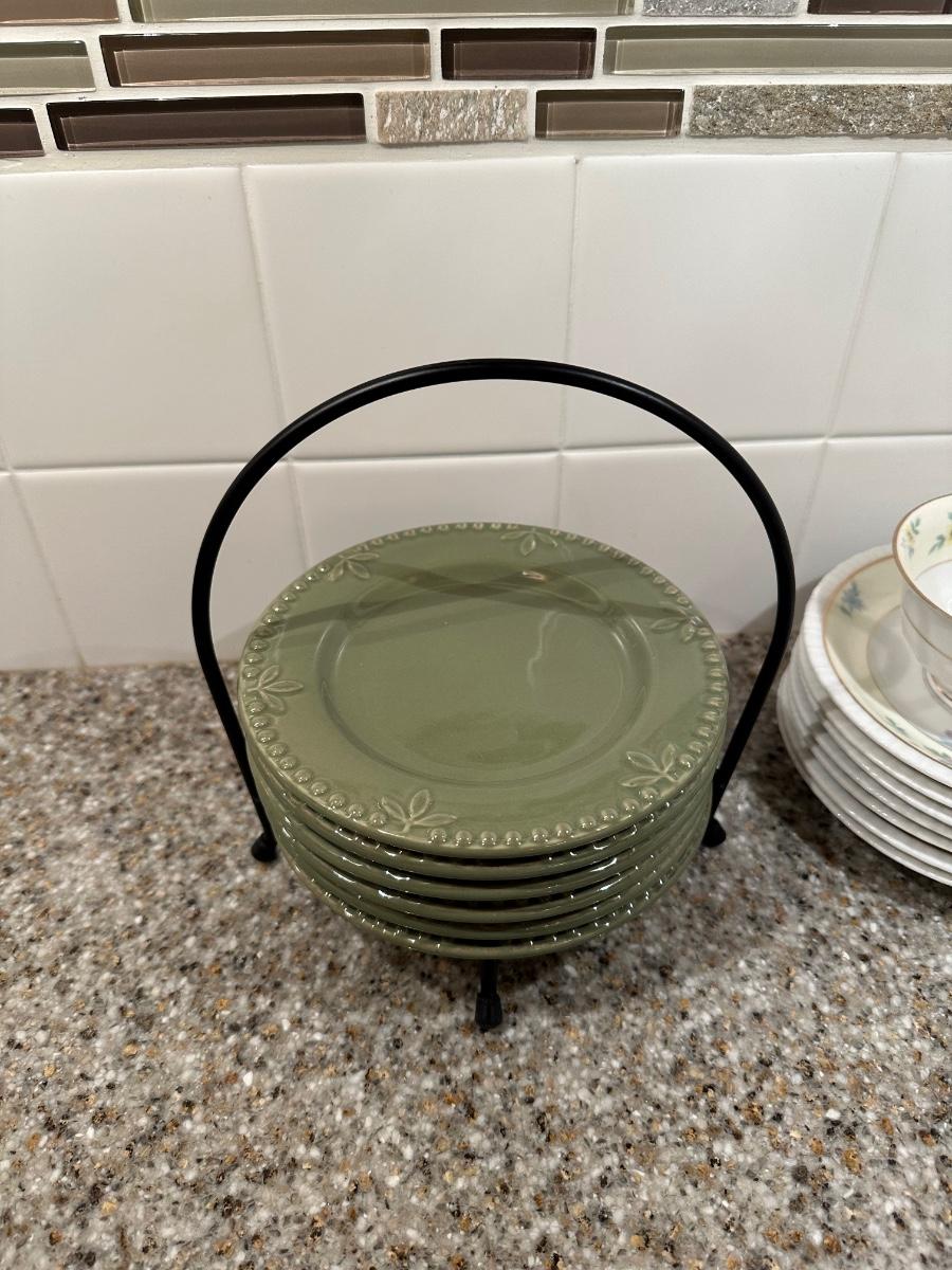 ALSO 6 SORRENTO STONEWARE PLATES IN AN IRON HOLDER
