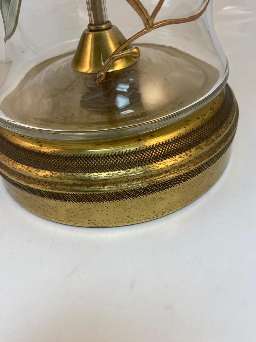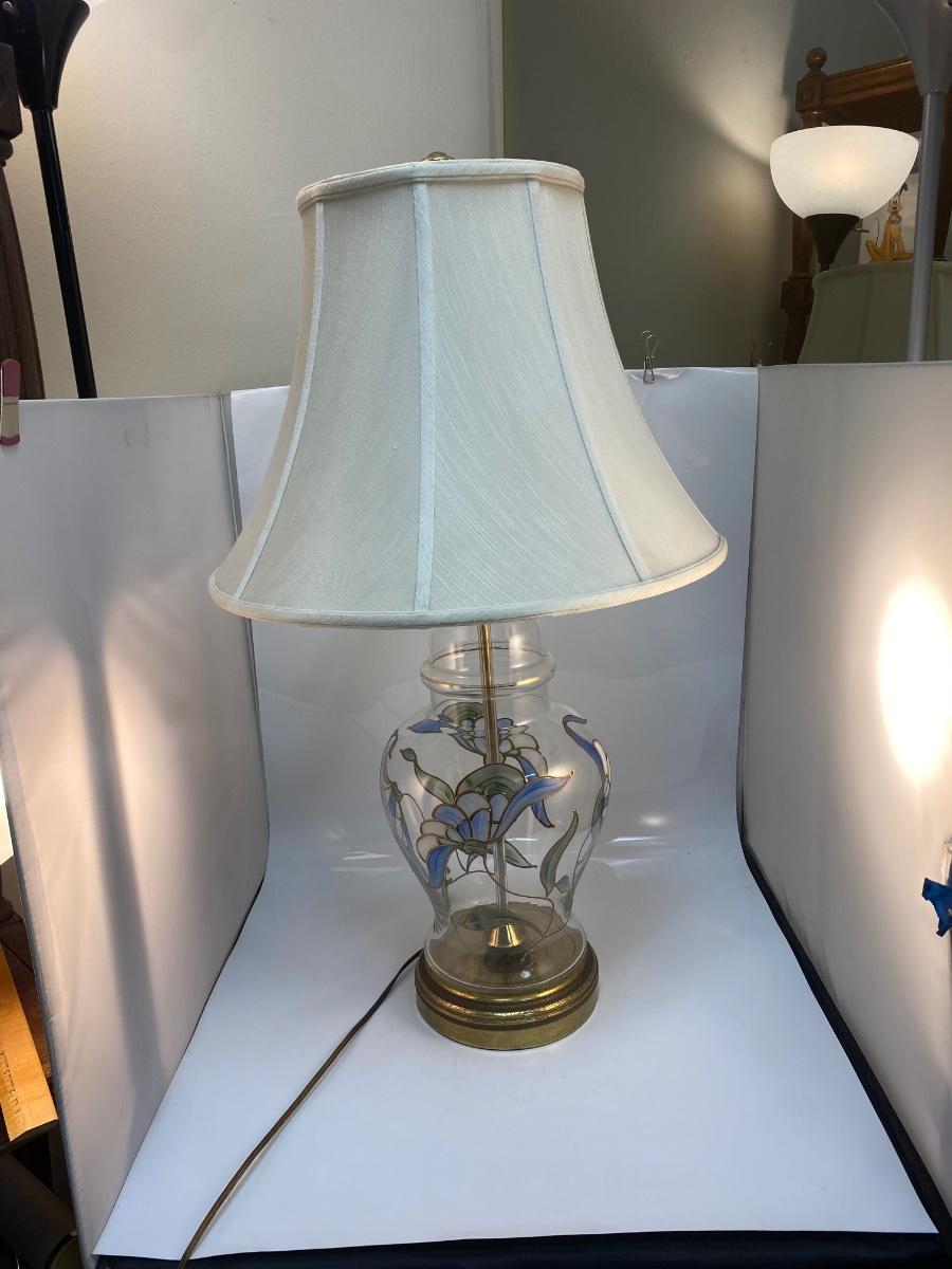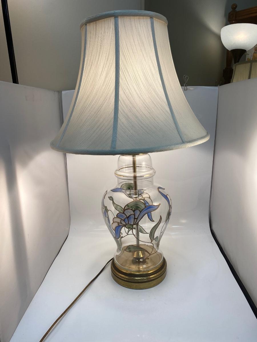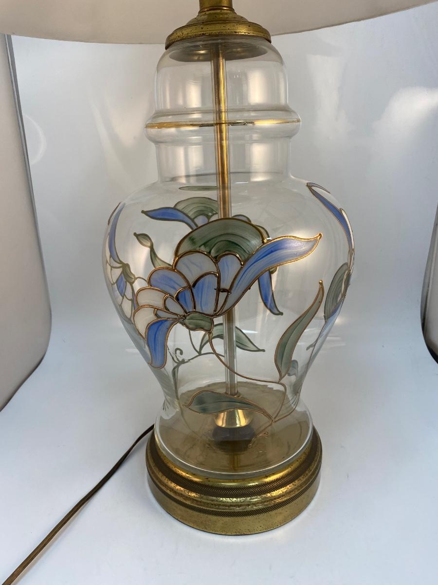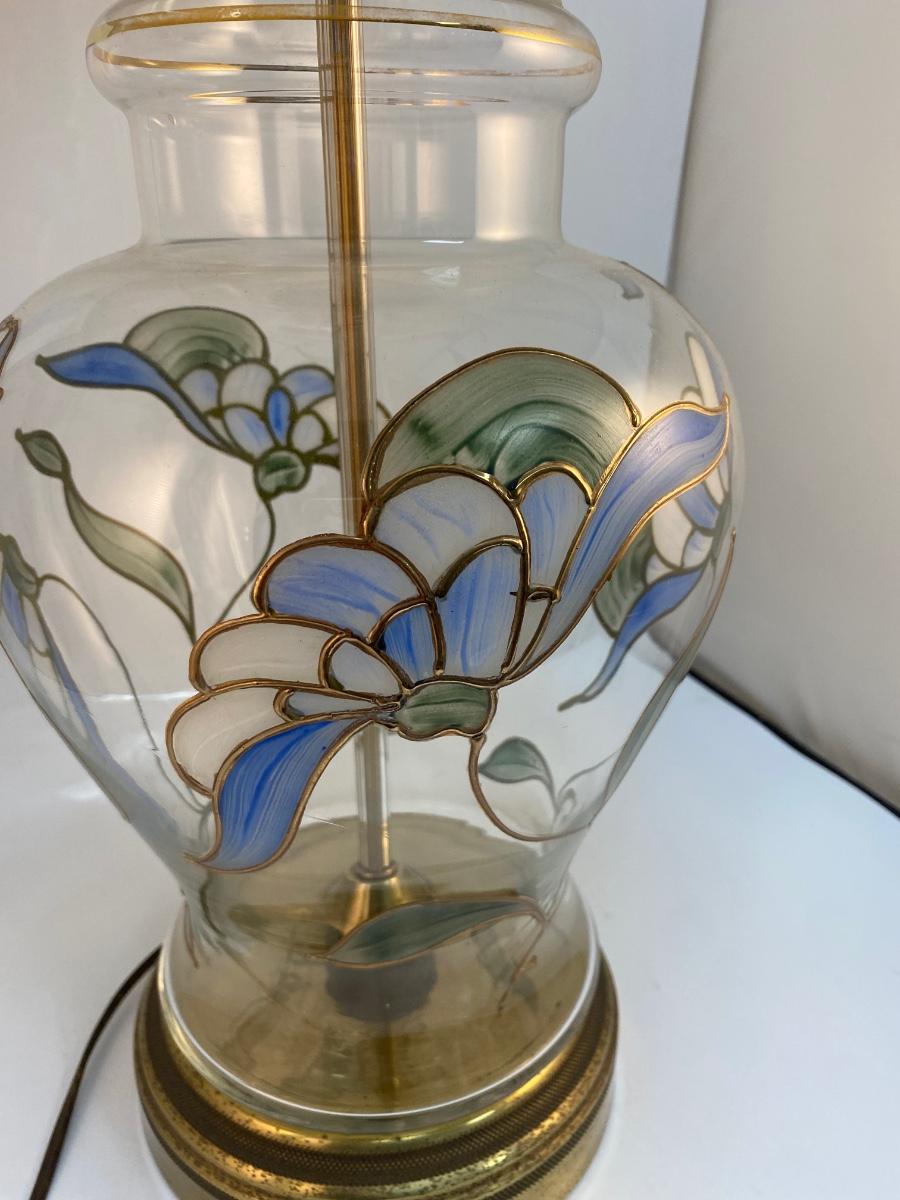Vintage Glass Table Lamp with Painted Floral Design. In good condition. A little wear to the brass base from age and use. Comes with shade. Works. About 30" tall.