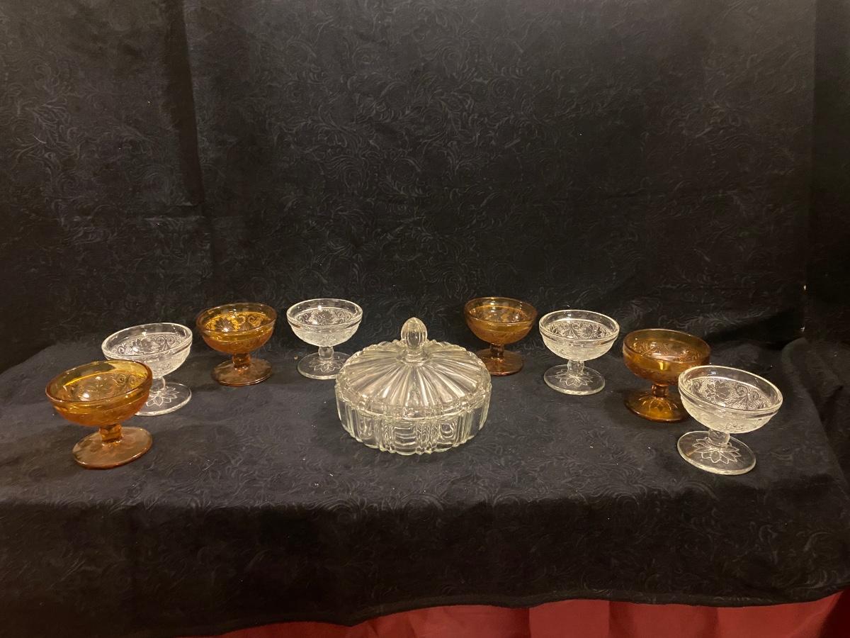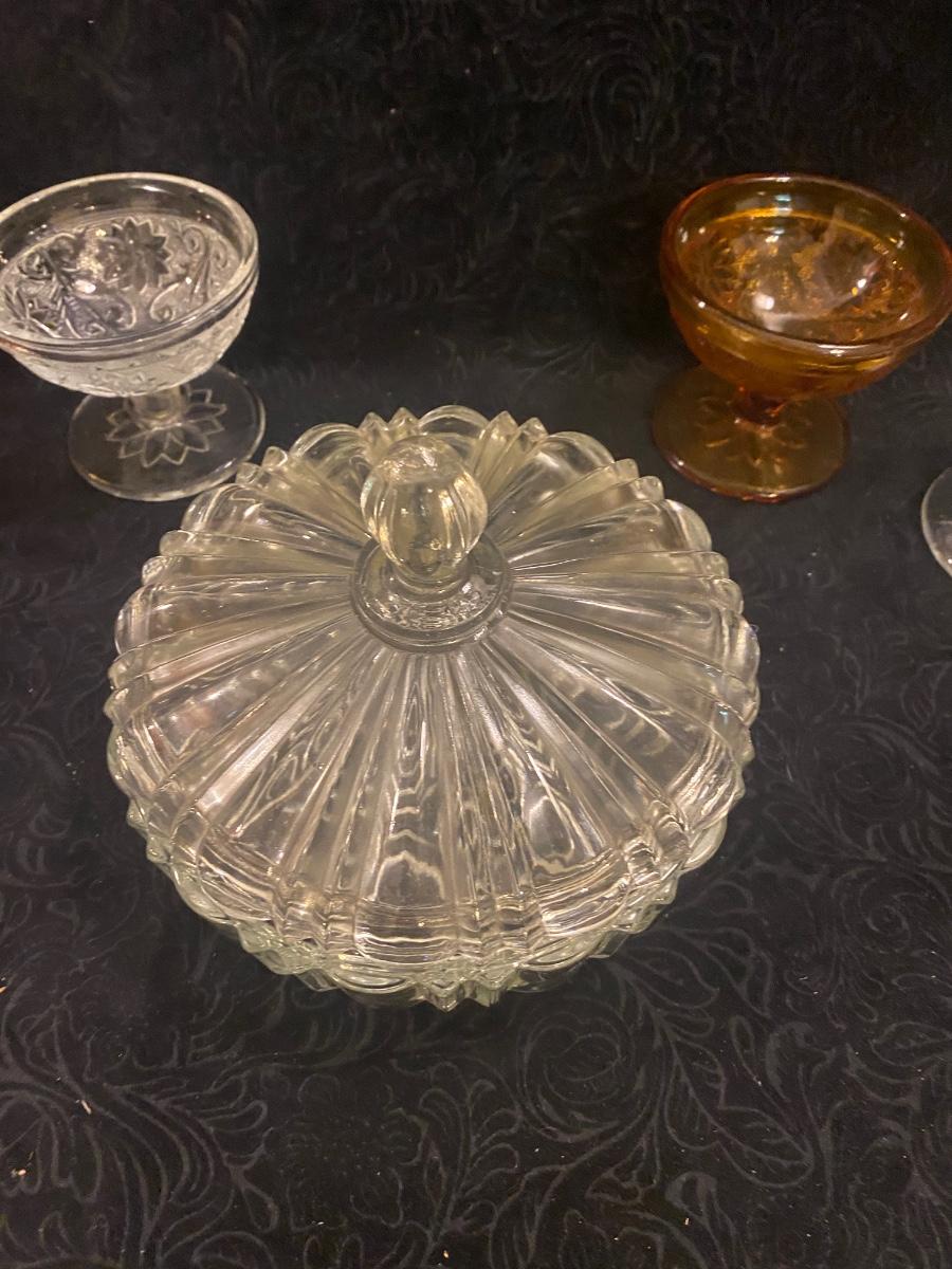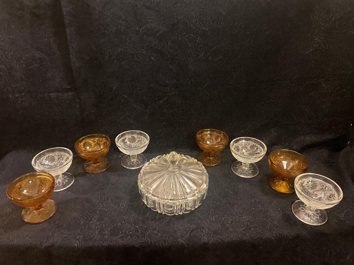 TIARA GLASS SORBET CUPS AND COVERED CANDY DISH